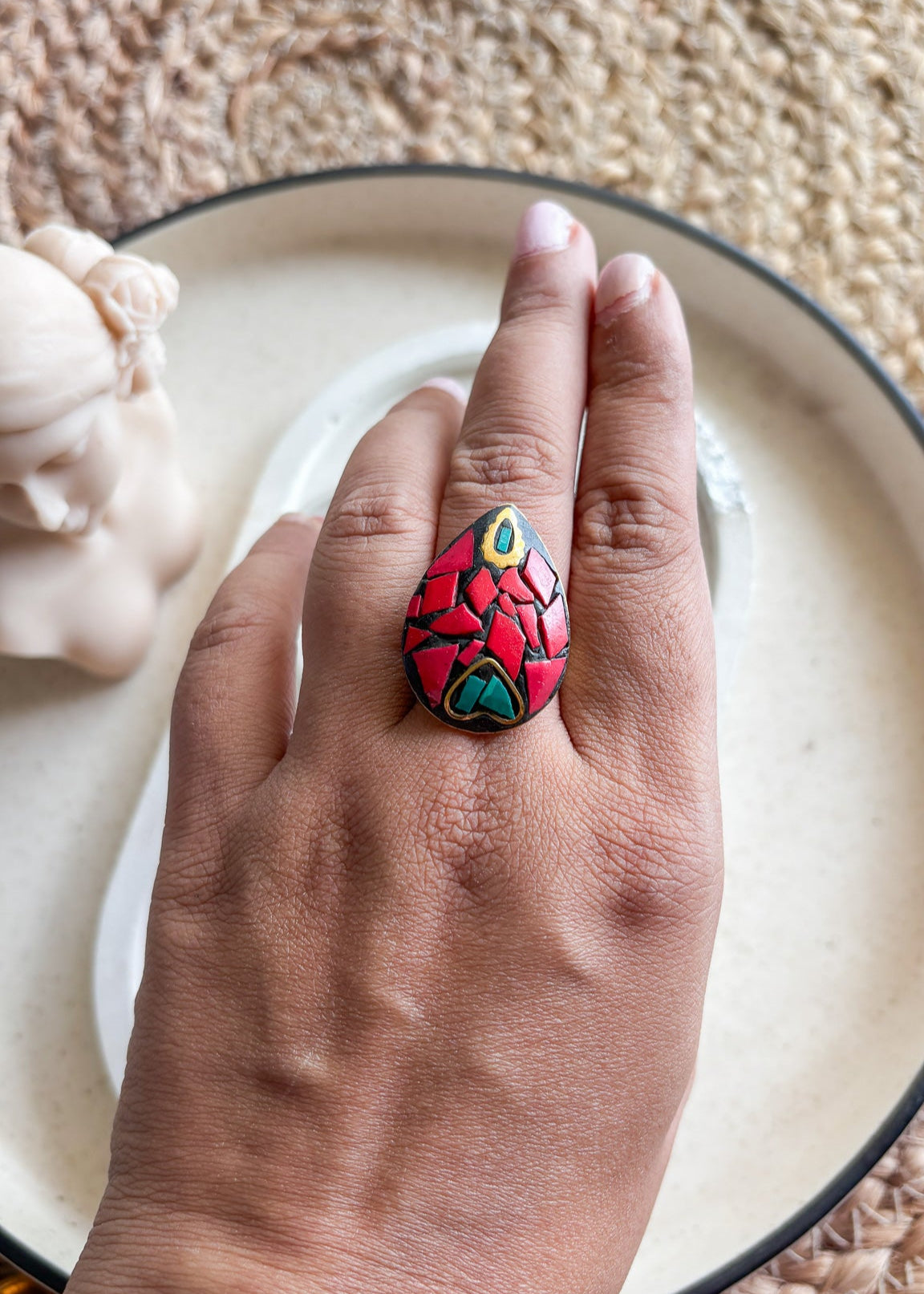 Elevate your ensemble with the Amrit Ring, distinguished by its elegant raindrop shape and vibrant multicolor Afghani design. This artisanal piece highlights intricate craftsmanship, featuring rich hues arranged in a traditional pattern that exudes cultural sophistication. Perfect for those who appreciate refined ethnic accessories with lasting appeal.