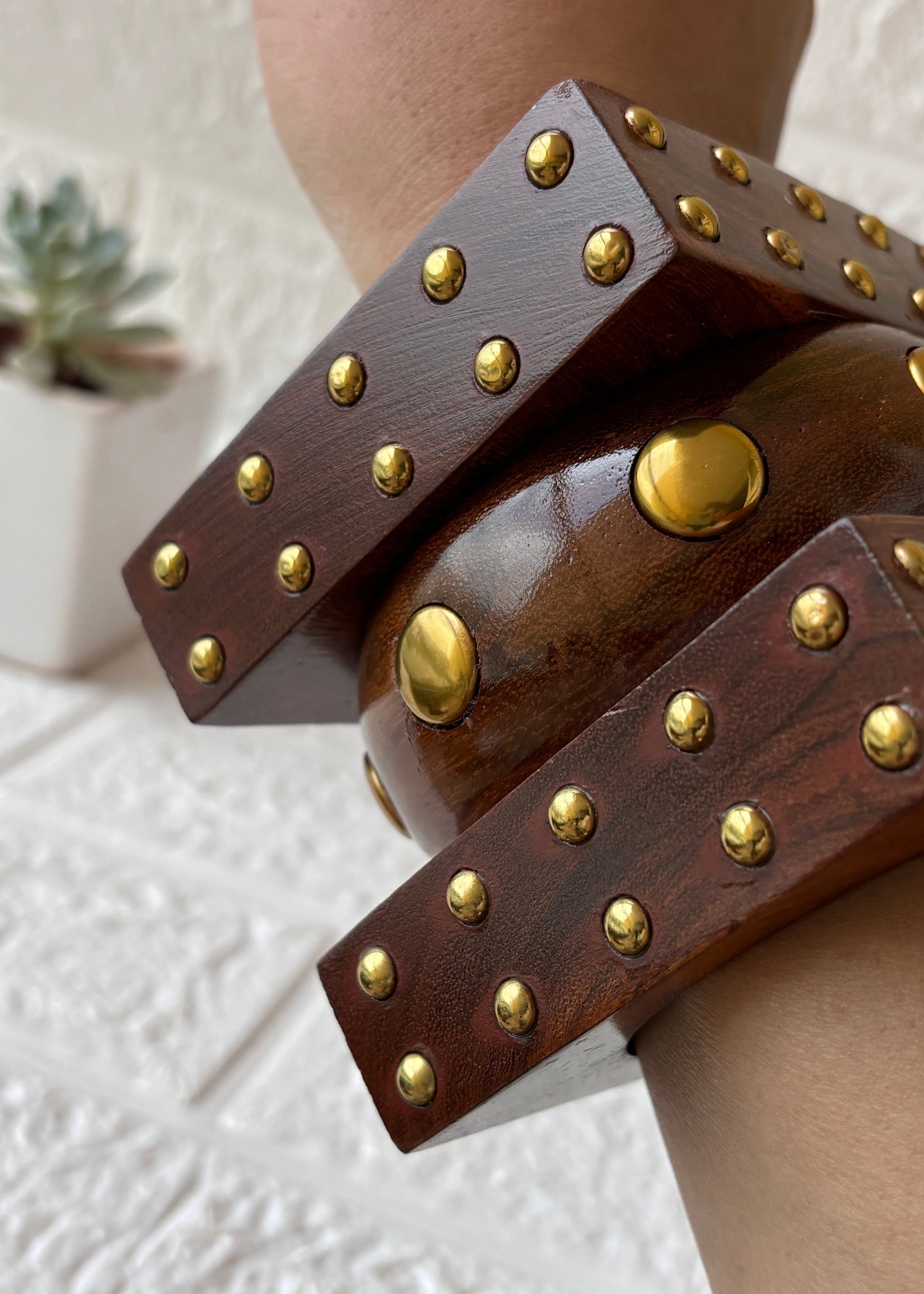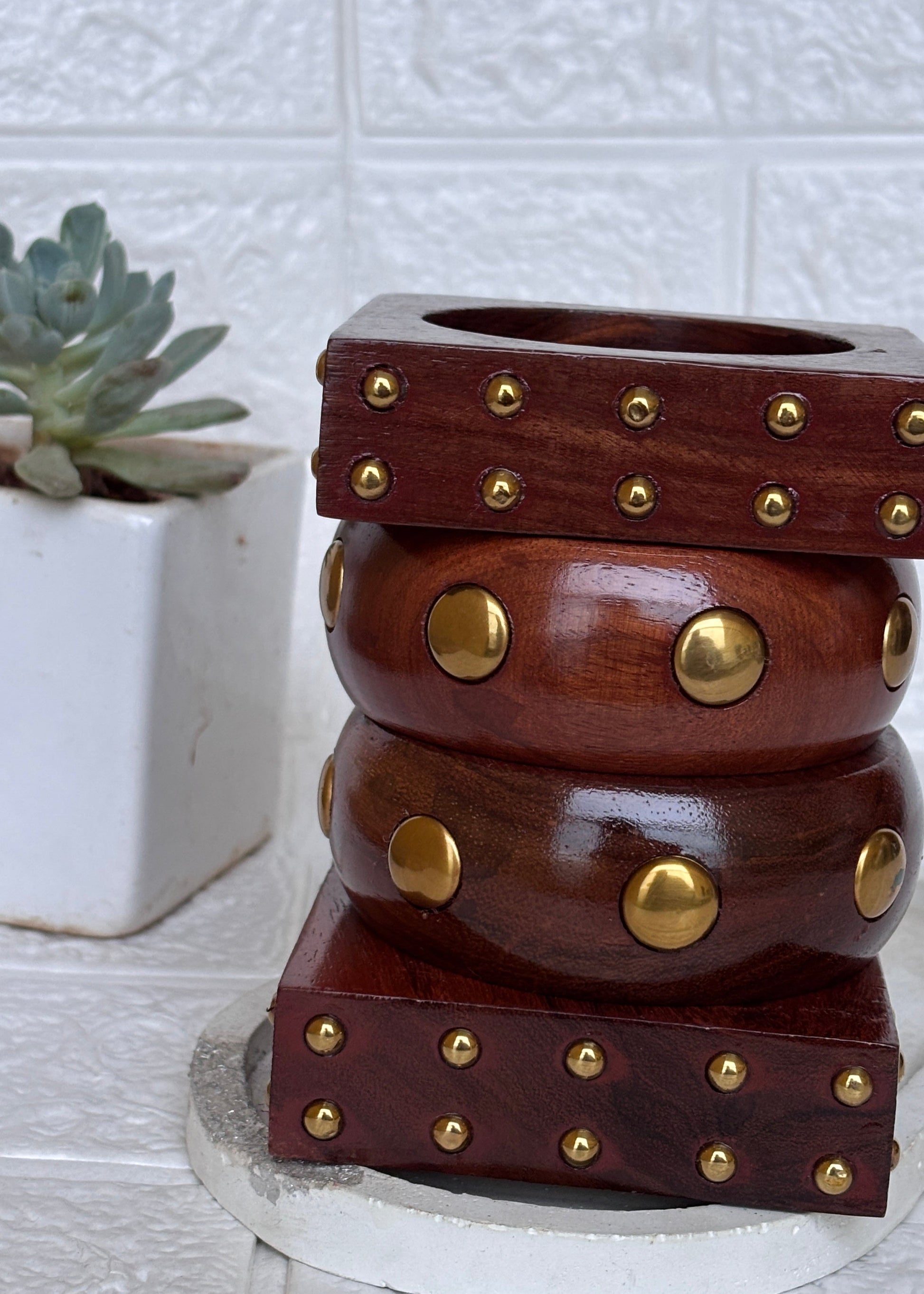 A striking blend of geometry and grounded elegance, The Bold Roots Stack pairs the architectural edge of the Nailah Stud Bangle with the sculpted curves of the Ziya Dome Bangle. Handcrafted from richly grained Keekar wood, each piece is adorned with brass accents — subtle on the square, commanding on the dome. Together, they create a powerful silhouette rooted in tradition yet styled for the modern spirit. Wear them stacked for a bold statement or individually to echo quiet strength.