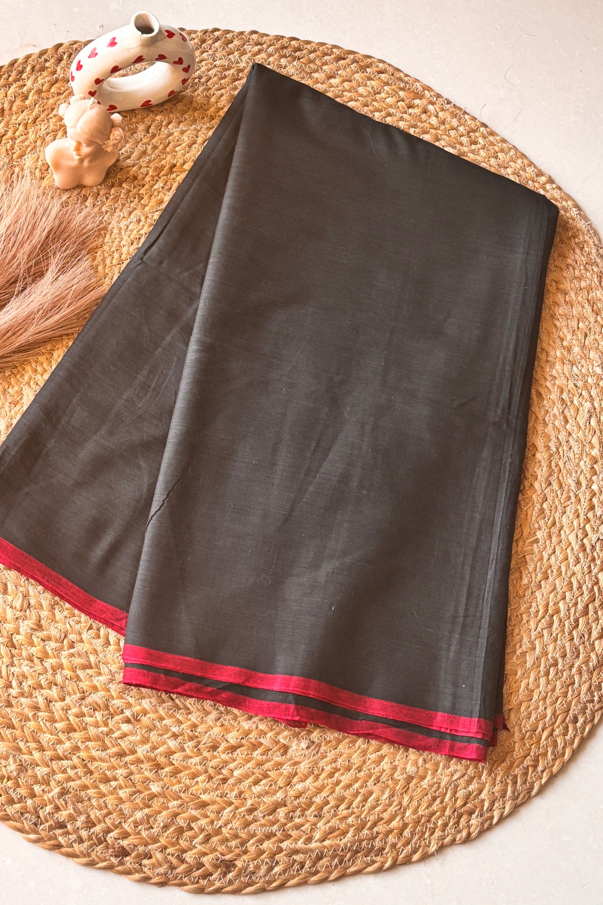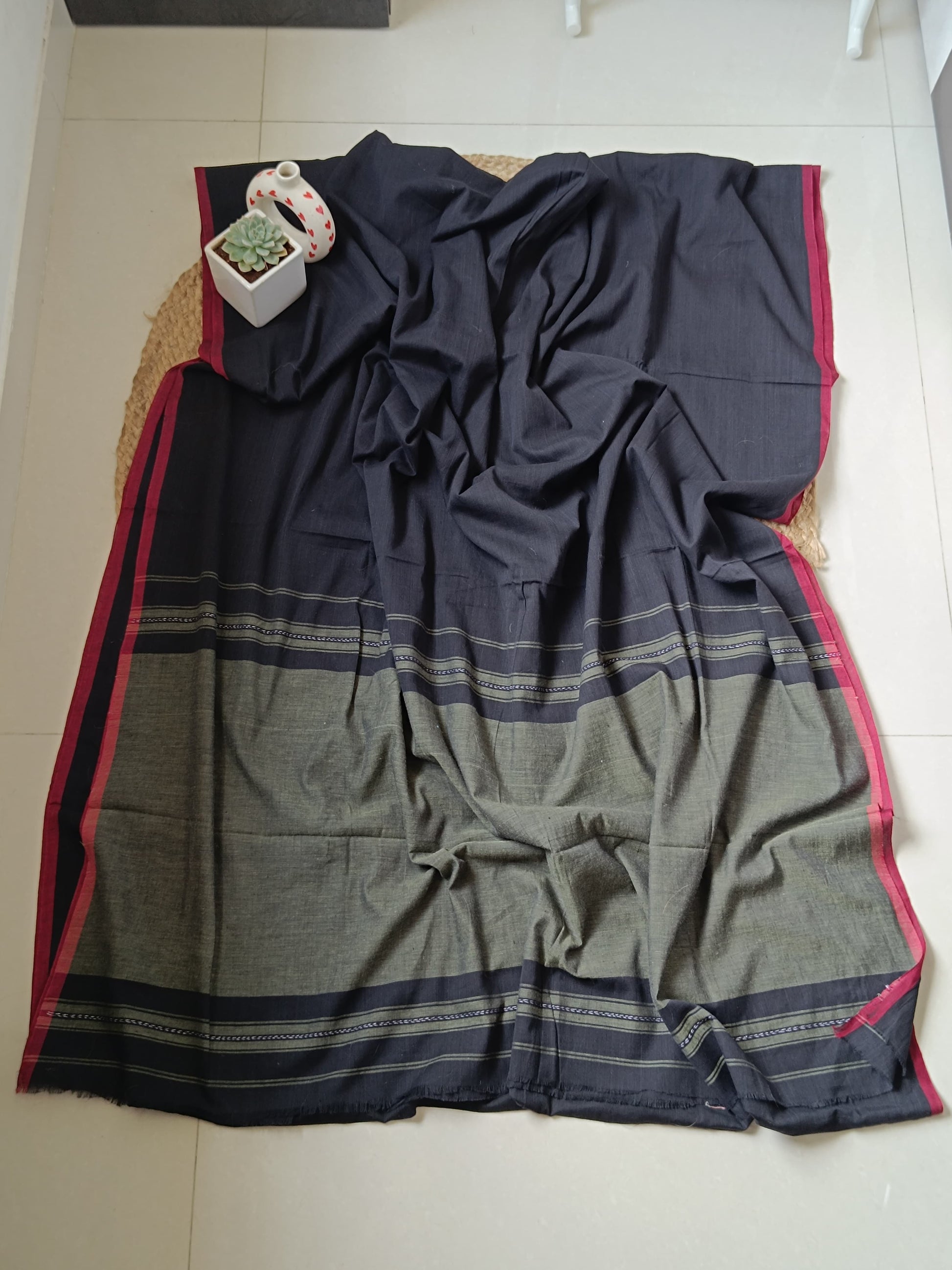 Indulge in the sublime sophistication of our Black Small Border Dhonekhali saree, expertly handwoven with a refined red border that creates a striking visual harmony. This quintessential Bengali textile treasure exemplifies generations of heritage craftsmanship through its impeccable weave and thoughtful detailing. The timeless black canvas adorned with the distinctive red border presents a versatile elegance suitable for ceremonial gatherings and cultivated social engagements alike, making it an essential addition to the discerning collector's wardrobe.