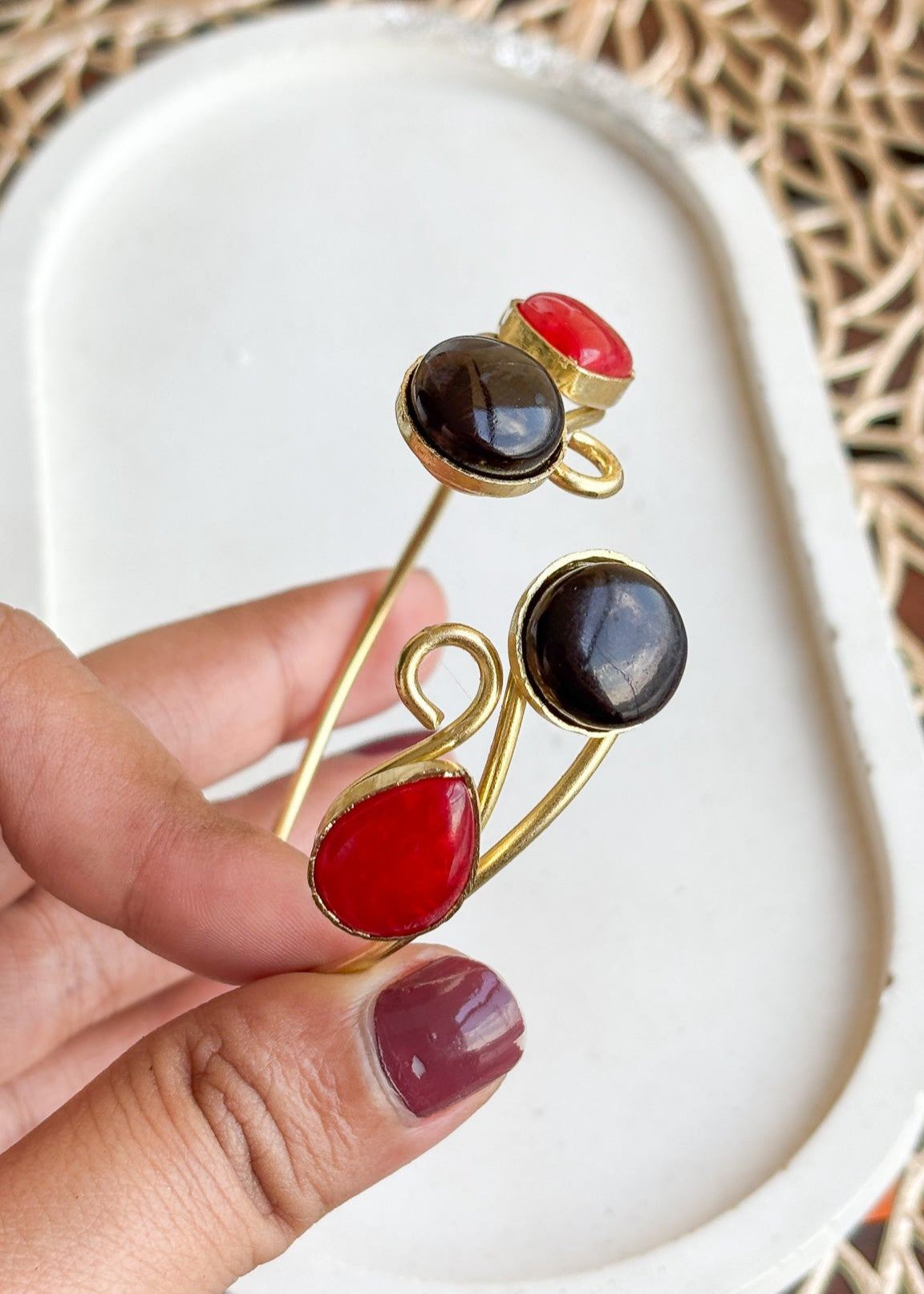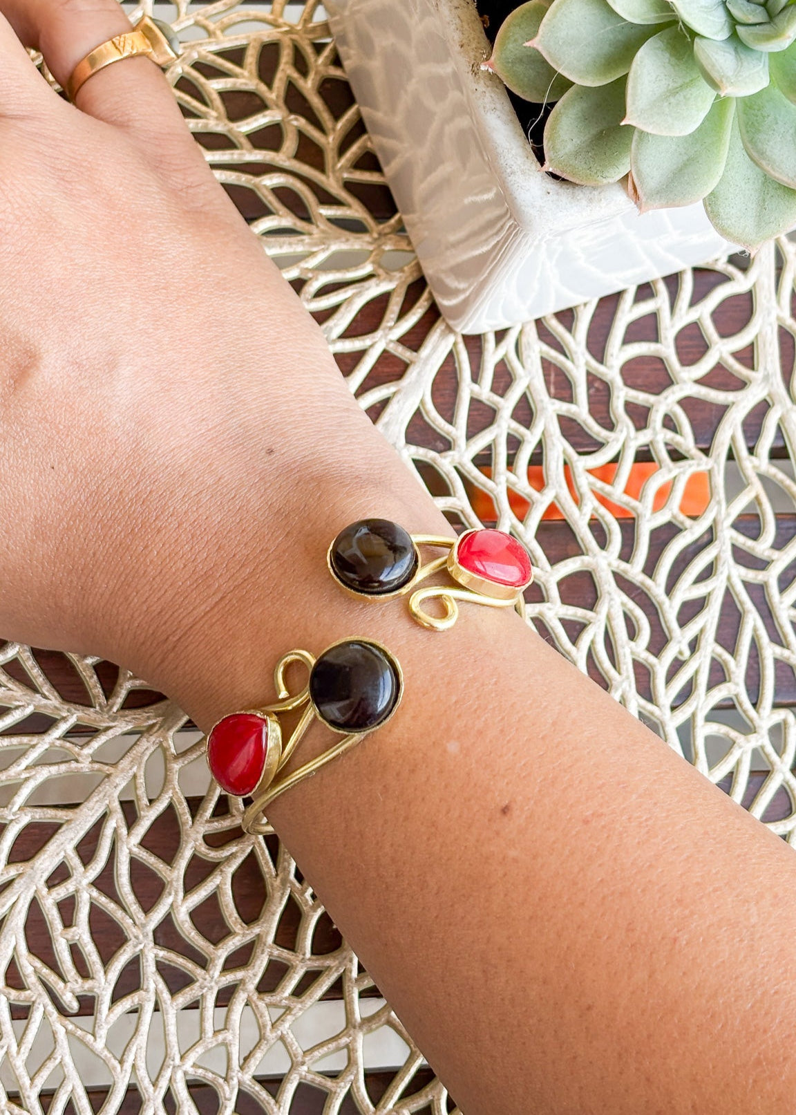 Elevate your ensemble with the Lavanya Cuff, an exquisite open brass cuff adorned with striking black and red stones. This sophisticated accessory balances traditional craftsmanship with contemporary design, creating a statement piece that transitions effortlessly from day to evening wear. The contrasting stones catch the light with subtle brilliance, adding refined elegance to any attire.