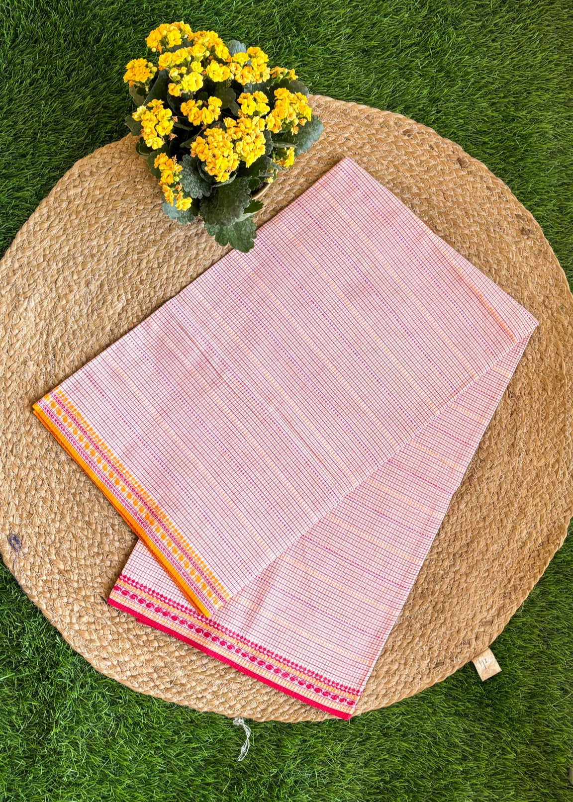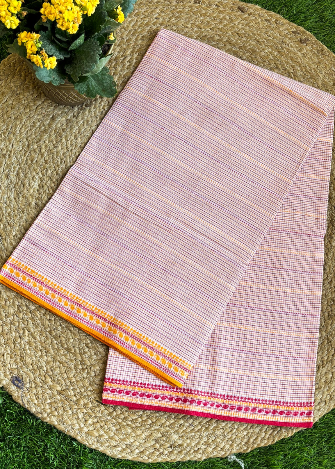 A timeless handwoven Dhonekhali in vibrant red and white checks, crafted in 100% cotton with a 120 thread count. The saree carries delicate woven borders in warm tones of orange and pink, adding a festive brightness to its classic appeal. Lightweight, breathable, and elegant, this piece is perfect for everyday grace as well as special occasions.