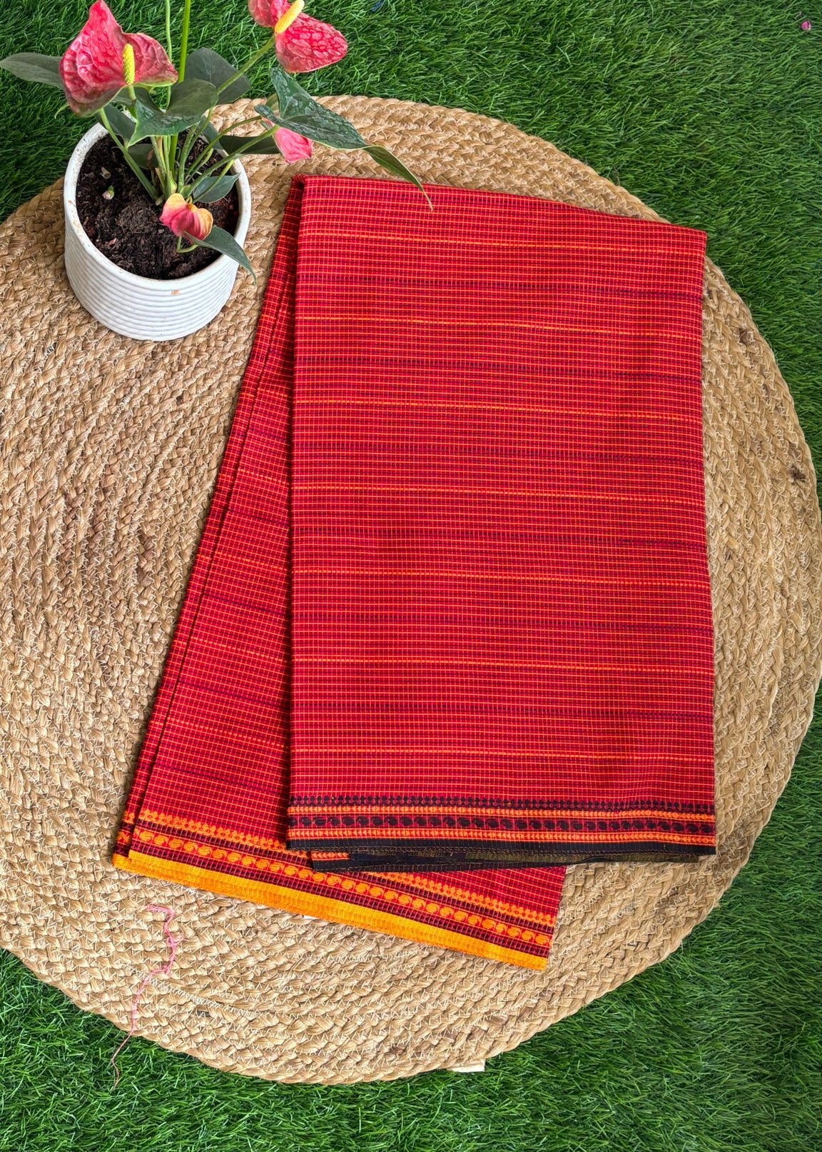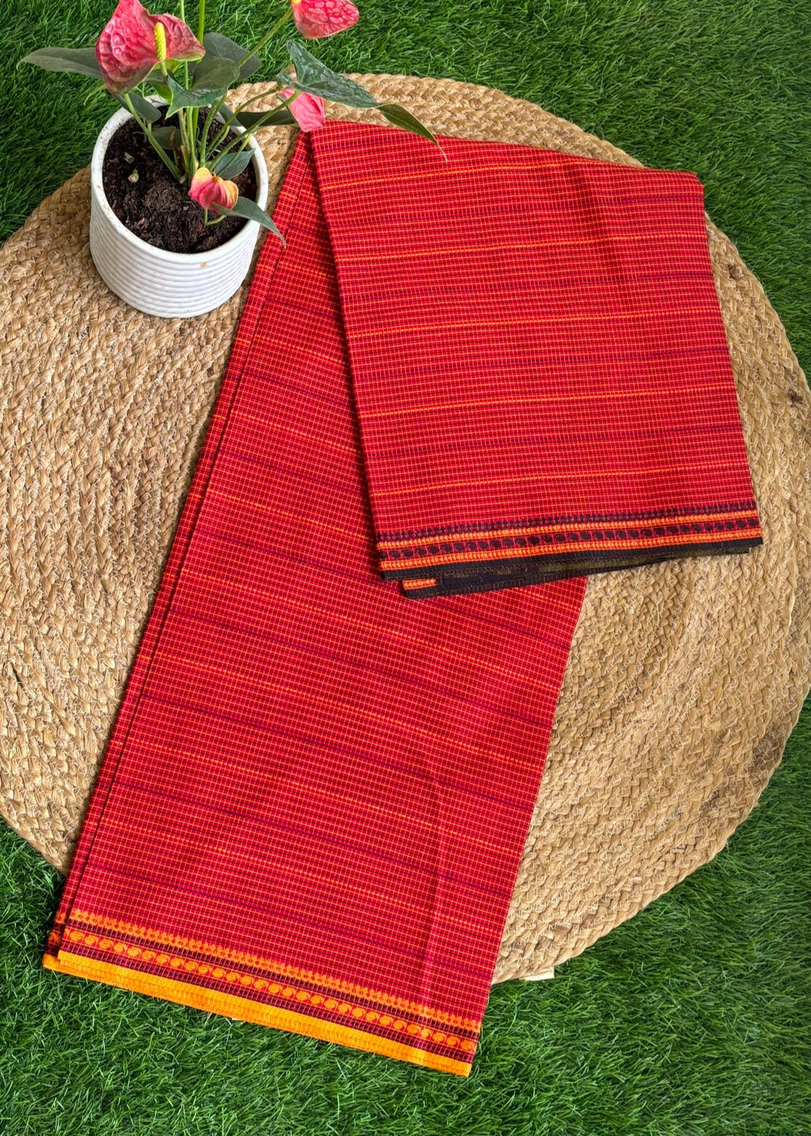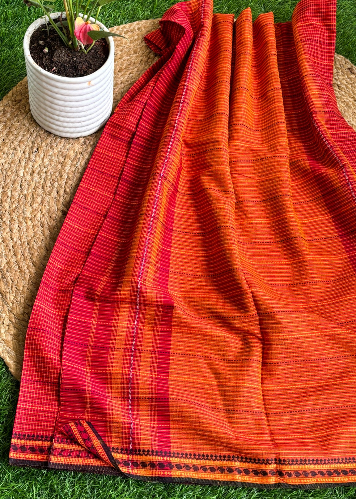 Bold and vibrant, this vermilion Dhonekhali with fine black checks is a celebration of tradition in its most festive spirit. Woven in 100% cotton, 120 thread count, and accentuated with a contrasting orange-black border, this saree blends comfort with a statement look — a classic piece for heritage lovers.