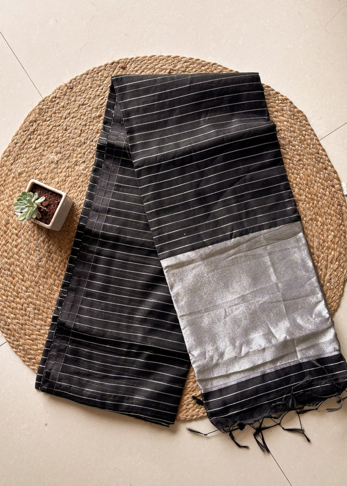 A saree that speaks in whispers of moonlight and midnight, Raat Rani is a timeless blend of soft cotton and lustrous silk. The deep black base is delicately etched with silver zari lines, echoing the quiet poetry of a starlit sky. The pallu glistens with subtle metallic sheen—elegant yet grounded, much like the woman who wears it. Lightweight and fluid, this piece is perfect for evening soirées or intimate festive gatherings where understated grace steals the spotlight.