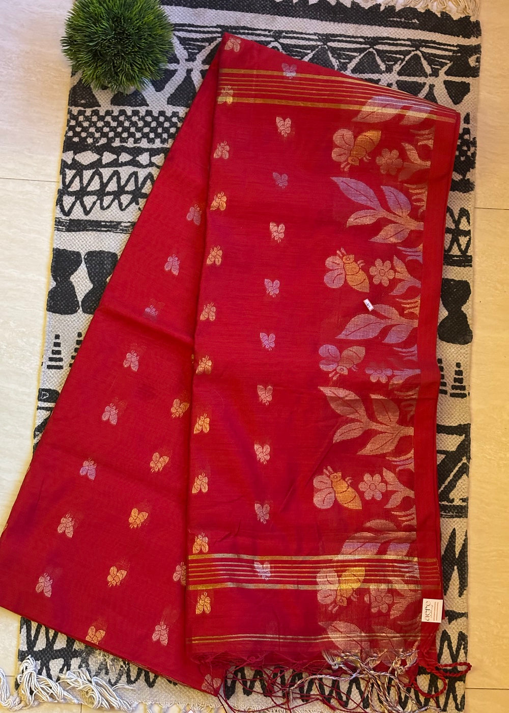 Experience the exquisite artistry of our Red Bee Cotton Silk saree. Meticulously handwoven with delicate bee and leaf motifs, this luxurious blend of cotton and silk offers both comfort and elegance. The rich red hue creates a sophisticated statement piece perfect for discerning connoisseurs of traditional textiles.