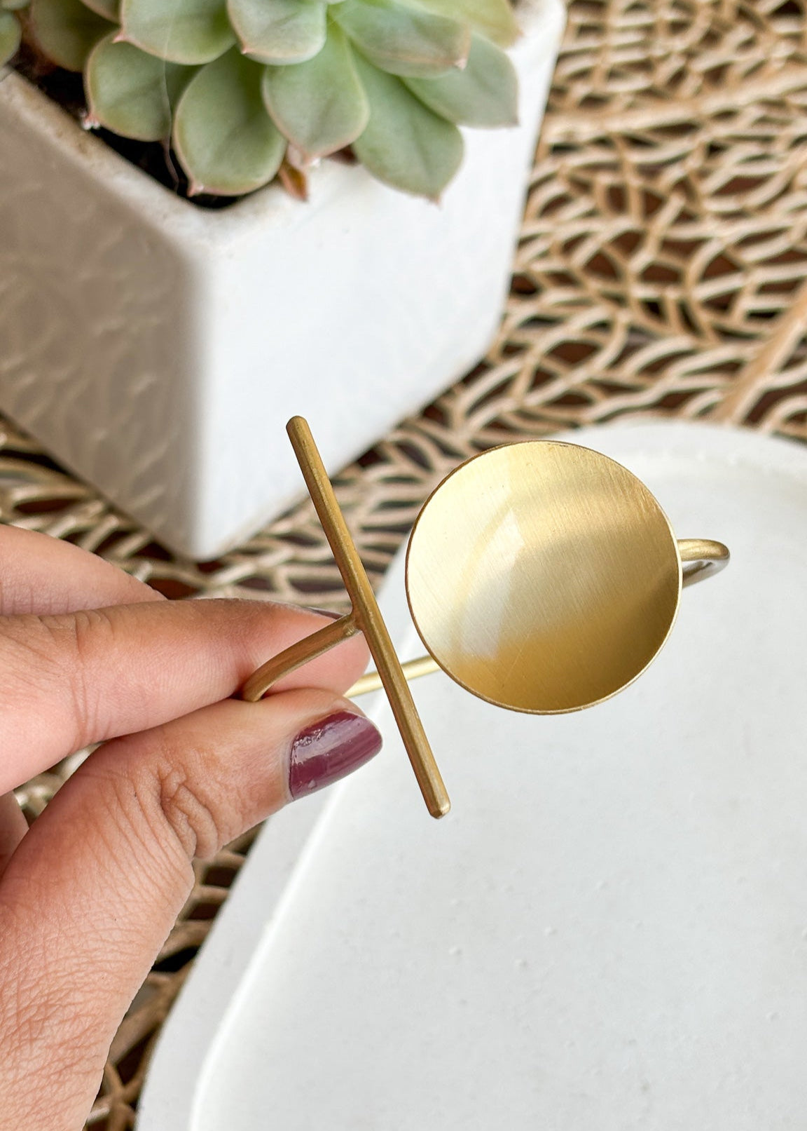 Elevate your ensemble with the Tanishka Cuff, a study in refined minimalism. This open brass bracelet features an elegant interplay of circular and bar elements, creating a sophisticated silhouette that transitions effortlessly from day to evening wear. Its understated design offers versatile styling options while making a quietly confident statement.