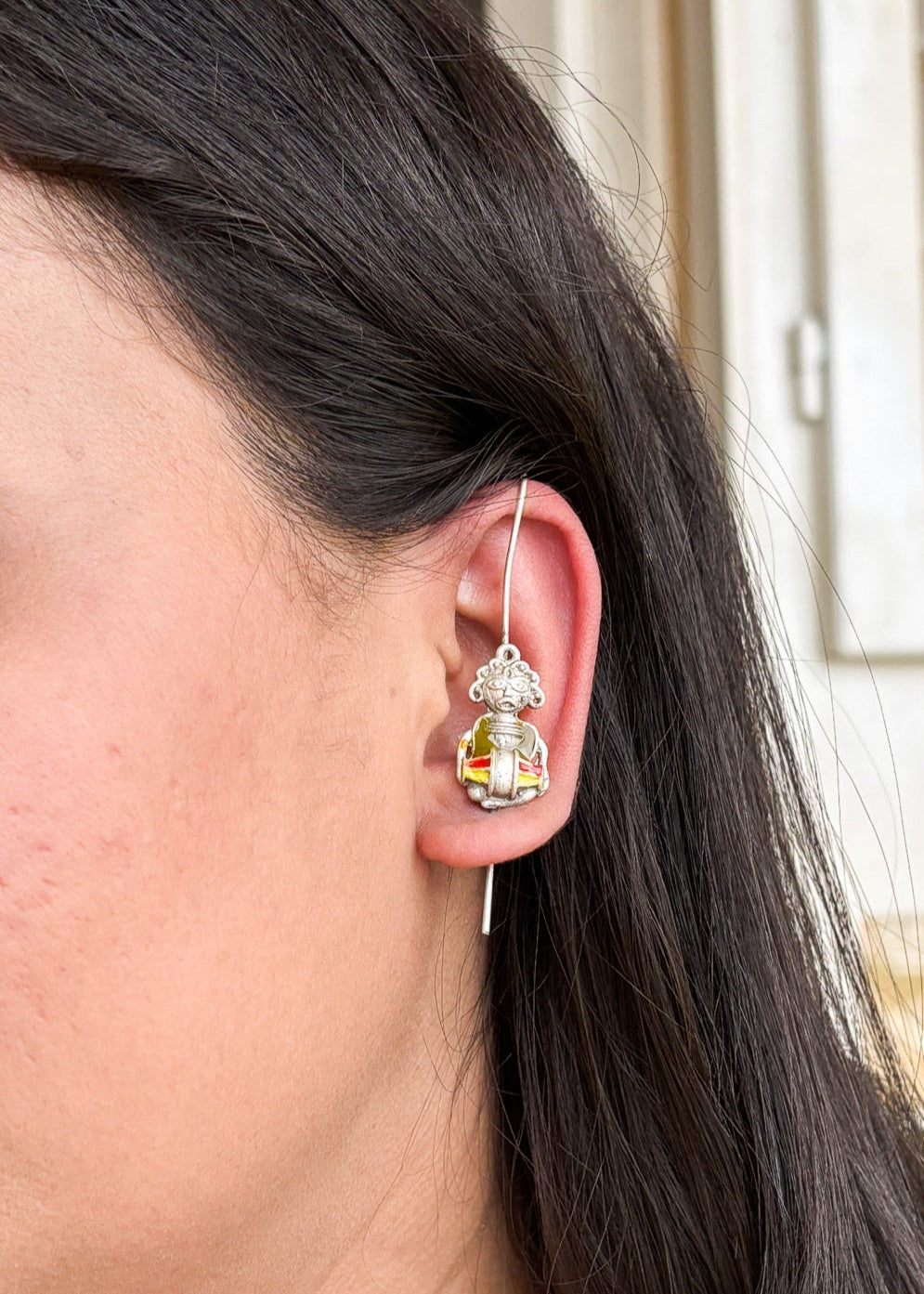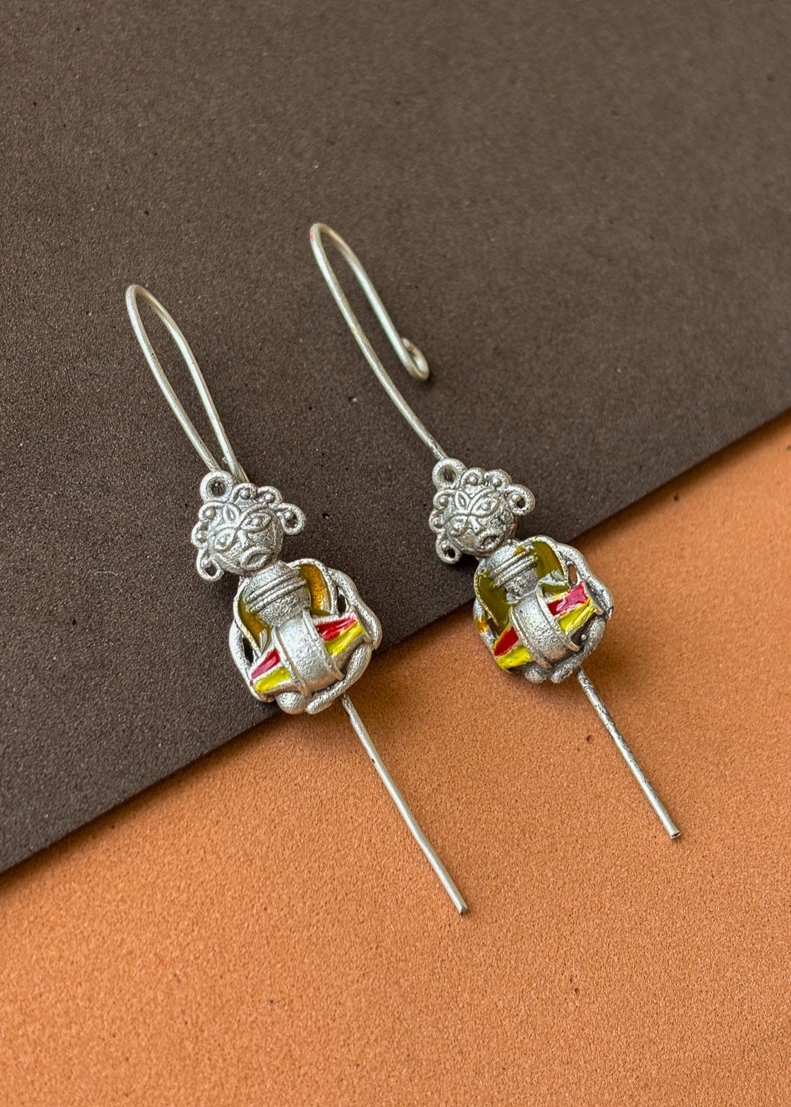 A unique silver replica ear bugadi featuring a miniature figurine playing the dholak, enhanced with vibrant minakari detailing for a touch of color and artistry. Perfect for adding a playful yet elegant vibe to your festive and statement looks.