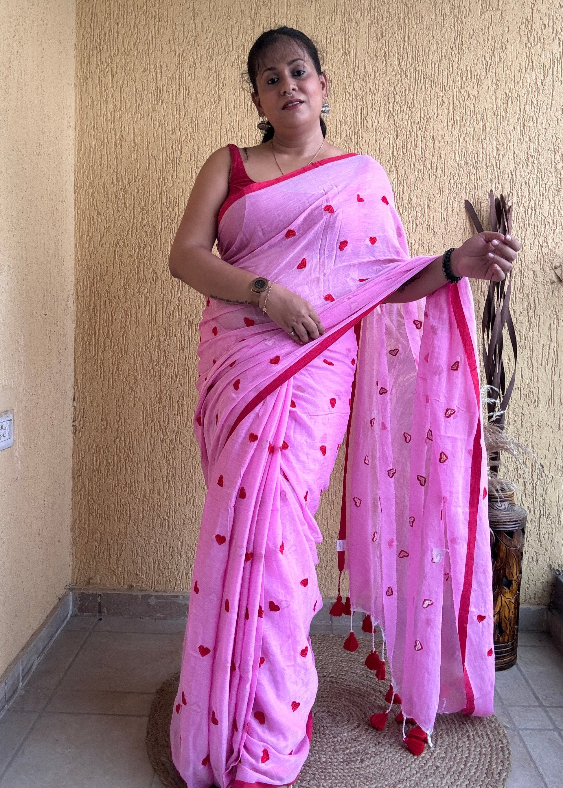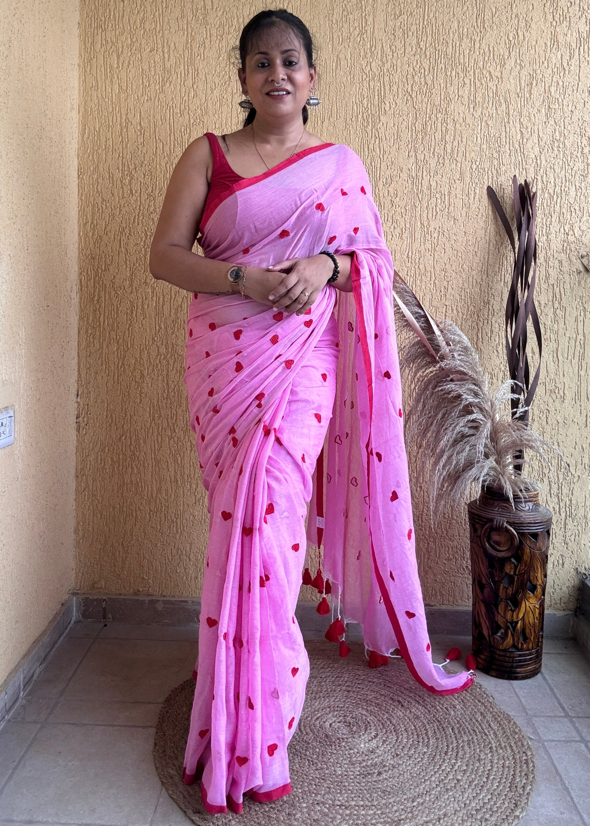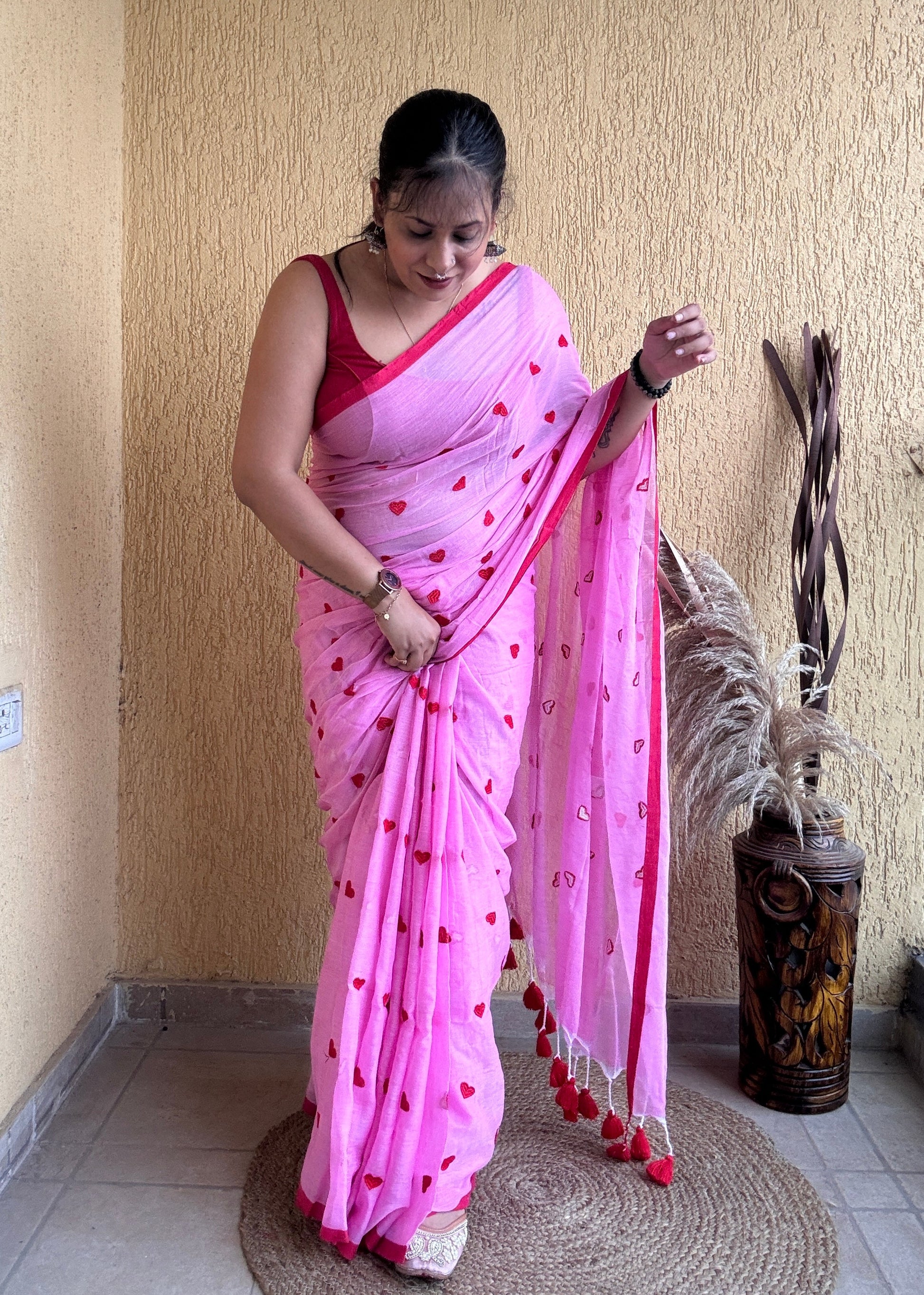 The Dilika Mul Saree in pink showcases exquisite red heart embroidery on soft mul cotton fabric, creating a delicate and elegant contrast. Finished with a thin border and charming pompom accents, this saree blends timeless sophistication with subtle playful details, perfect for a refined and graceful ensemble.
