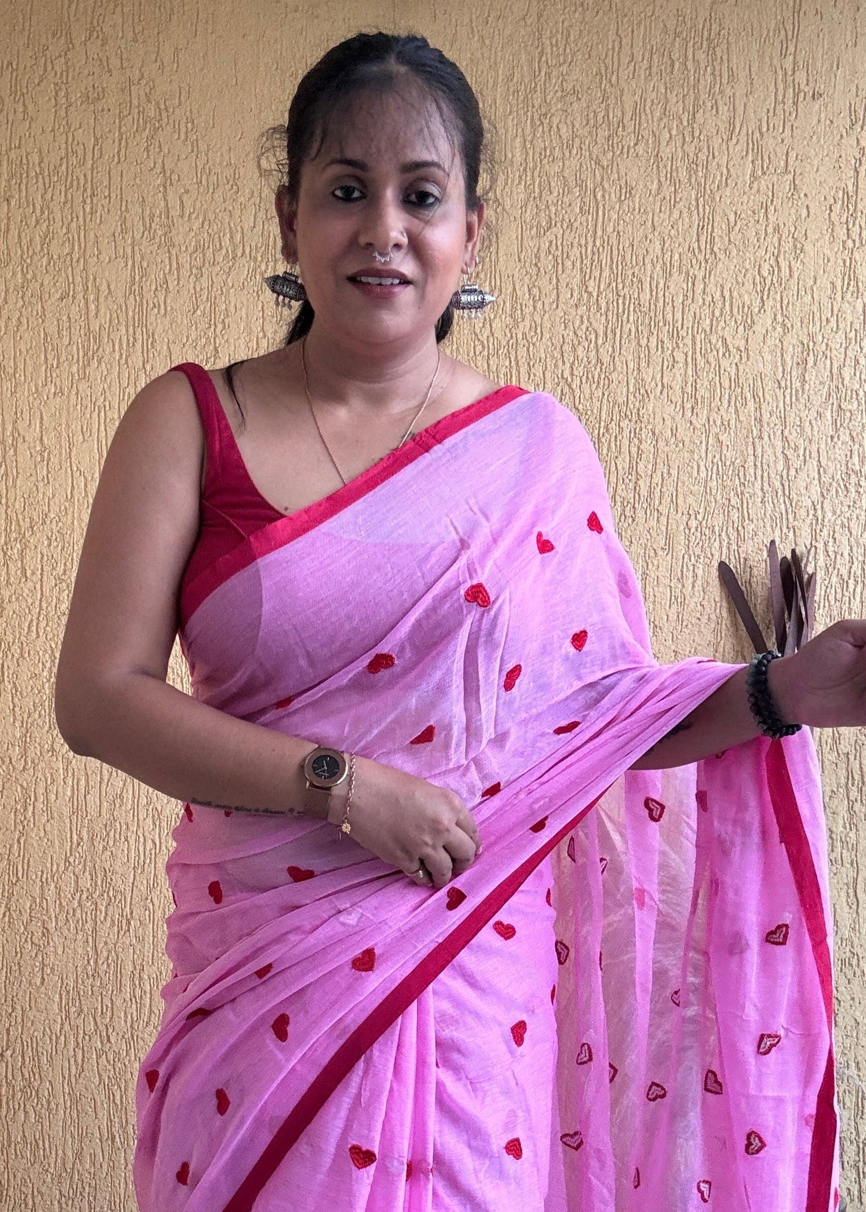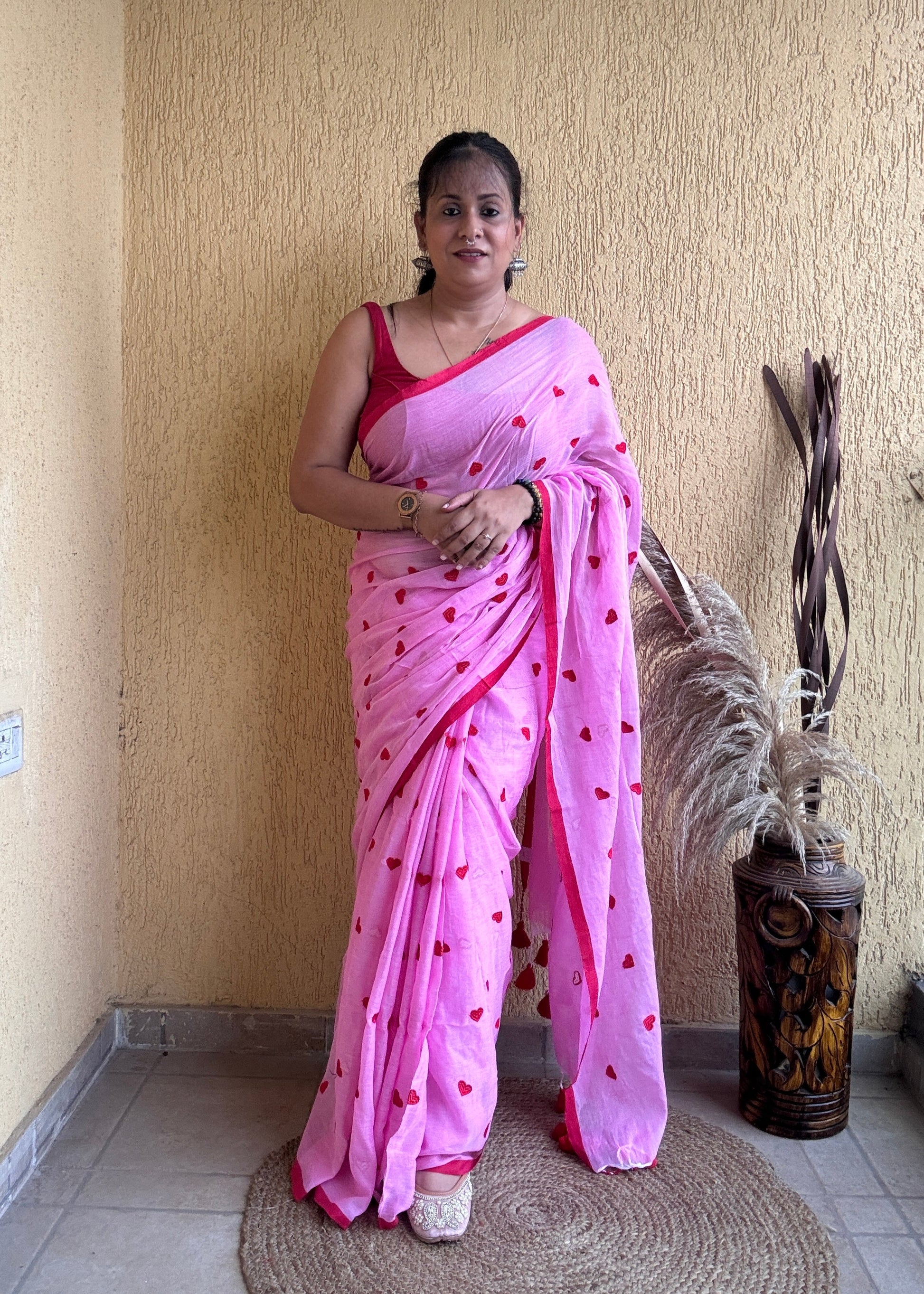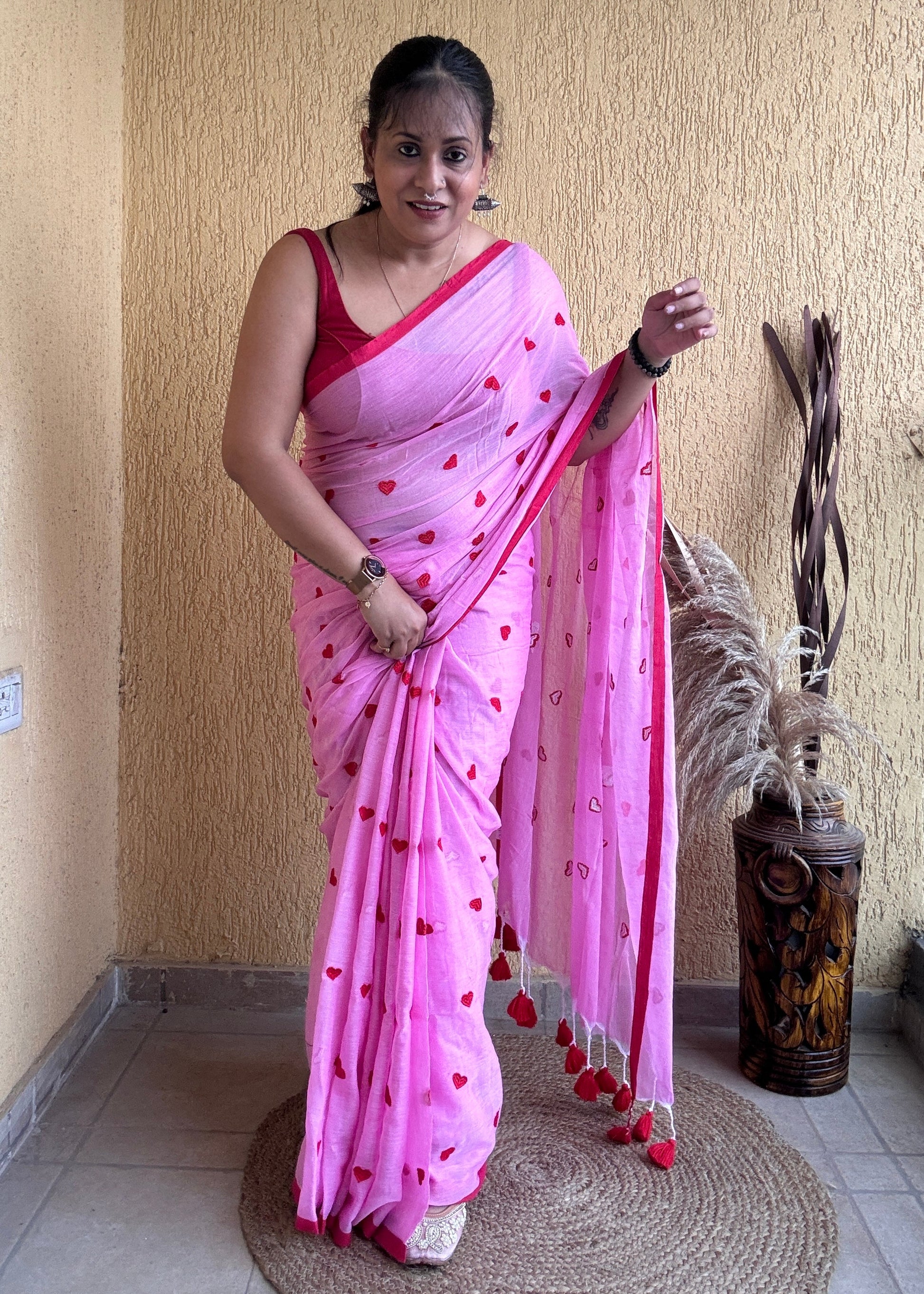 The Dilika Mul Saree in pink showcases exquisite red heart embroidery on soft mul cotton fabric, creating a delicate and elegant contrast. Finished with a thin border and charming pompom accents, this saree blends timeless sophistication with subtle playful details, perfect for a refined and graceful ensemble.