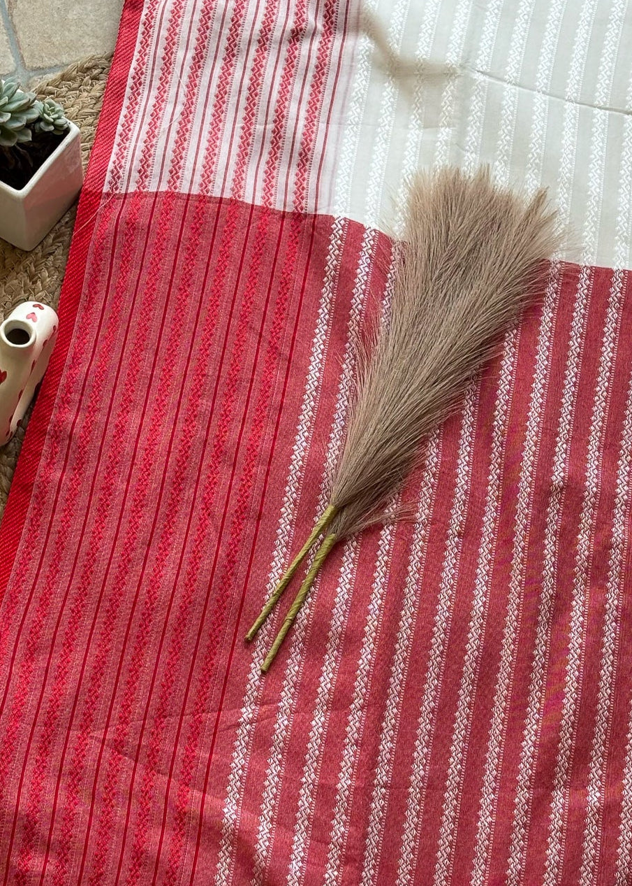 A handloom cotton saree in timeless red and white, woven with the essence of tradition and strength. Symbolic of purity and power, this drape celebrates the spirit of Shakti—perfect for festive days, cultural gatherings, or when you want to carry a piece of heritage with effortless grace. Lightweight, breathable, and elegant, Durga Katha is more than a saree—it’s a story of devotion and timeless style.