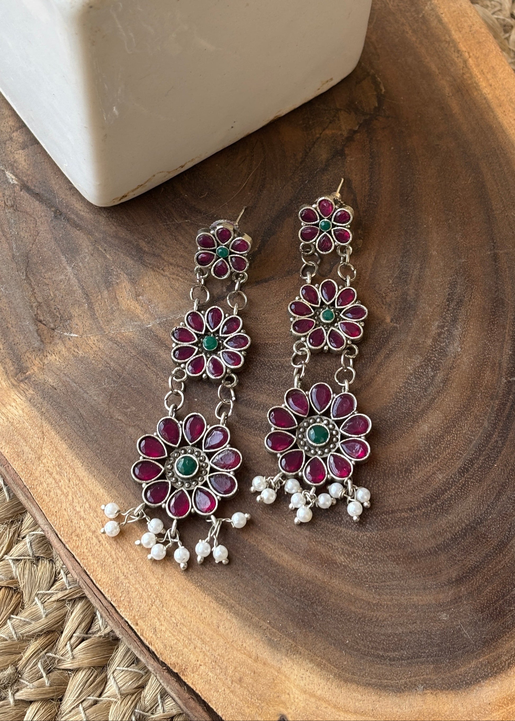 Exquisite three-layered floral design featuring delicate red stone embellishments adorning the petals, complemented by a verdant green centerpiece. The elegant arrangement is enhanced with a lustrous pearl accent, creating a sophisticated interplay of colors and textures that elevates any ensemble with timeless refinement.