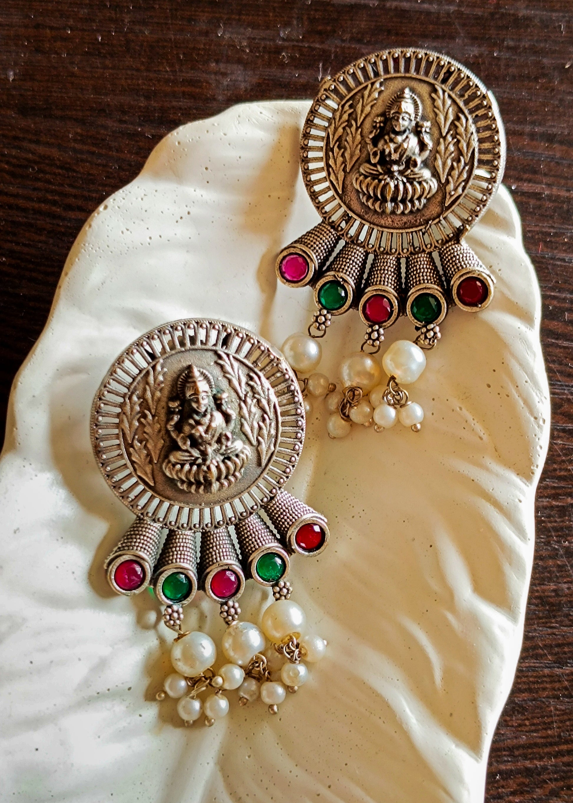 Invoke timeless grace with Deviya – a pair of oxidised silver earrings featuring the divine motif of Goddess Lakshmi. Adorned with deep ruby and emerald-toned stones and delicate pearl drops, these earrings are a statement of heritage and elegance. Perfect for festive occasions or adding a touch of tradition to your everyday look.