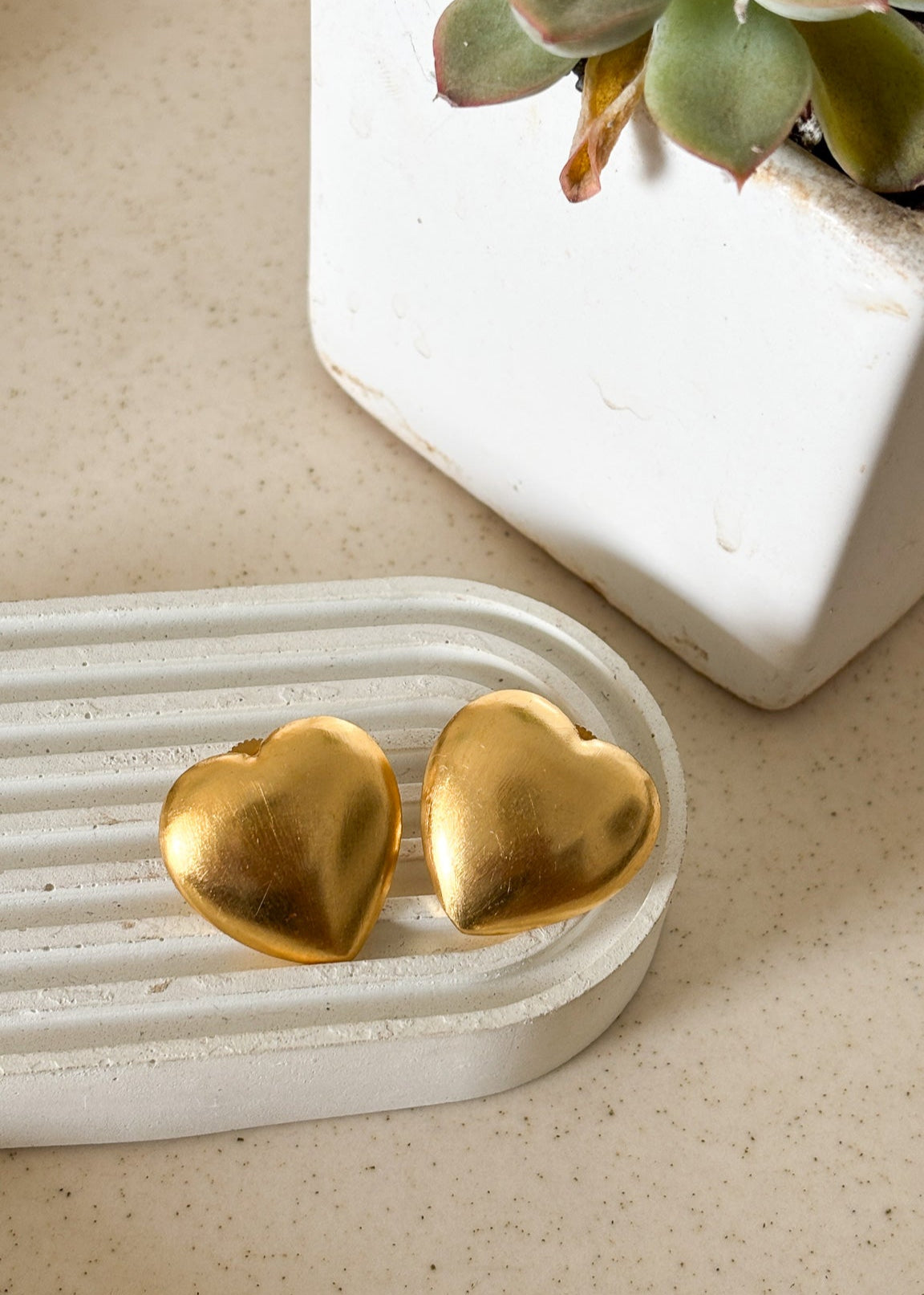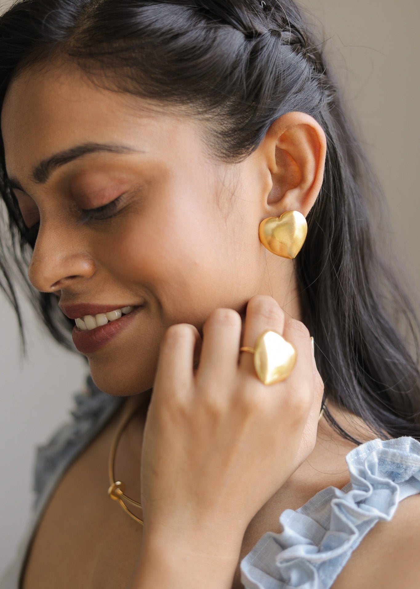 These hand-crafted heart-shaped earrings are a modern ode to simplicity and romance. Made in a soft matte gold finish, they exude understated charm while making a statement. Their bold, puffy heart silhouette captures a retro yet timeless feel — perfect for everyday styling or gifting a piece of love.