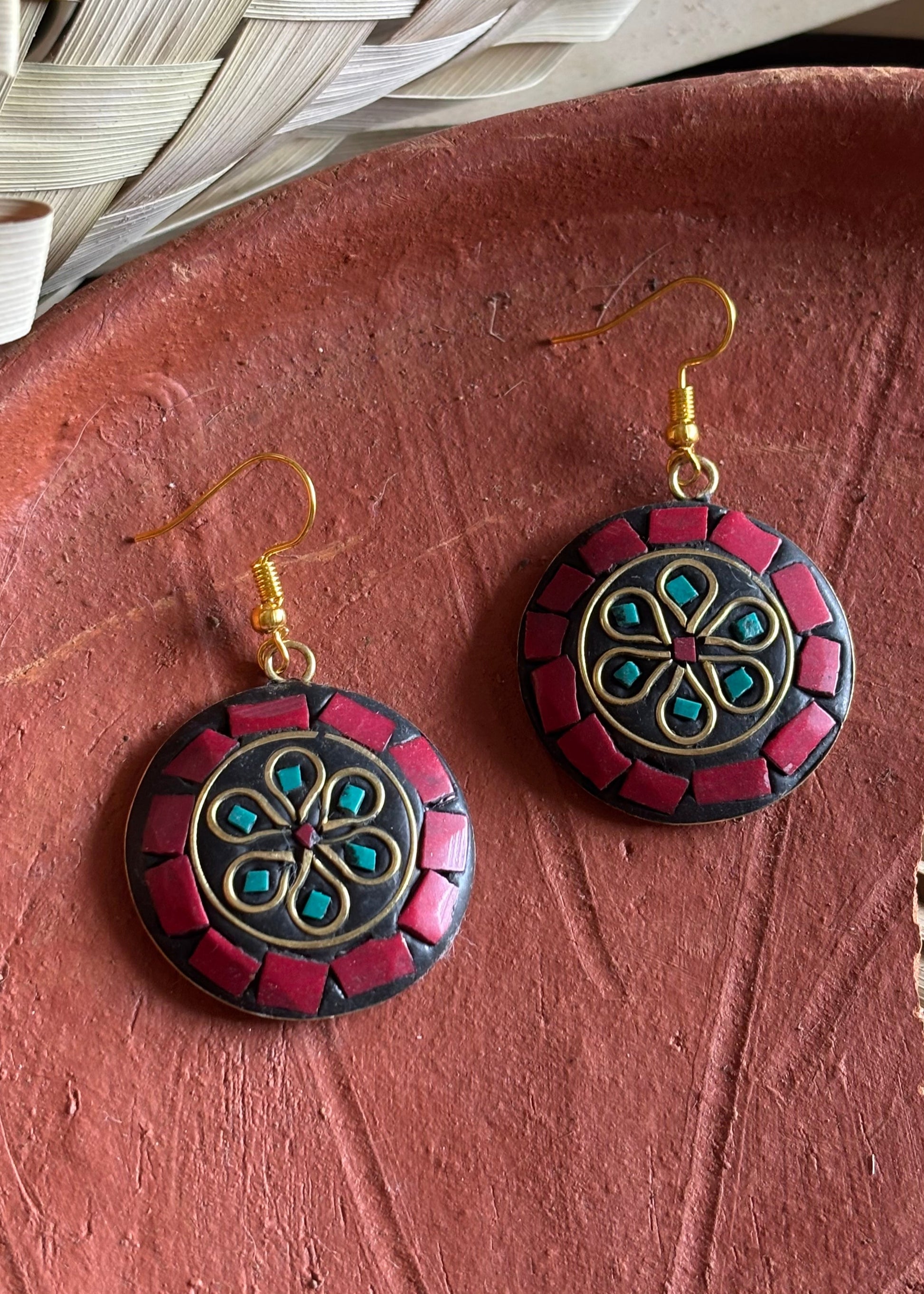 These exquisite Afghani round earrings showcase a refined black base accented with intricate red and golden detailing, highlighted by vibrant red and green stones. The artisanal "Boond" design merges traditional craftsmanship with contemporary sophistication, making them a striking accessory that enhances both casual and formal outfits.