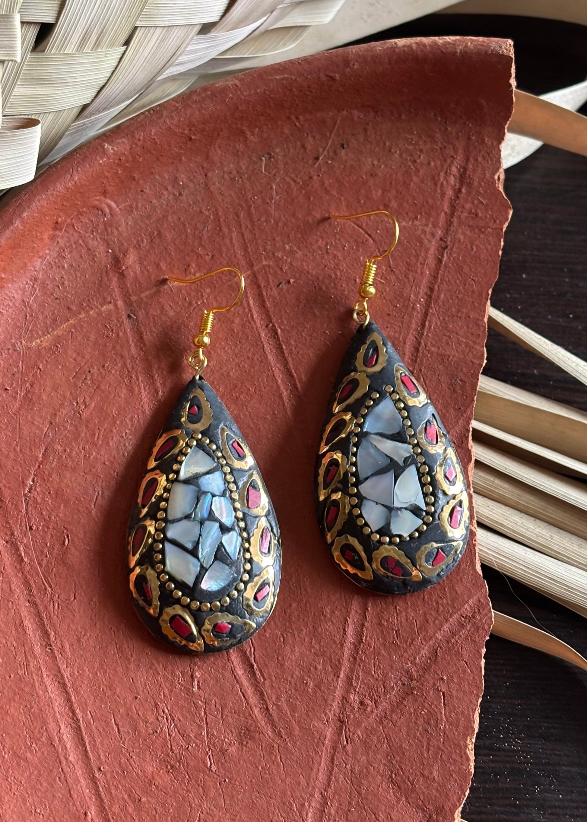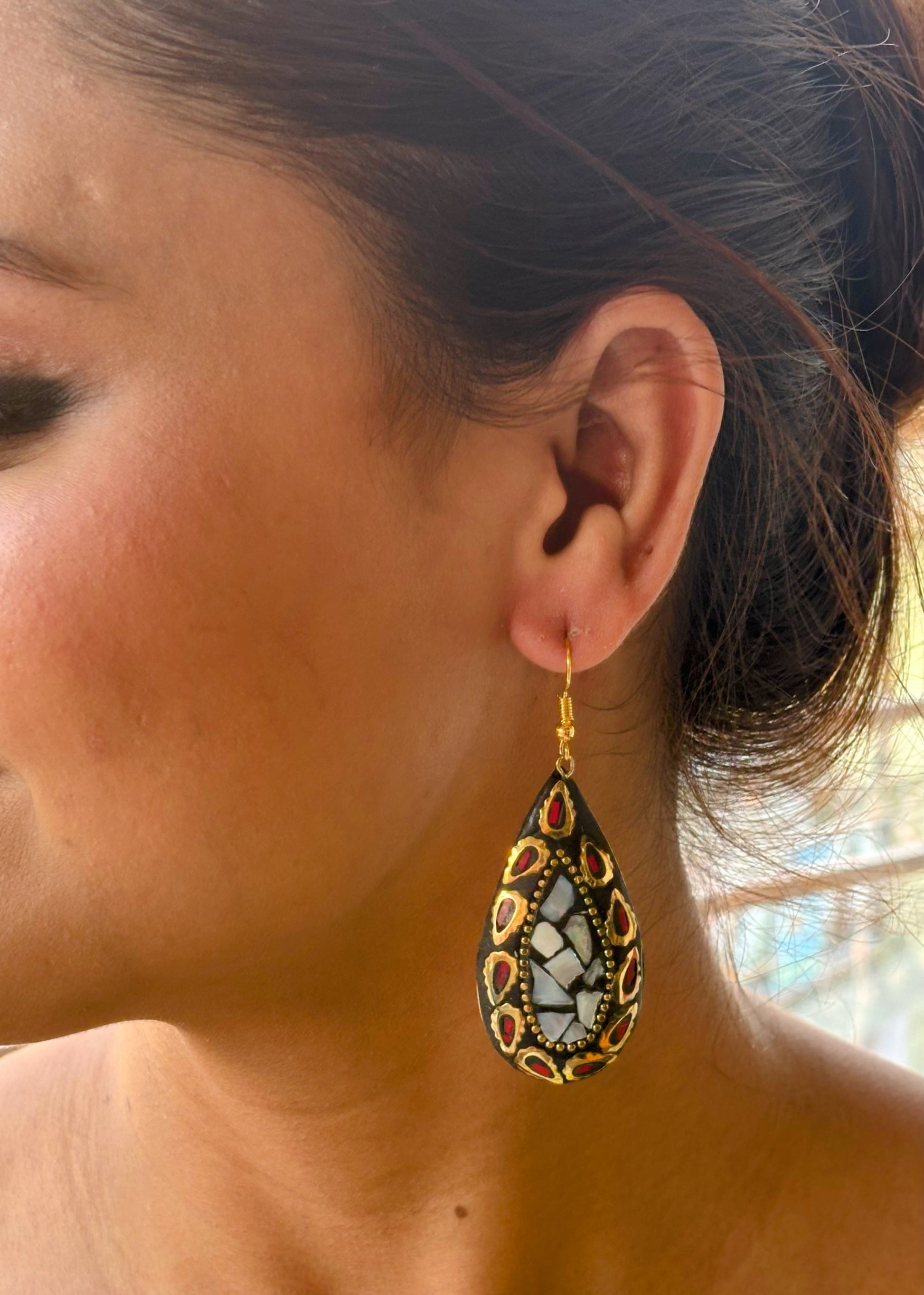 Exquisite Afghani tear-drop earrings featuring a sophisticated black base adorned with intricate white, red, and golden detailing. These artisanal "Boond" earrings blend traditional craftsmanship with contemporary elegance, creating a statement piece that elevates both casual and formal ensembles.