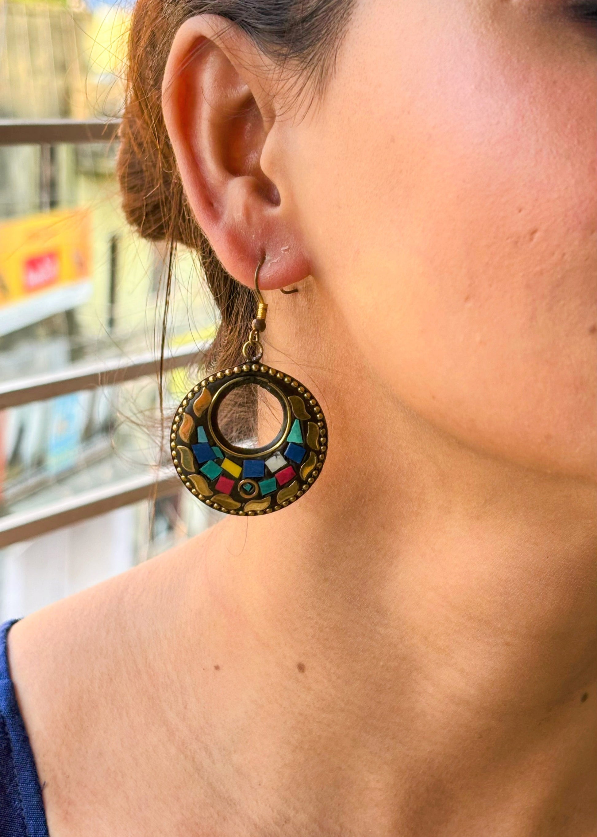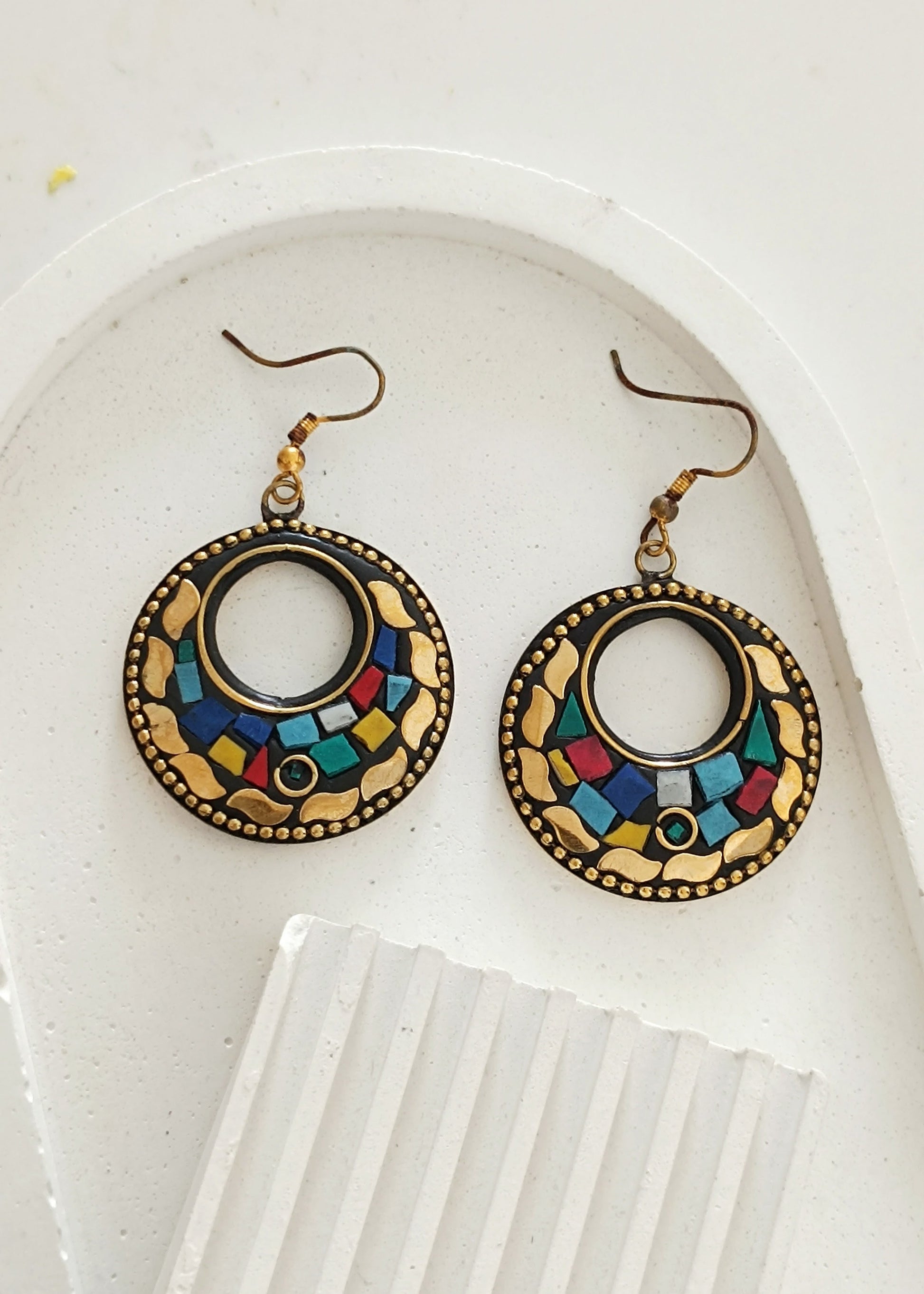 A celebration of colours and curves, Rangmahal earrings bring a kaleidoscopic rhythm to your look. Handcrafted in Afghani lac technique, these circular drop earrings feature a playful mosaic of jewel-toned tiles—ruby red, cobalt blue, emerald green, and mustard yellow—set against a black base and framed in antique gold motifs. Bold yet balanced, they speak of art, movement, and stories waiting to be heard. Ideal for festive drapes or everyday drama.