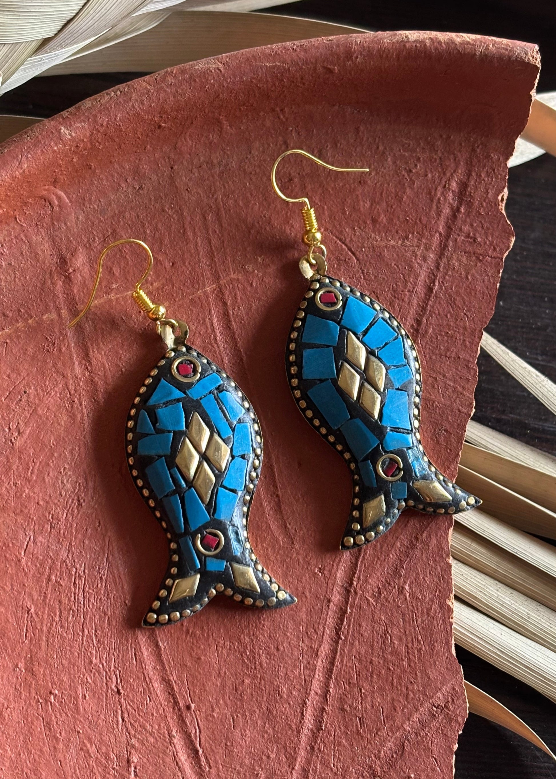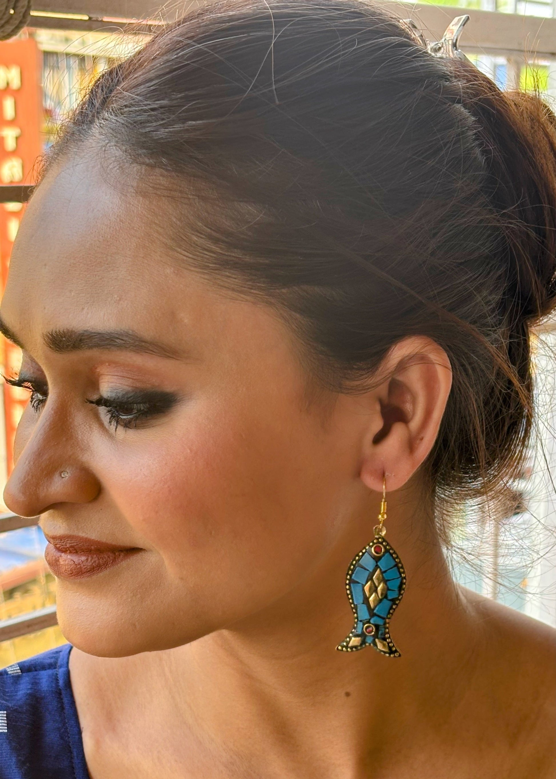 The Zyra earrings are exquisite Afghani fish-shaped pieces featuring a sleek black base decorated with intricate white, red, and gold accents. These artisanal "Boond" earrings combine traditional craftsmanship with modern sophistication, making them a distinctive accessory that enhances both casual and formal outfits.