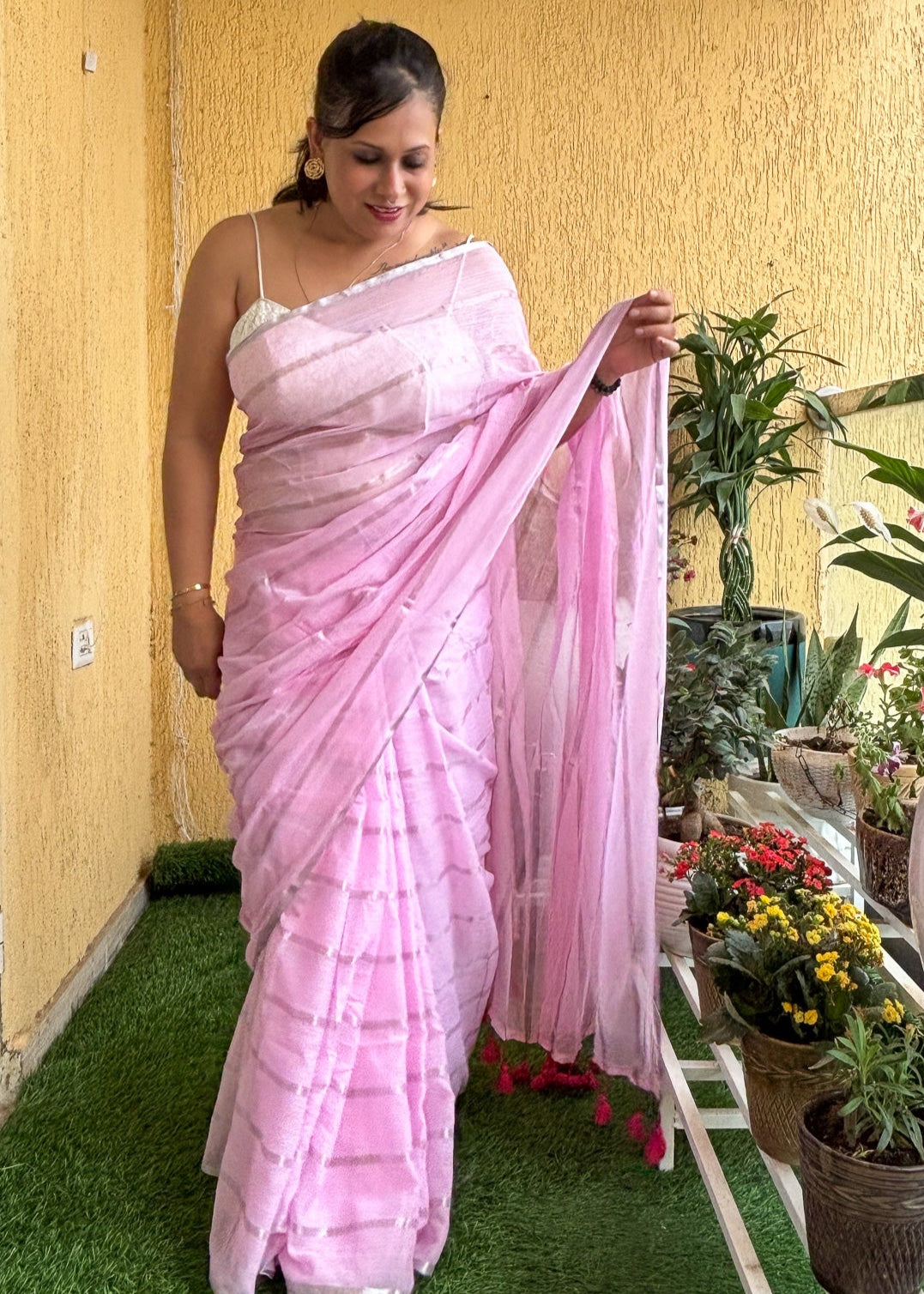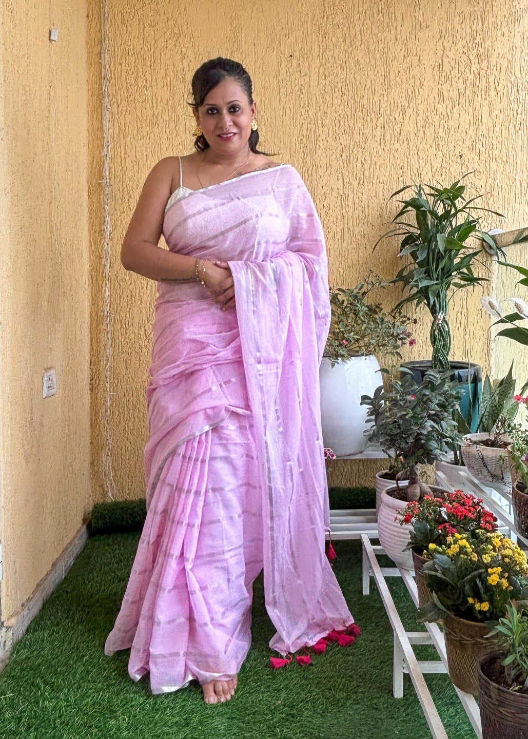 A delicate pink mul cotton saree that feels light as a whisper. Accented with silver lines and finished with matching tassels, it carries the joy of festive gulal in a soft, wearable form. Easy to drape, breezy, and elegant — perfect for day celebrations, casual outings, or a touch of grace in everyday wear.