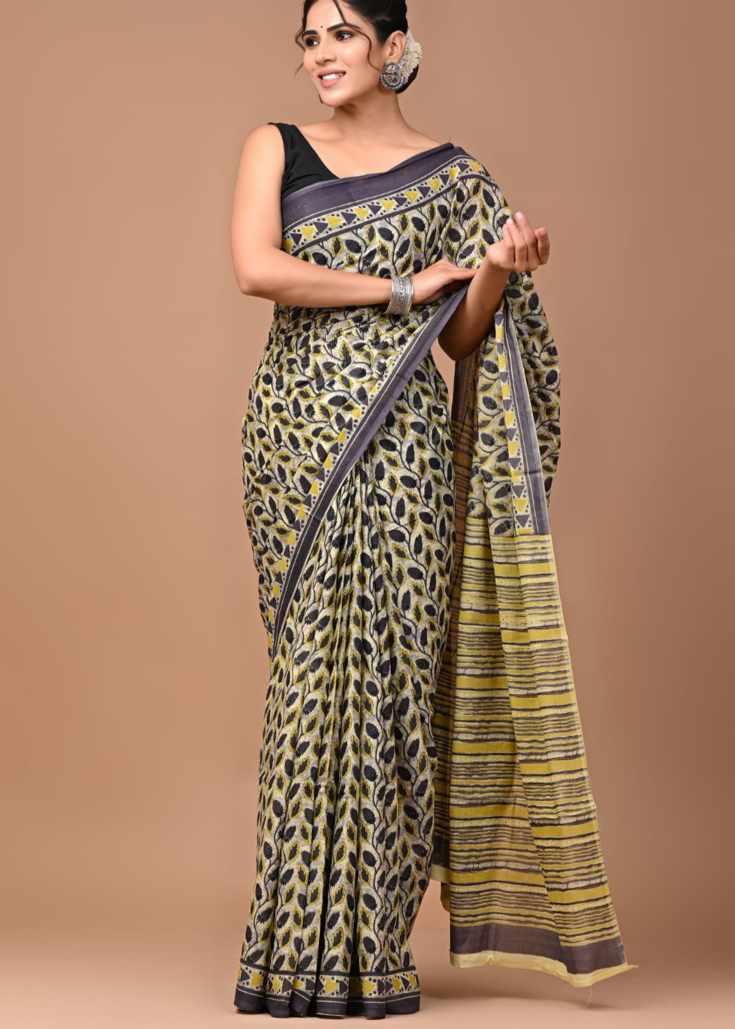 Crafted in soft cotton with traditional digital block prints, the Harita Saree comes in two elegant shades — one with deep grey borders and the other with a blue touch. Its leafy motifs flow seamlessly into striped pallus, giving a balance of tradition and modern charm. Light, breathable, and versatile, this saree is perfect for workdays, casual outings, or festive evenings when you want comfort with style.