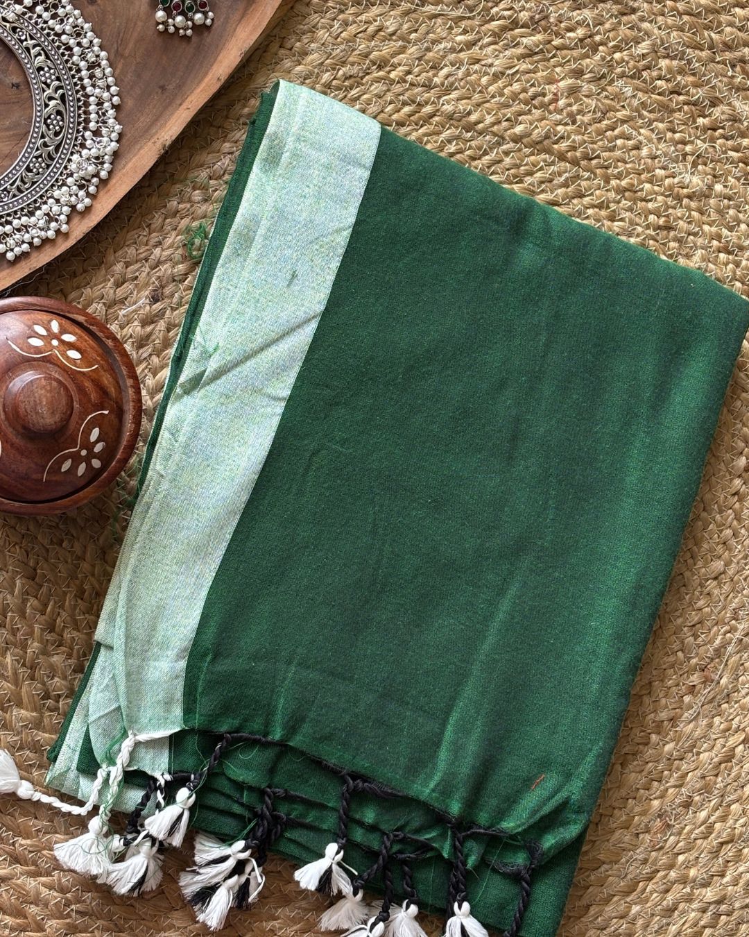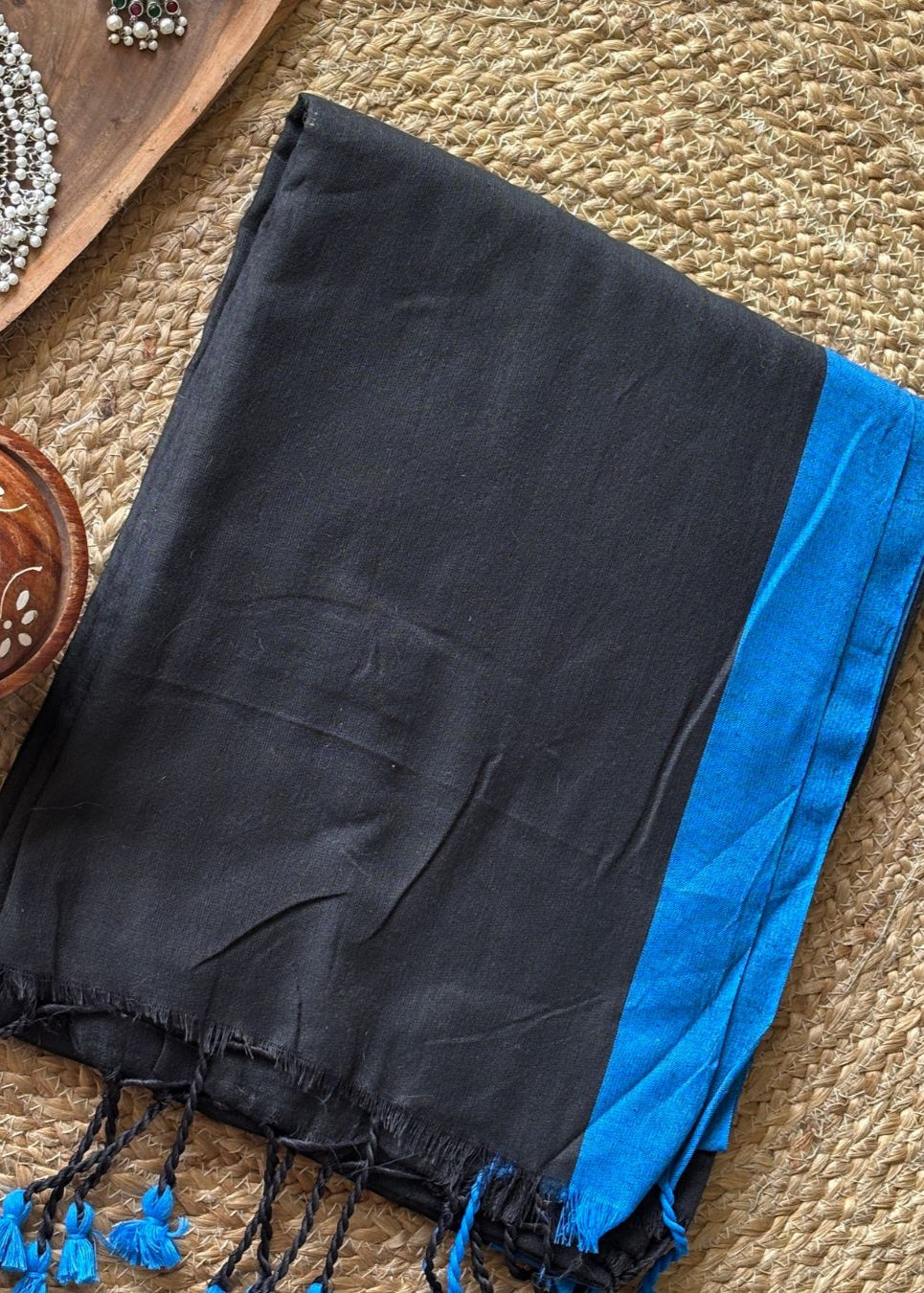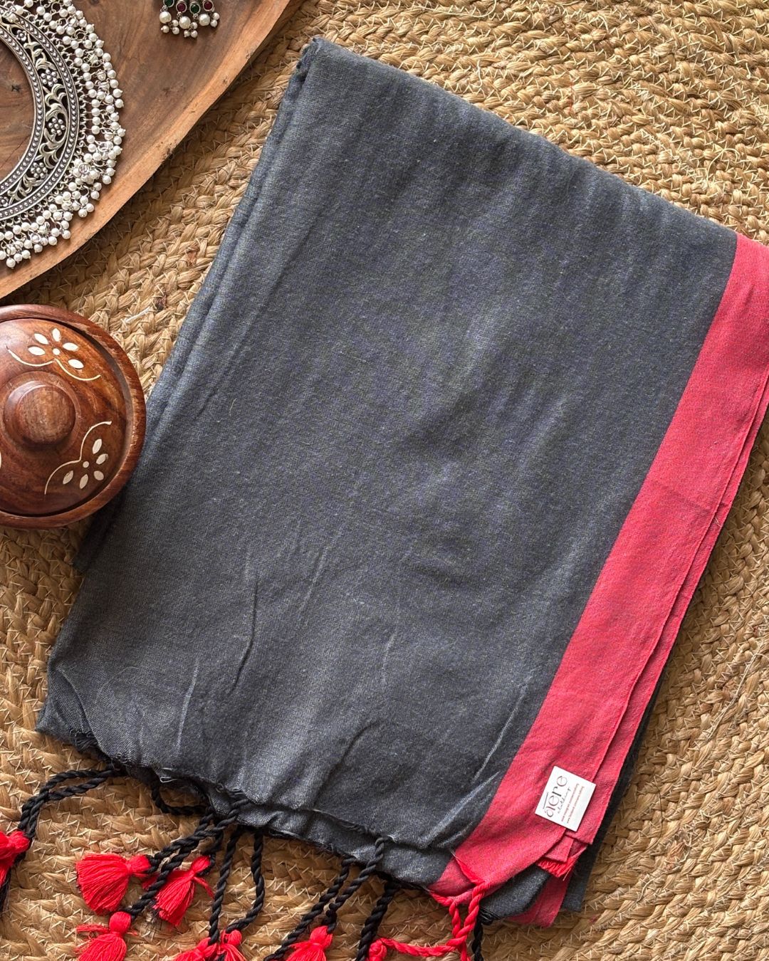 Experience the artisanal elegance of our Inchi par Handloom with delicate small pompom detailing. Crafted from premium quality handloom cotton, this piece features a sophisticated contrast inch border complemented by tasteful tassels. Each thread speaks to the heritage of traditional craftsmanship while offering refined aesthetic appeal for the discerning collector.