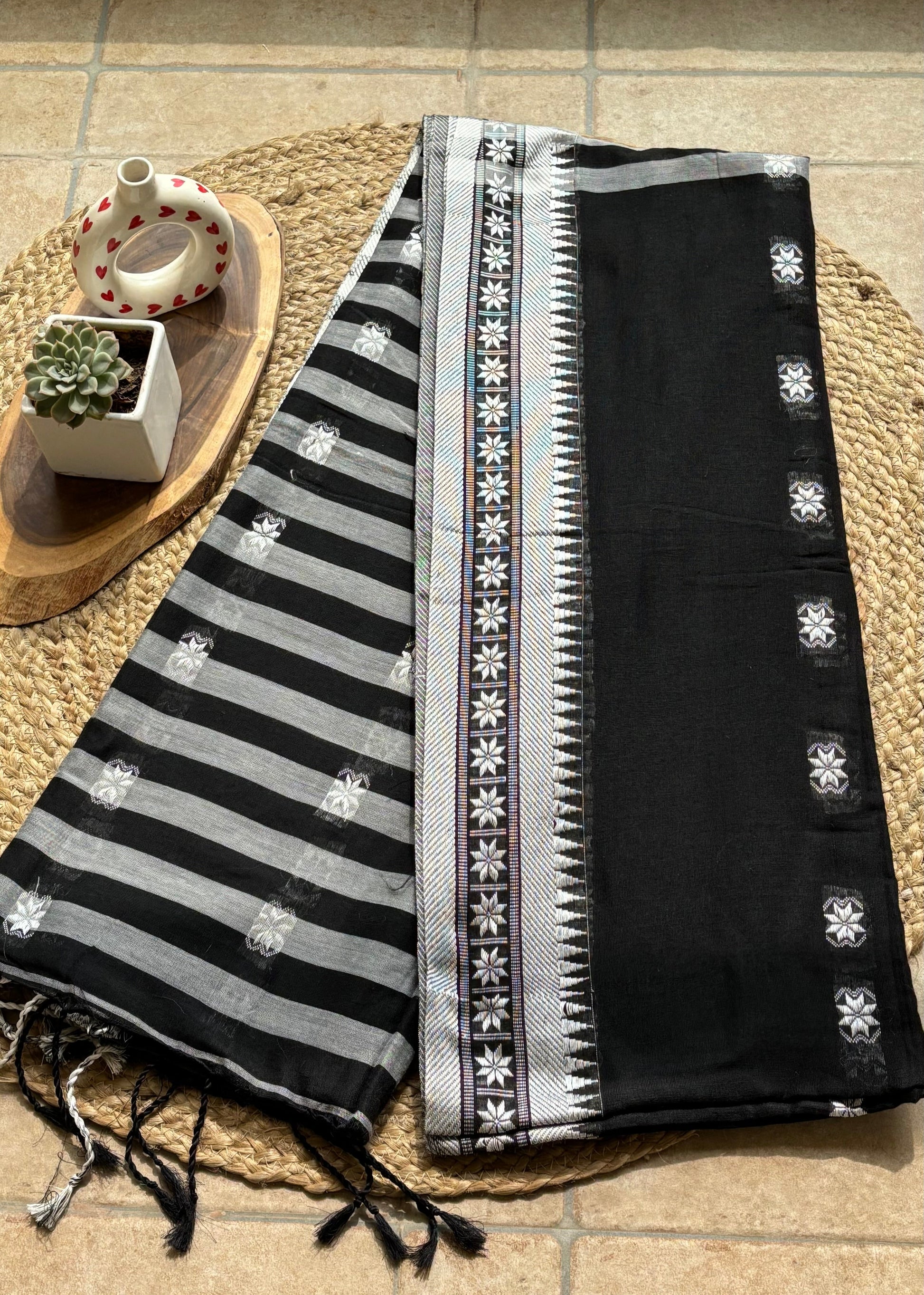 Exquisitely crafted Iravati Handloom Black saree, meticulously hand-woven on traditional looms by skilled artisans. This elegant piece features a distinguished border and delicate buta motifs adorning the body, creating a sophisticated aesthetic. Complete with a matching blouse piece, this saree embodies timeless craftsmanship and refined elegance for discerning connoisseurs of authentic handloom textiles.