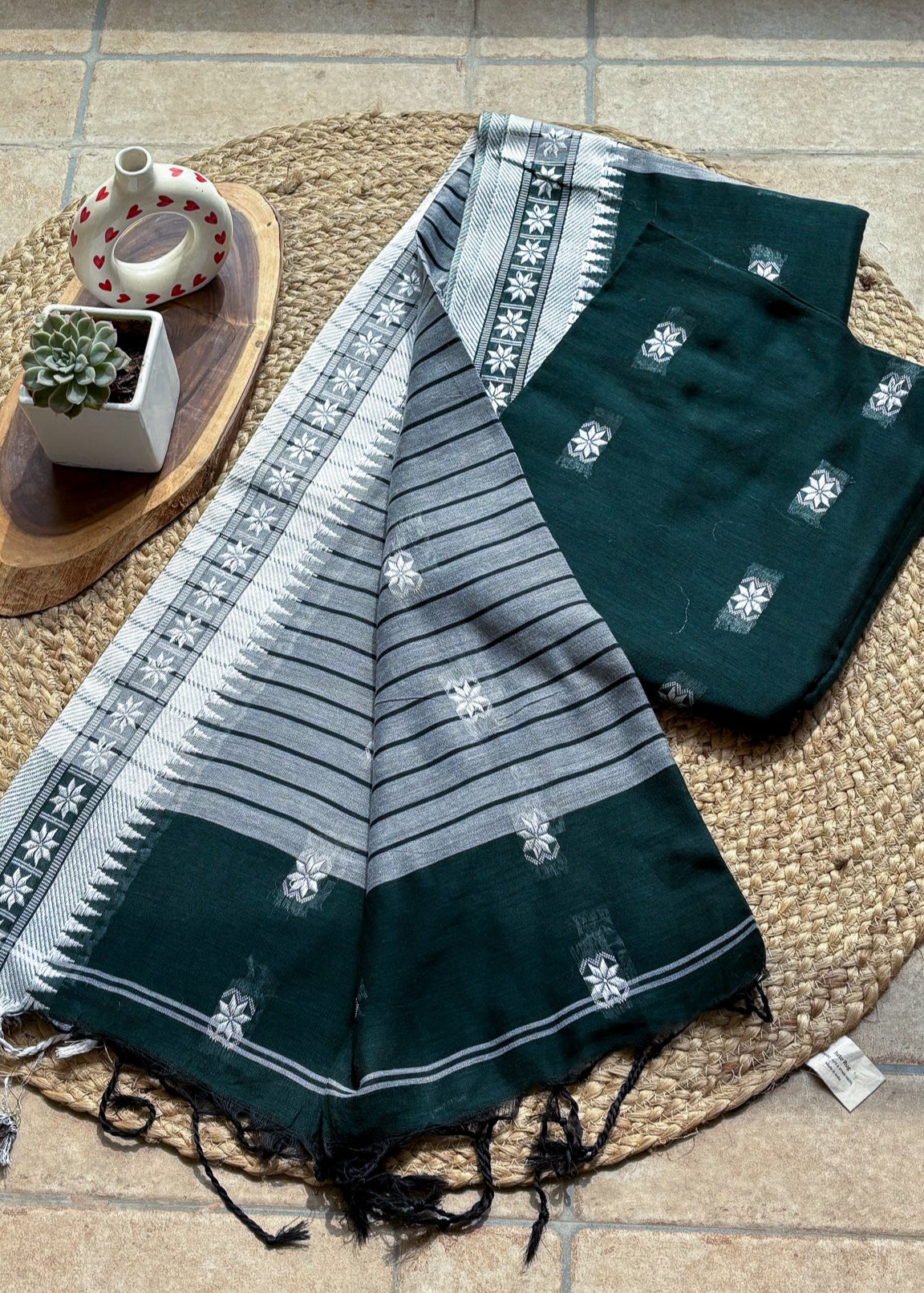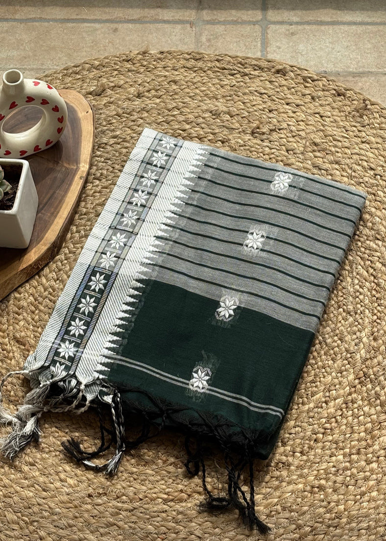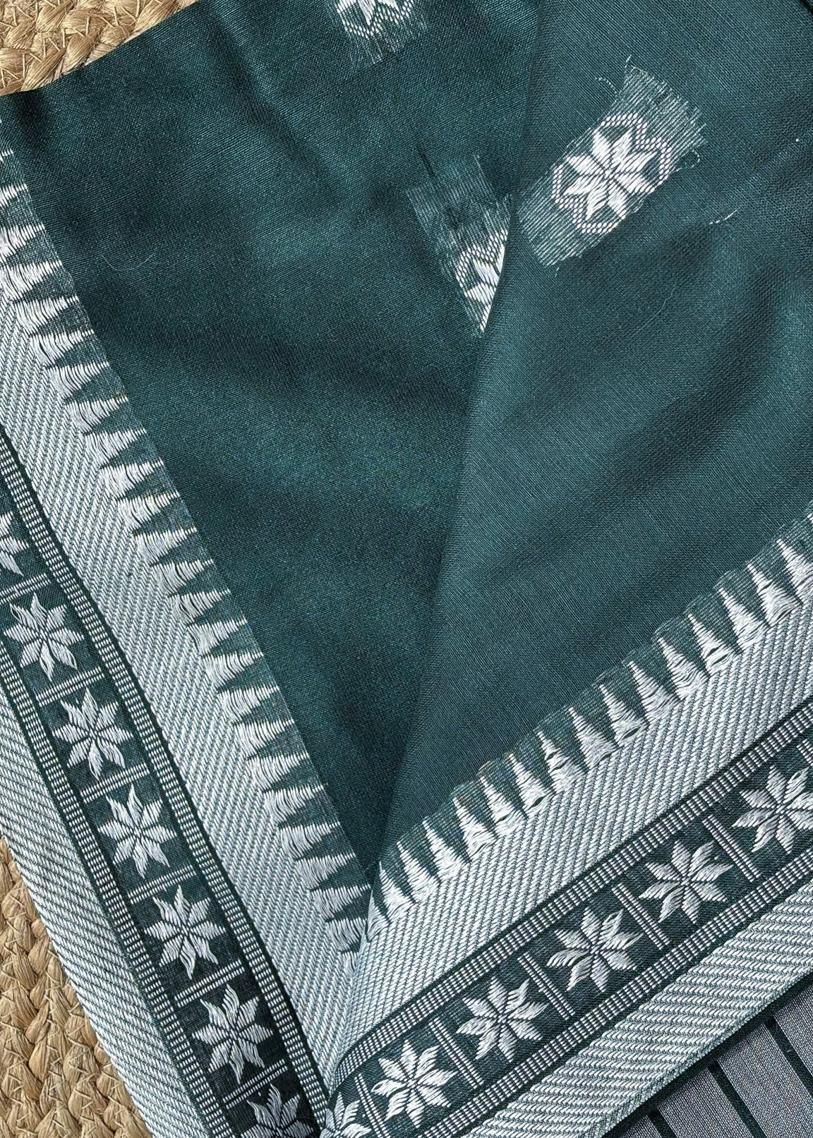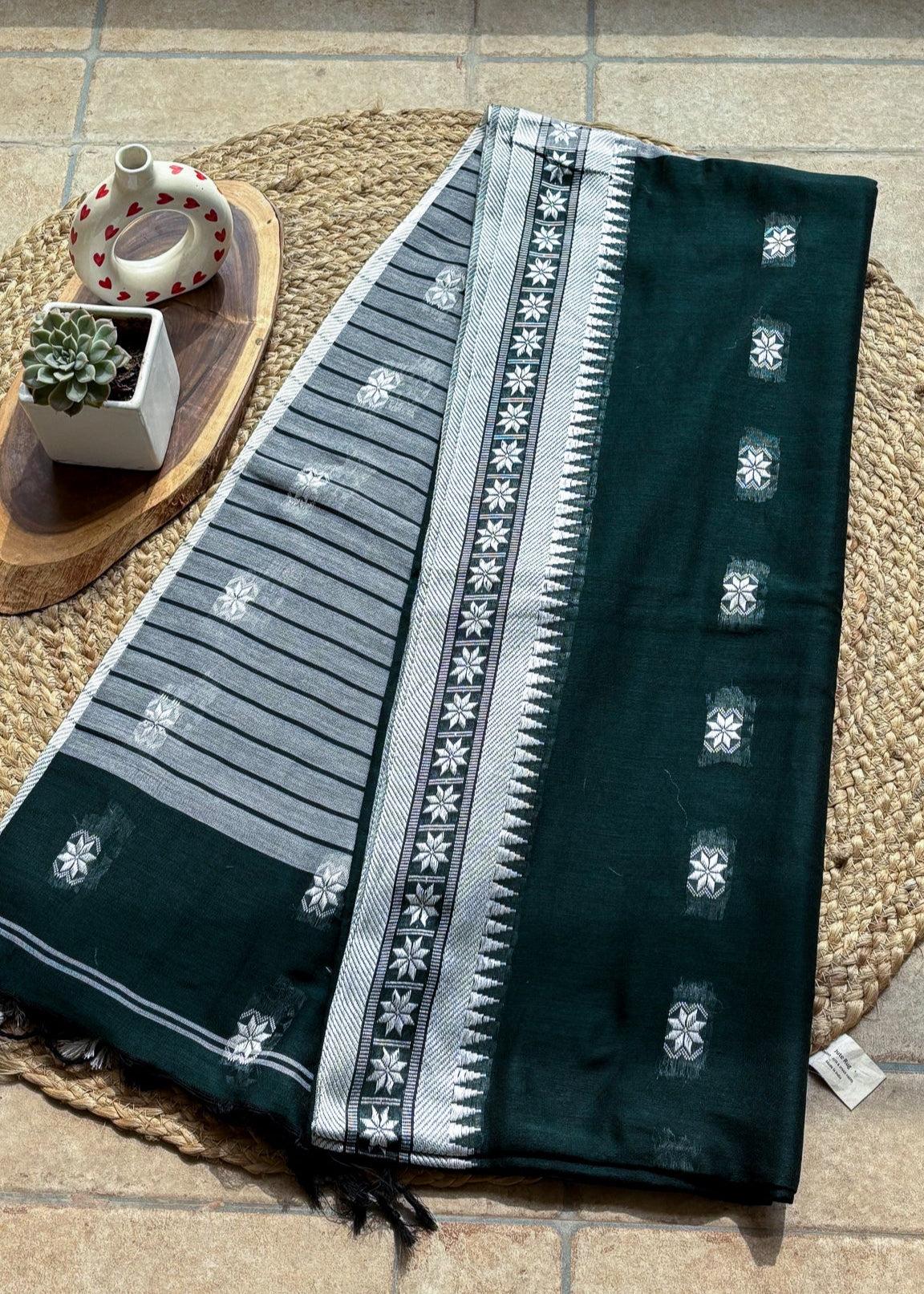 Exquisitely crafted Iravati Handloom Dark Green saree, meticulously hand-woven on traditional looms by skilled artisans. This elegant piece features a distinguished border and delicate buta motifs adorning the body, creating a sophisticated aesthetic. Complete with a matching blouse piece, this saree embodies timeless craftsmanship and refined elegance for discerning connoisseurs of authentic handloom textiles.