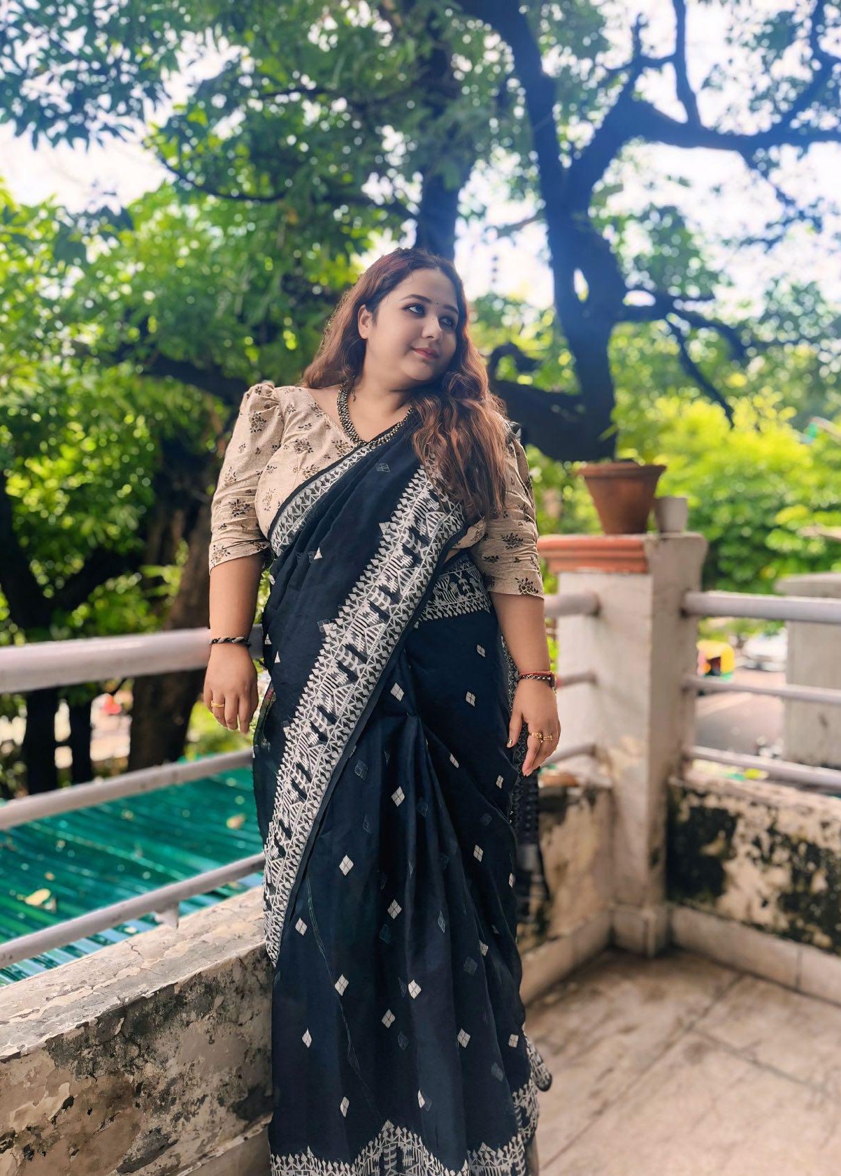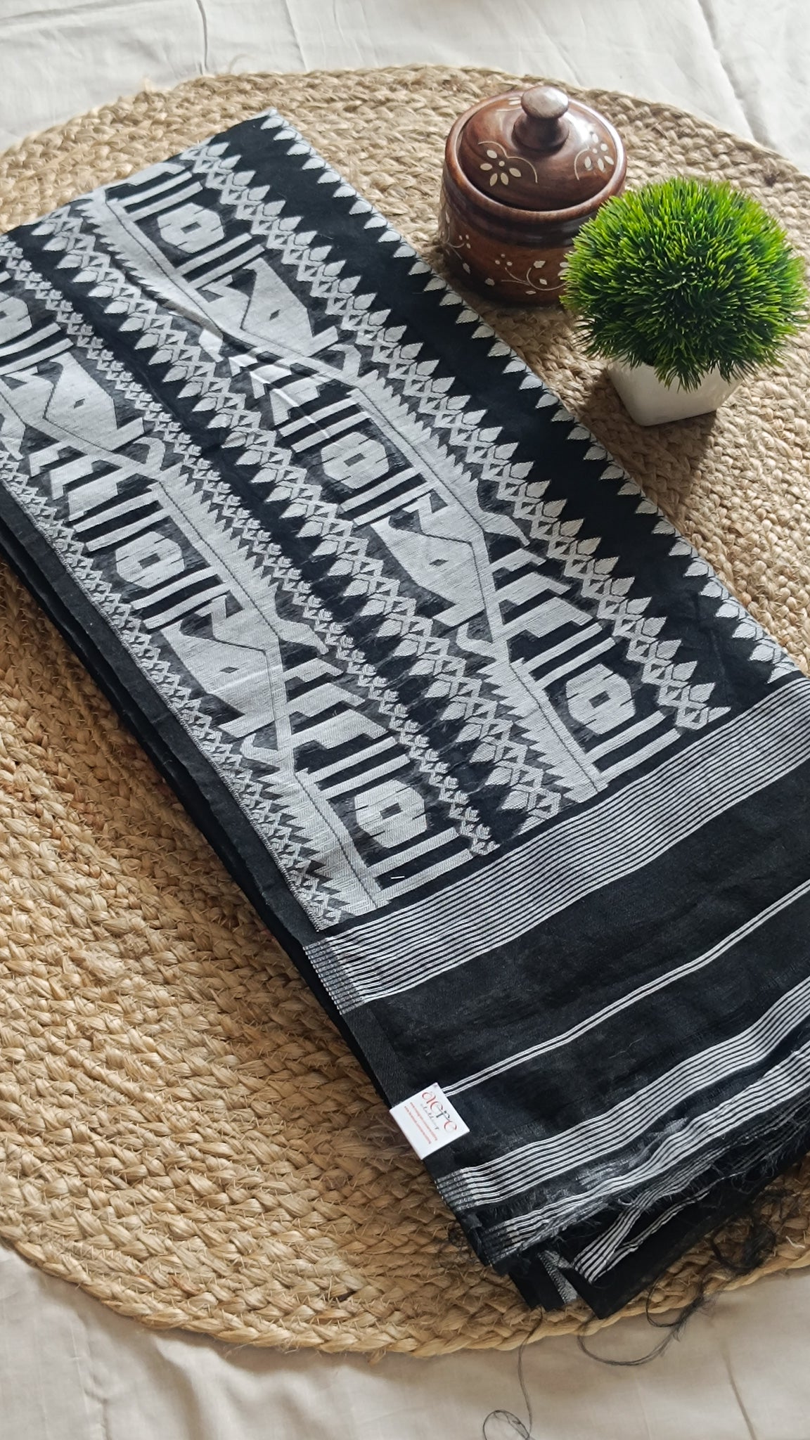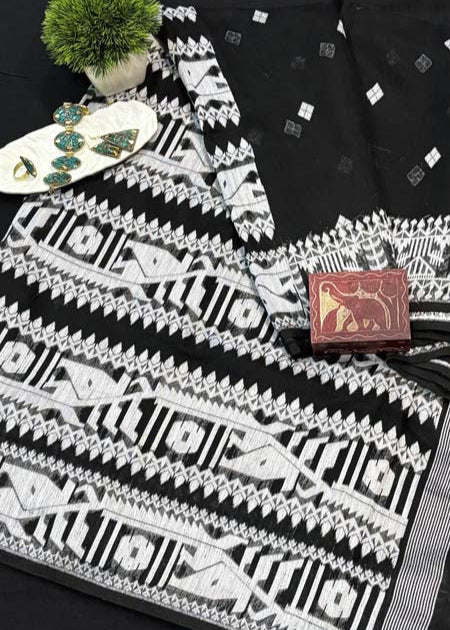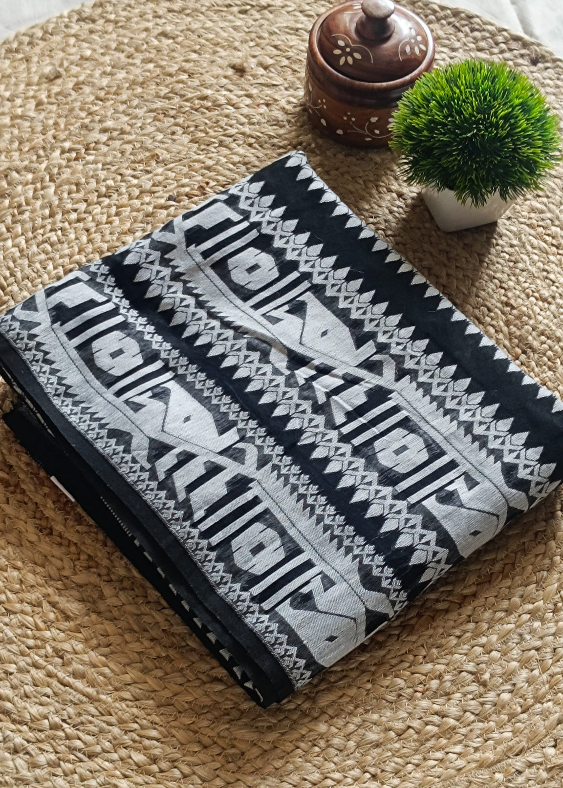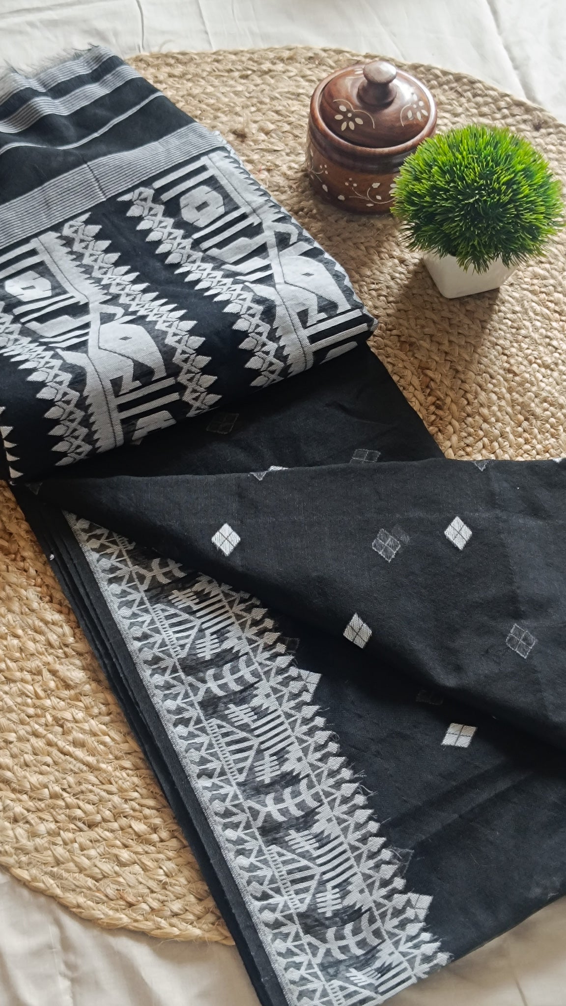 Elevate your wardrobe with our Black Jamdani, a masterpiece of textile artistry featuring intricate white geometric patterns. This sophisticated handwoven fabric combines traditional craftsmanship with contemporary design, creating a luxurious statement piece that transitions effortlessly from formal occasions to refined everyday wear.