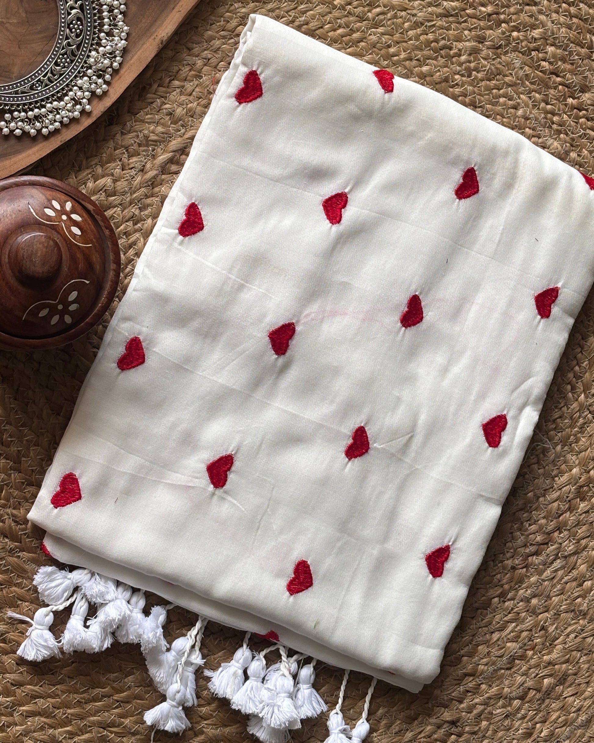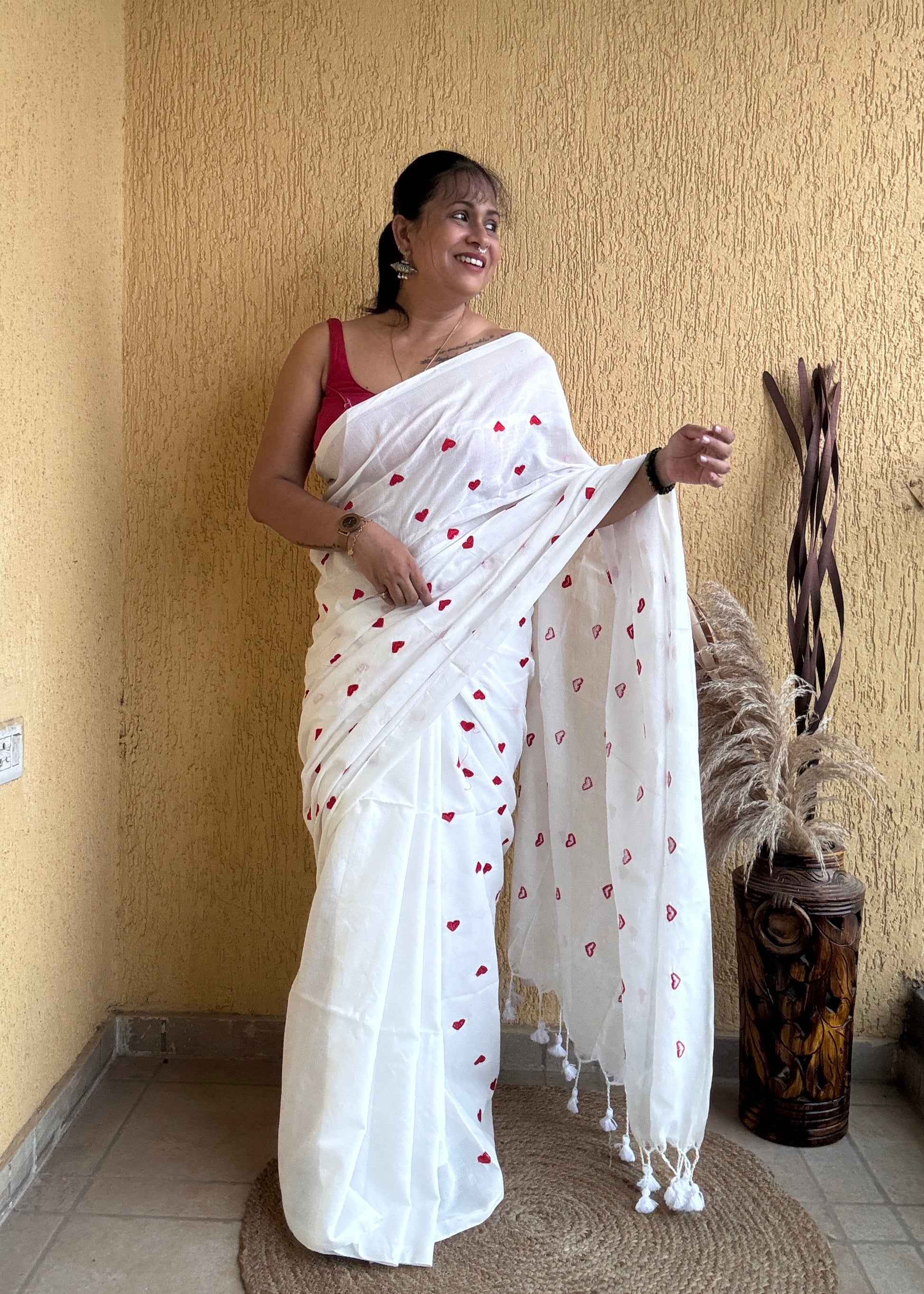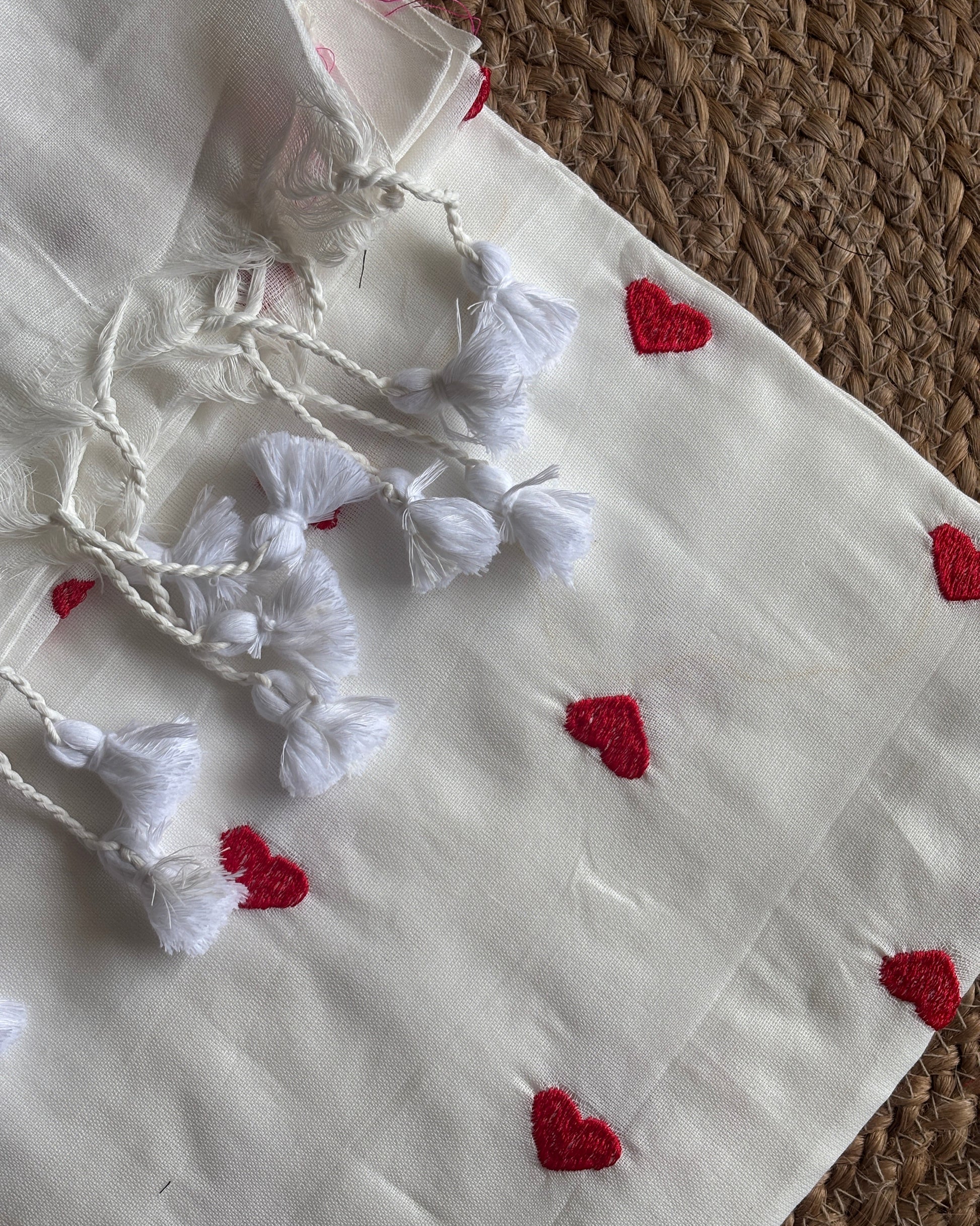 Experience the timeless elegance of our White & Red Love Khadi saree. Meticulously crafted from authentic khadi cotton, this sophisticated piece features delicate red love embroidery and tasteful tassels. The natural texture of khadi combines with artistic detailing to create a garment that honors traditional craftsmanship while offering refined contemporary style.