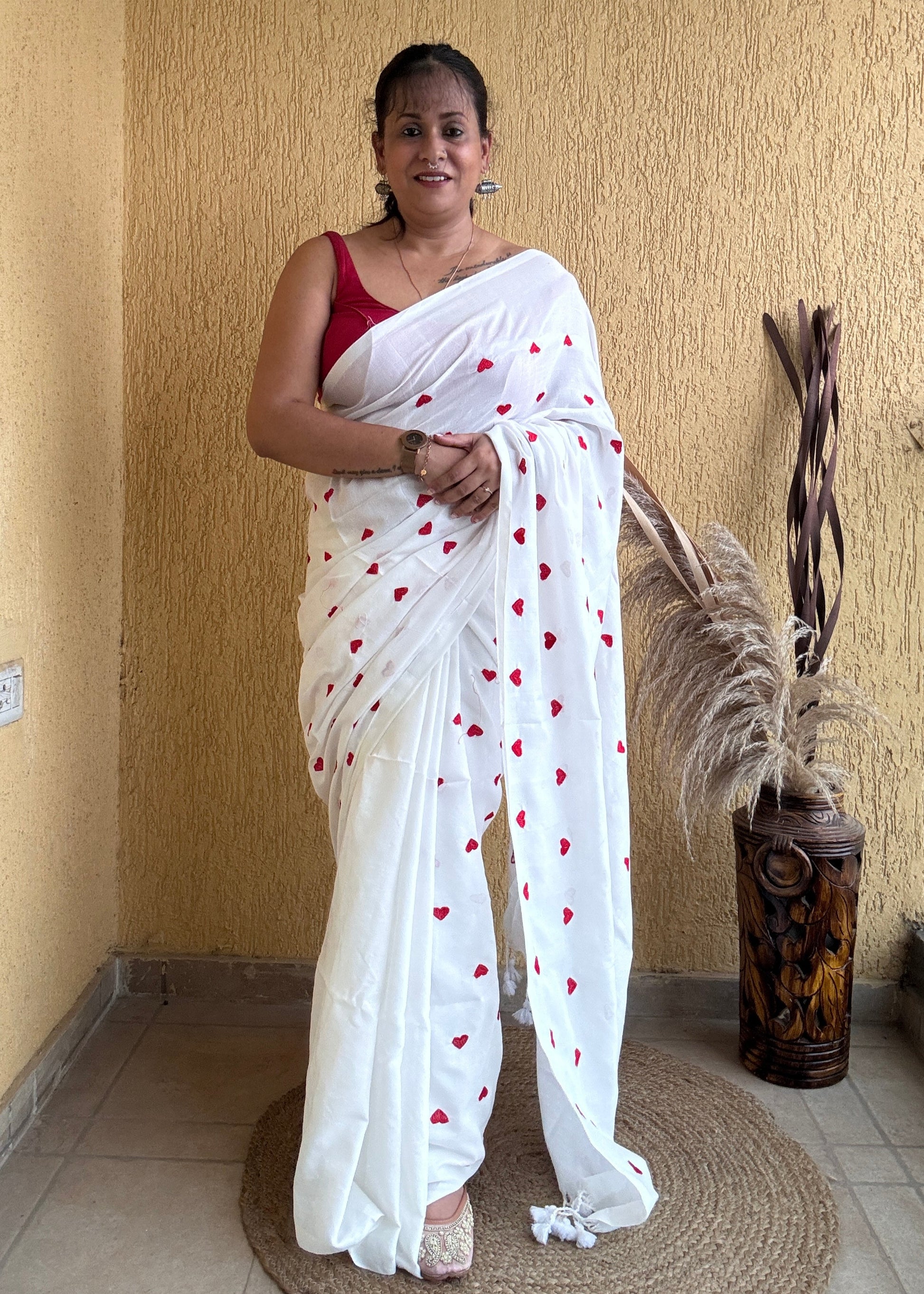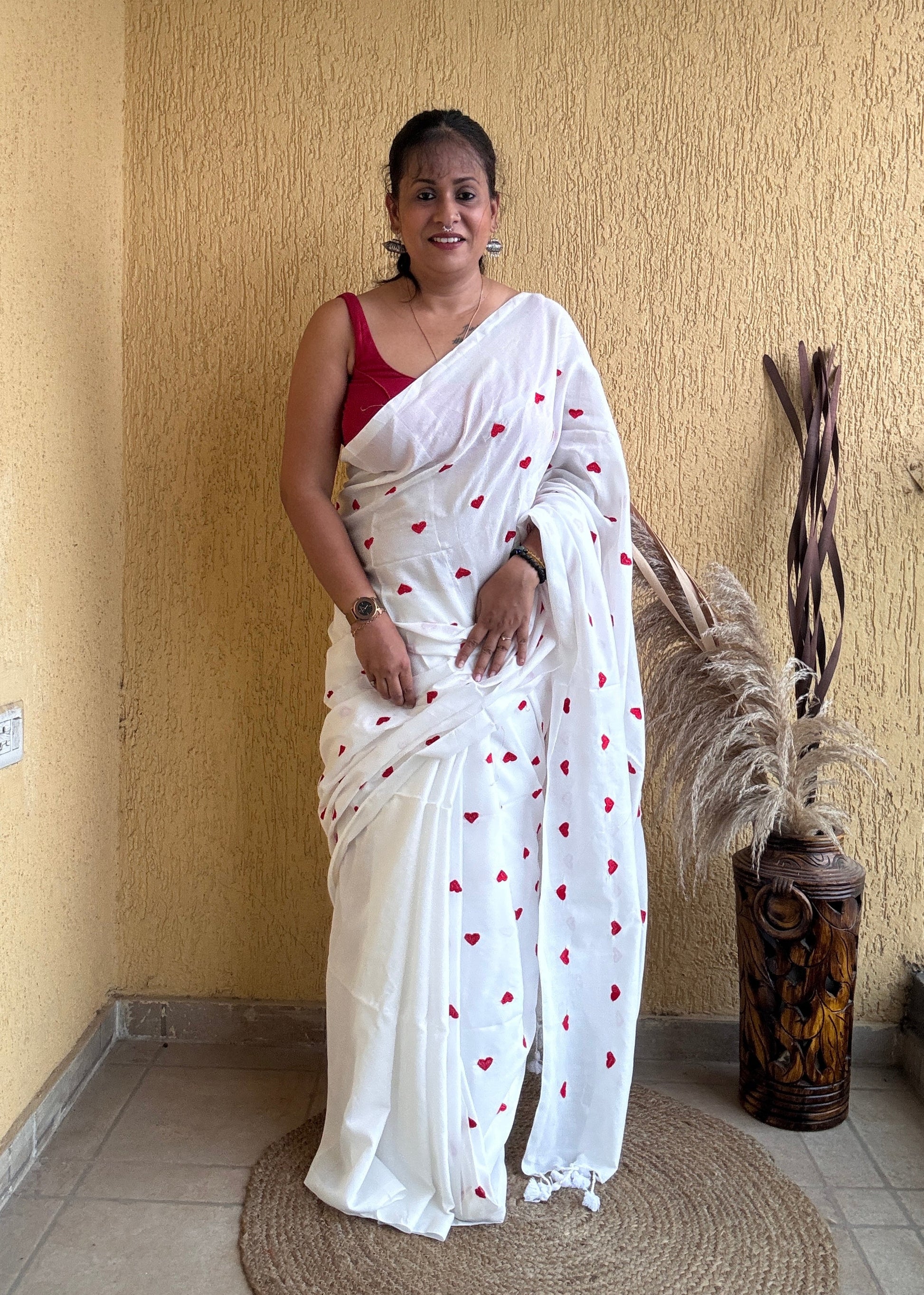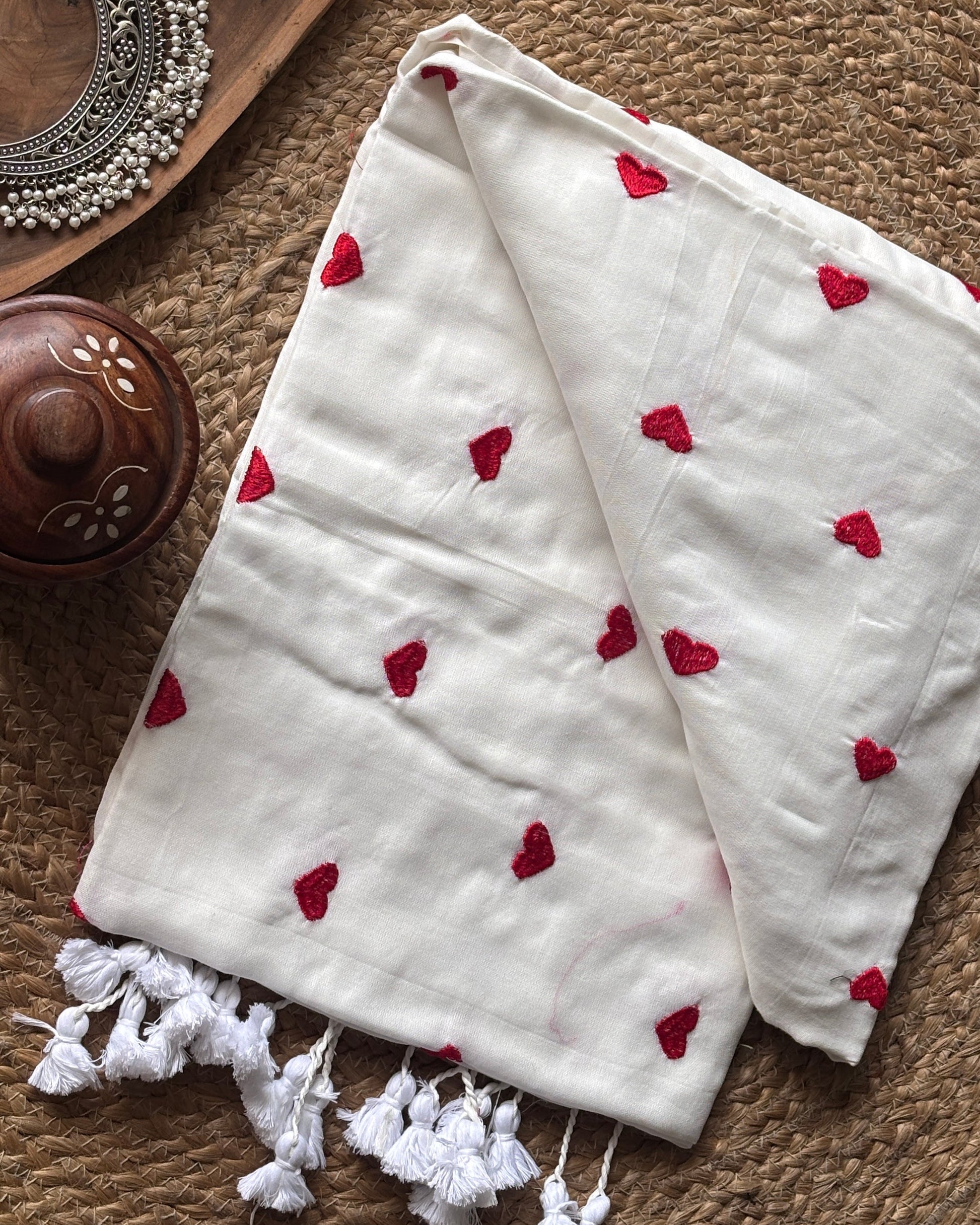 Experience the timeless elegance of our White & Red Love Khadi saree. Meticulously crafted from authentic khadi cotton, this sophisticated piece features delicate red love embroidery and tasteful tassels. The natural texture of khadi combines with artistic detailing to create a garment that honors traditional craftsmanship while offering refined contemporary style.