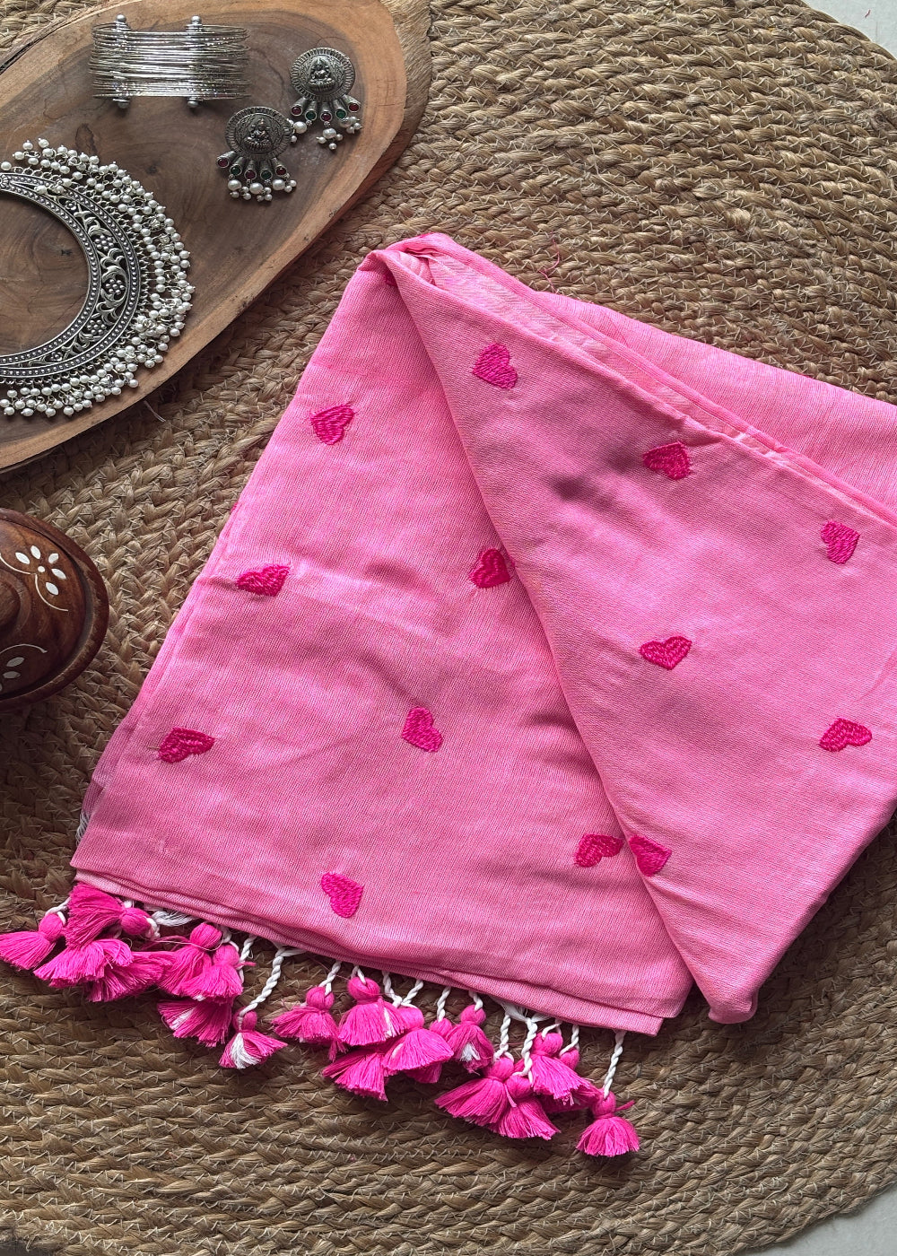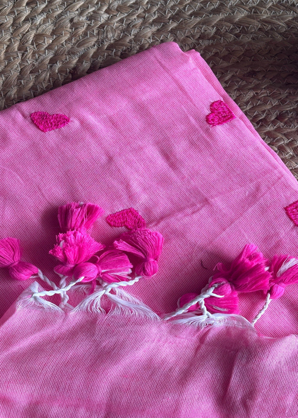 Experience the refined allure of our Pink Love Khadi saree, expertly handcrafted from authentic khadi cotton. This distinguished piece showcases exquisite red love embroidery that creates a striking contrast against the soft pink backdrop. Adorned with elegant tassels that sway with graceful movement, this saree embodies artisanal craftsmanship and timeless sophistication for the discerning connoisseur.