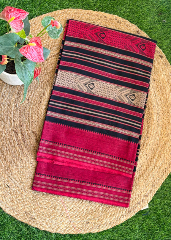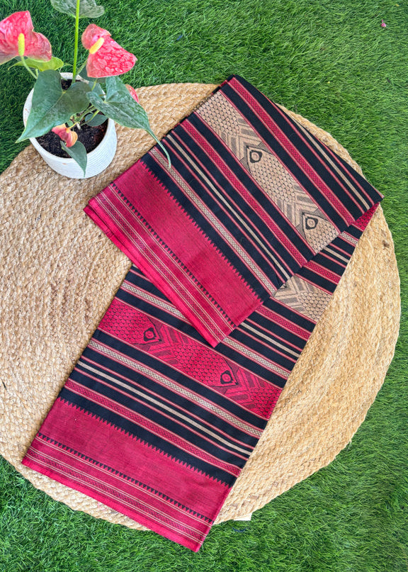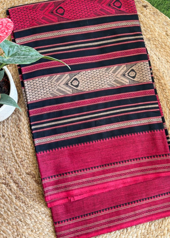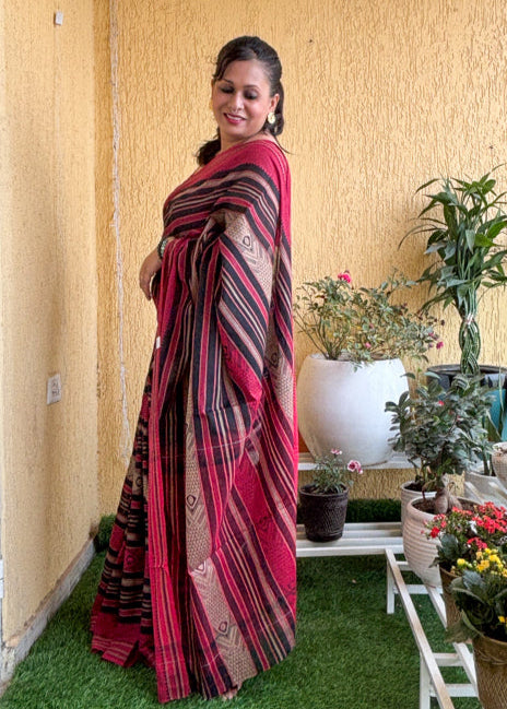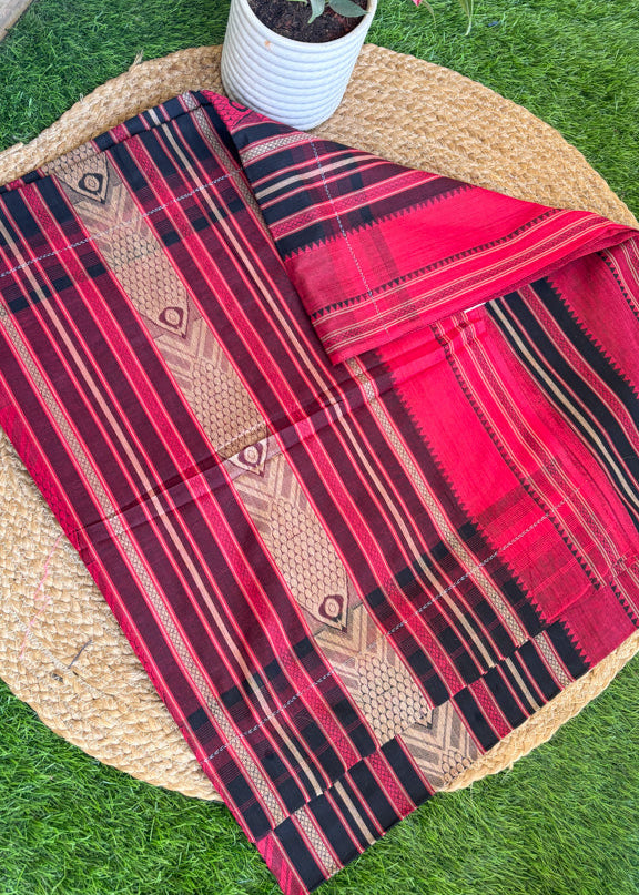 Handwoven in 100% cotton with a 120 thread count, this Dhonekhali saree carries Bengal’s weaving legacy of over 150 years. The striking play of bold stripes is elevated with woven meen (fish) motifs — a timeless symbol of prosperity and grace. Lightweight, breathable, and effortlessly elegant, this saree is crafted for those who love heritage with a statement edge.