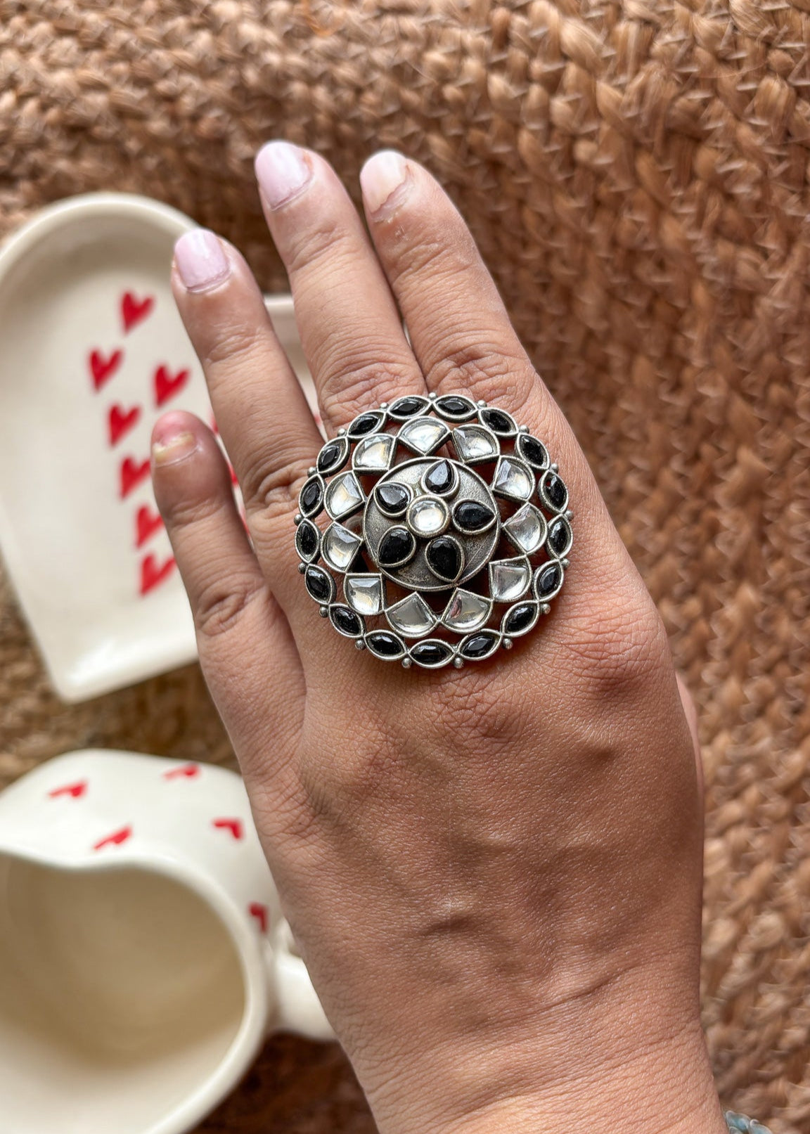 Bold and regal, the Meher Dome Rings are handcrafted statement pieces designed in a signature dome silhouette with intricate mirror work and teardrop enamel detailing. Available in four striking color variants—onyx black, emerald green, turquoise blue, and ruby pink—these rings blend traditional charm with contemporary scale. A celebration of festive grandeur and artisanal craft, each piece commands attention while staying rooted in heritage aesthetics. Ideal for pairing with both ethnic ensembles and fusion wear.