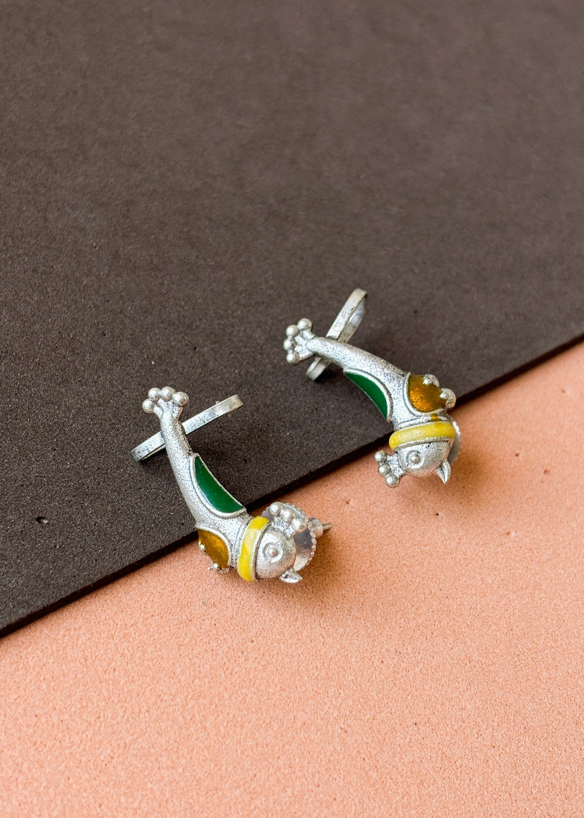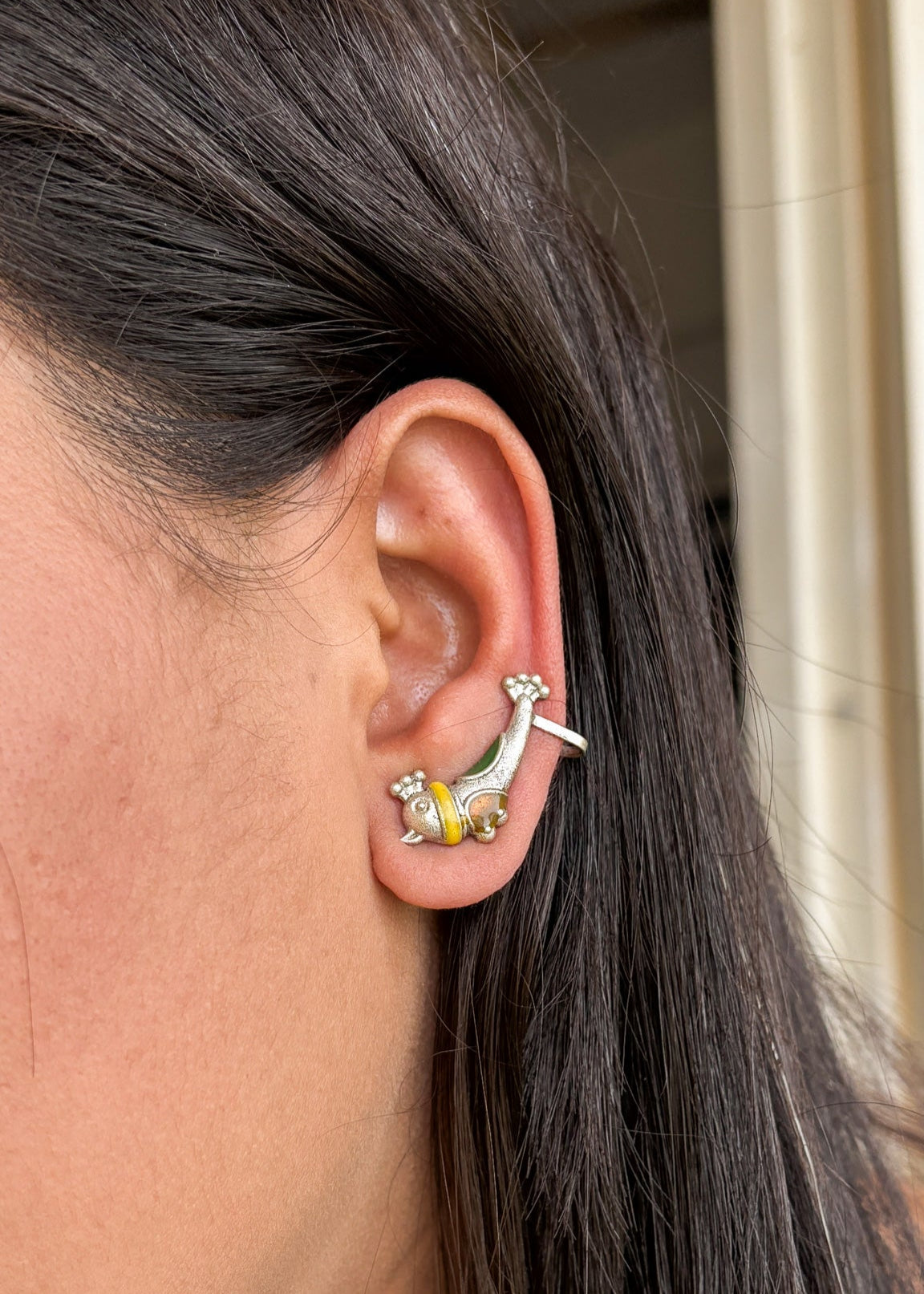 A silver replica ear cuff adorned with vibrant minakari work in shades of yellow and green, shaped like an intricately crafted bird. The detailed crown and tail accents add a regal charm, while the enamel colors bring a playful pop, making it a perfect fusion of traditional craftsmanship and modern flair.