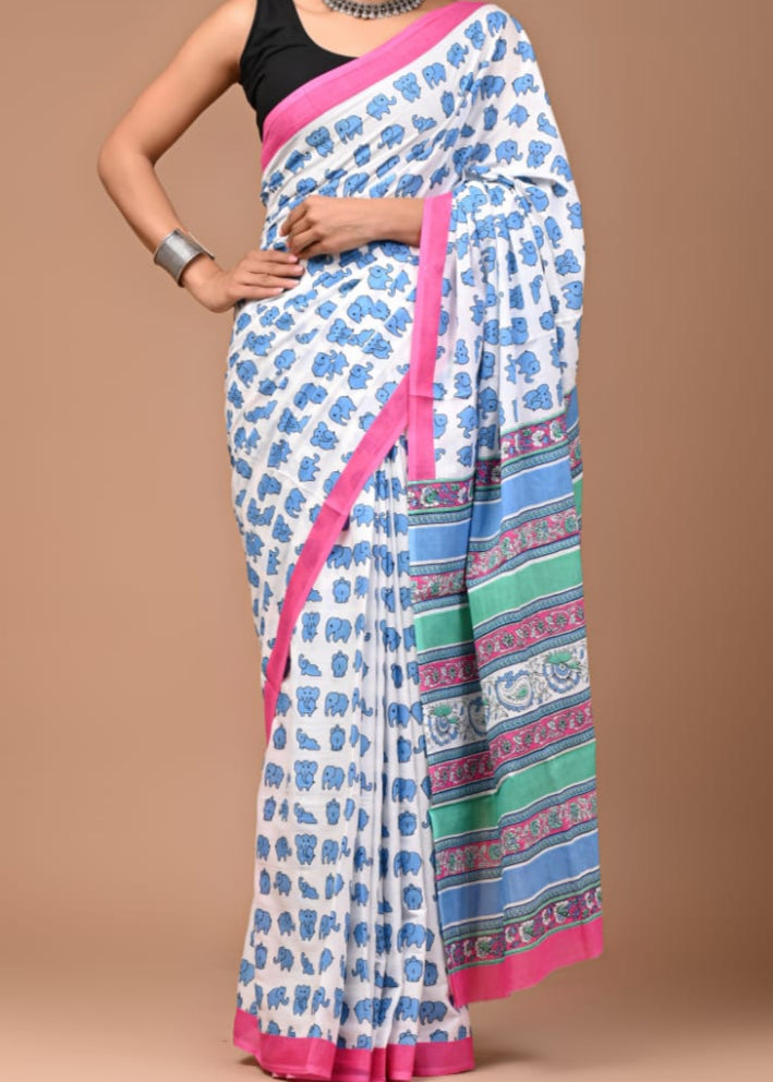 Elevate your ethnic wardrobe with our exquisite white mul saree adorned with a delicate pink border. The distinctive blue elephant block print adds a touch of artistic charm, while the vibrant, colorful pallu creates a sophisticated contrast. This handcrafted piece seamlessly blends traditional craftsmanship with contemporary elegance, perfect for both festive occasions and curated collections.
