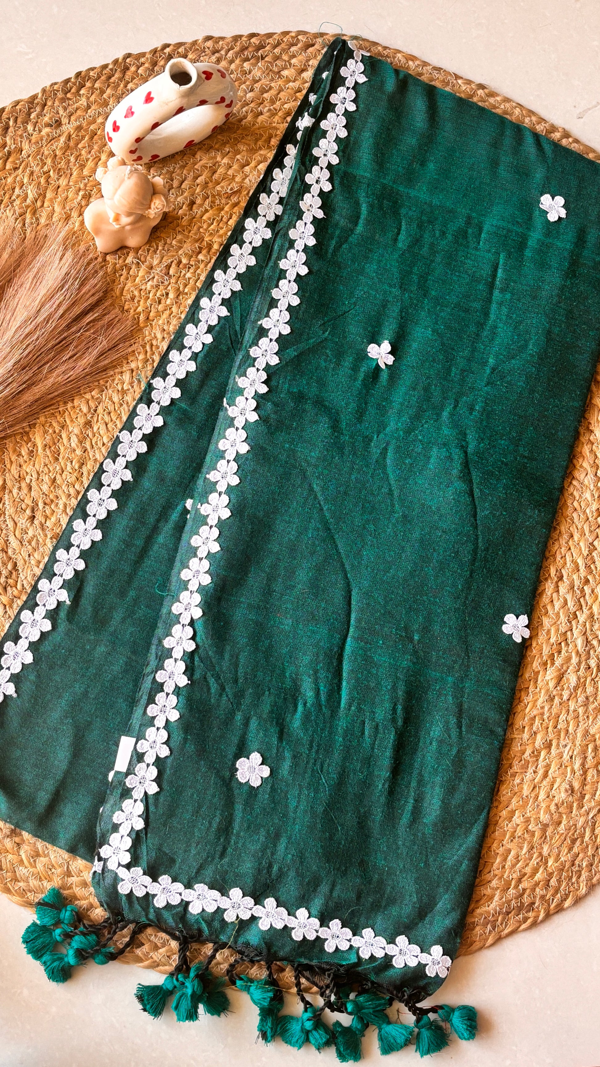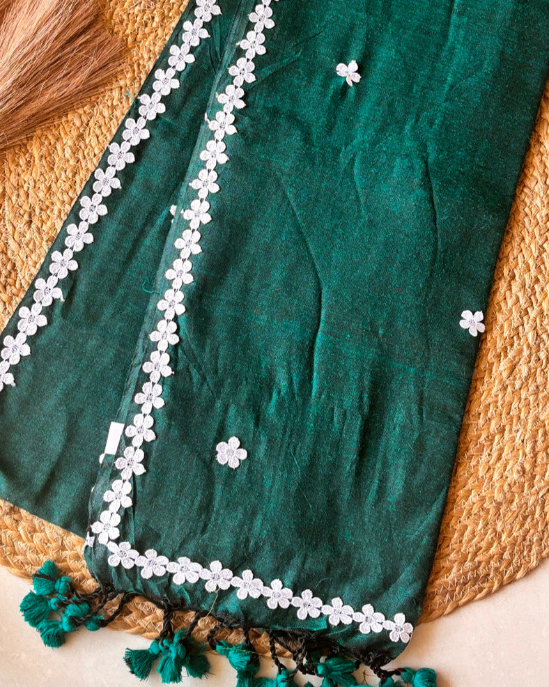 Elevate your ethnic wardrobe with our exquisite Nayantara Khadi Teal Green saree. This handcrafted handloom masterpiece features delicate white flower motif lace detailing and intricate lace butas elegantly dispersed throughout the fabric. The playful pompom embellishments add a refined touch of whimsy to this sophisticated traditional ensemble, perfect for both special occasions and curated collections.