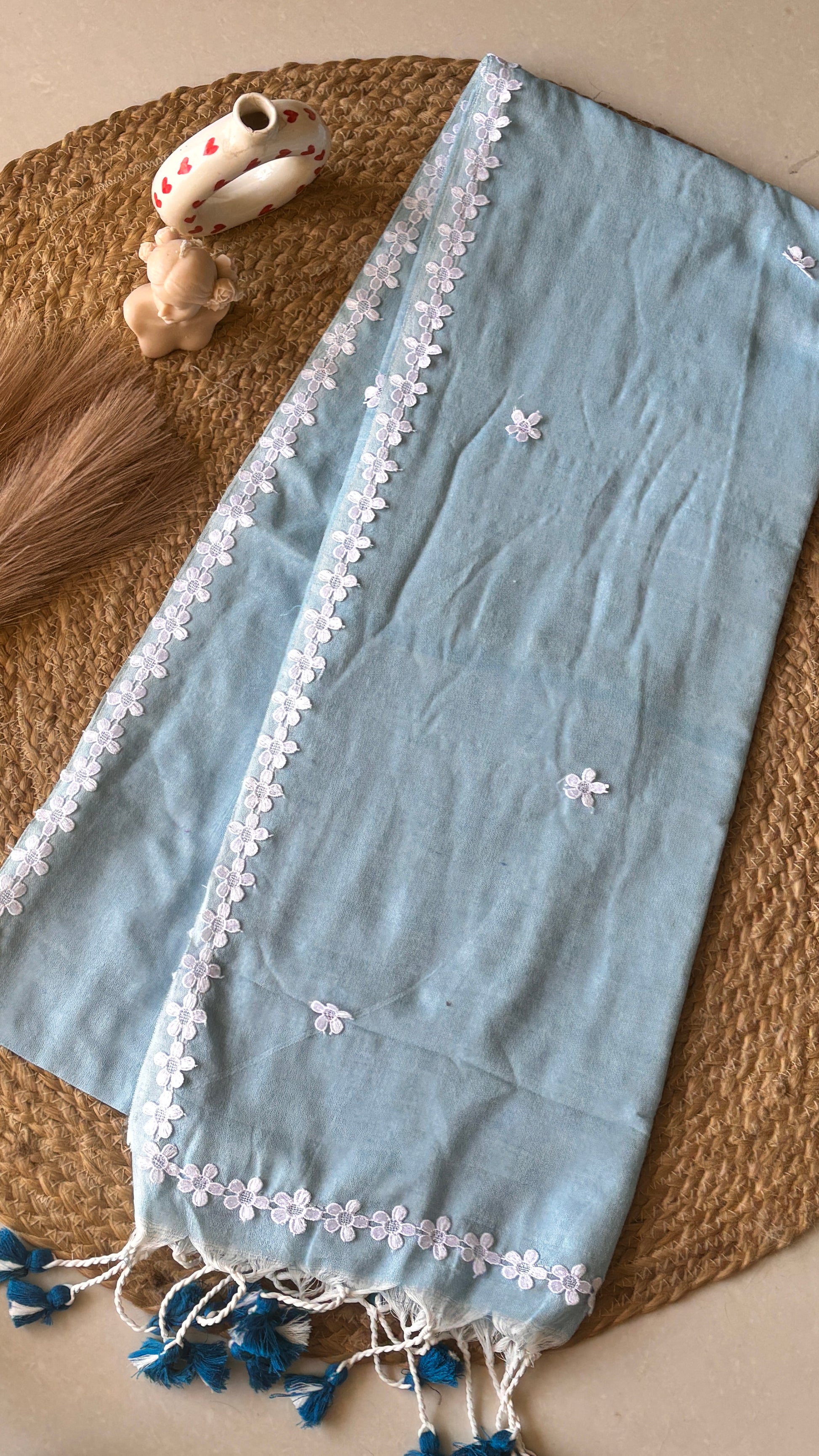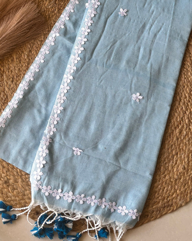 Elevate your ethnic wardrobe with our exquisite Nayantara Khadi Sky Blue saree. This handcrafted handloom masterpiece features delicate white flower motif lace detailing and intricate lace butas elegantly dispersed throughout the fabric. The playful pompom embellishments add a refined touch of whimsy to this sophisticated traditional ensemble, perfect for both special occasions and curated collections.