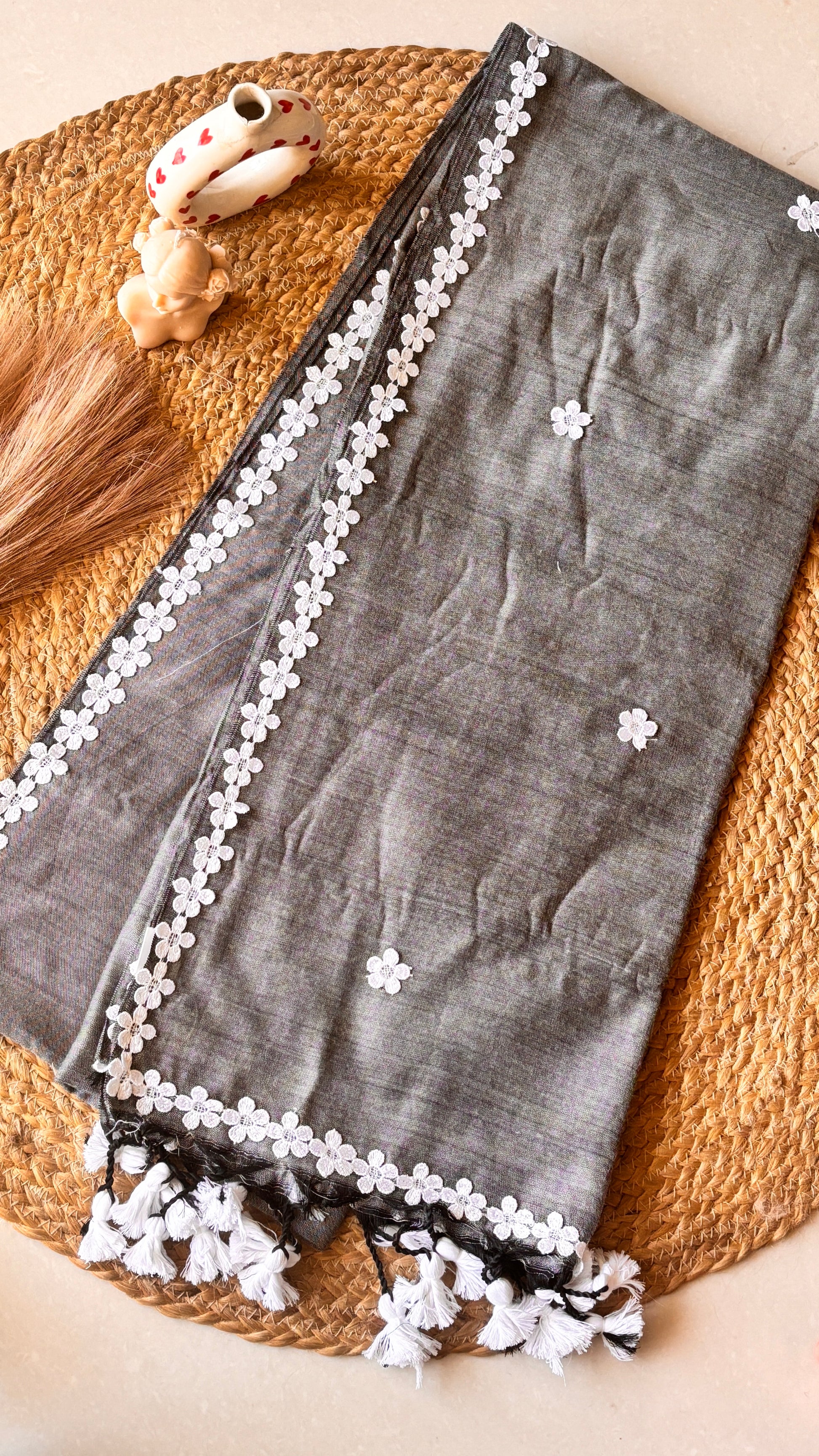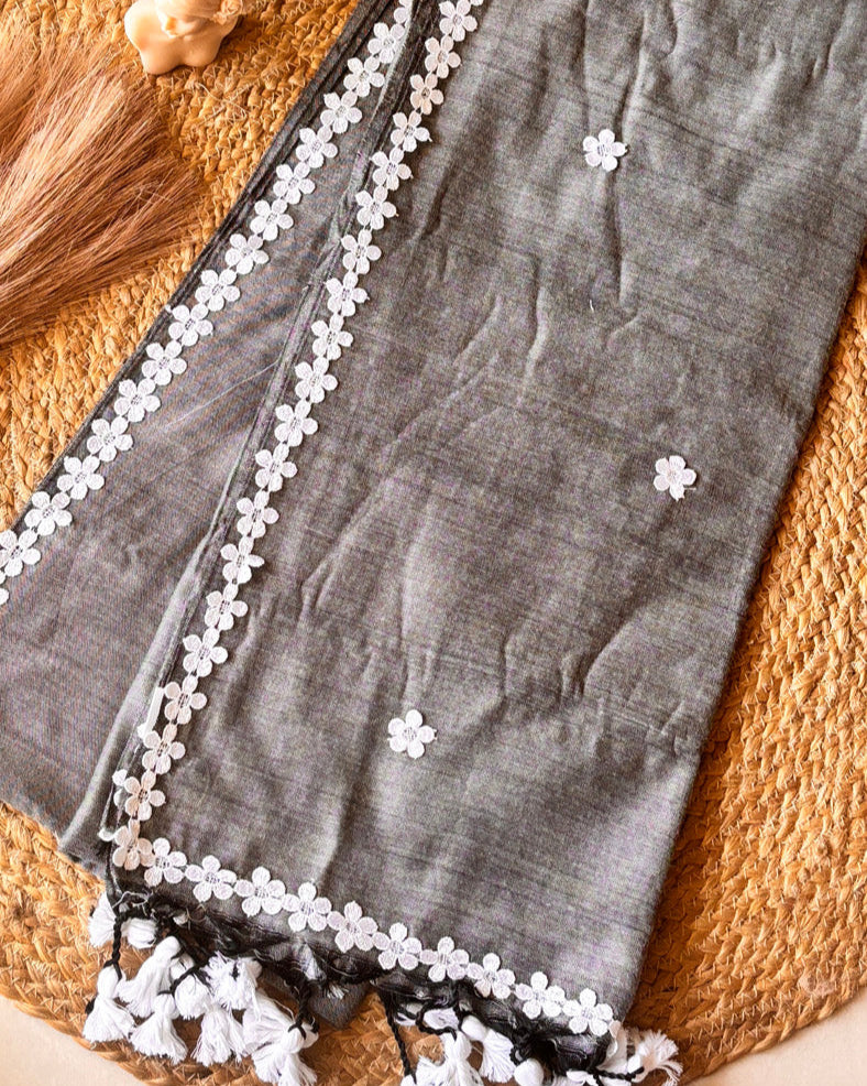 Elevate your ethnic wardrobe with our exquisite Nayantara Khadi Gray saree. This handcrafted handloom masterpiece features delicate white flower motif lace detailing and intricate lace butas elegantly dispersed throughout the fabric. The playful pompom embellishments add a refined touch of whimsy to this sophisticated traditional ensemble, perfect for both special occasions and curated collections.