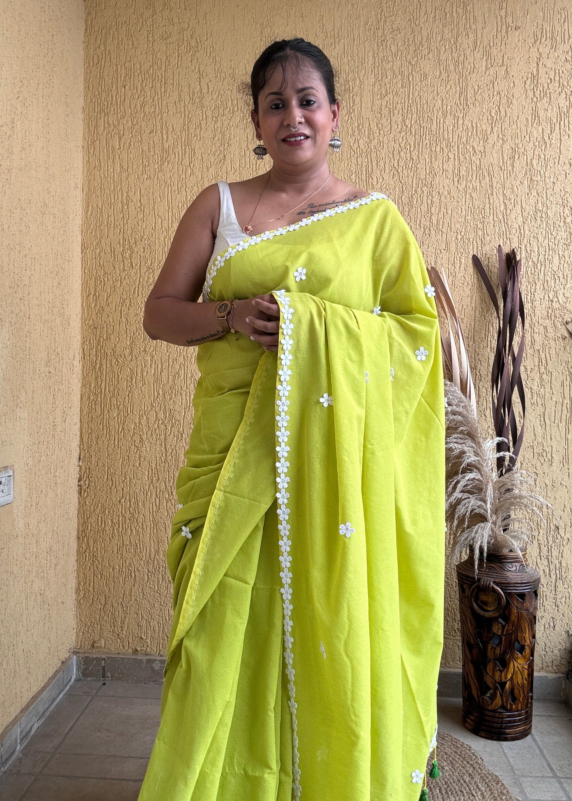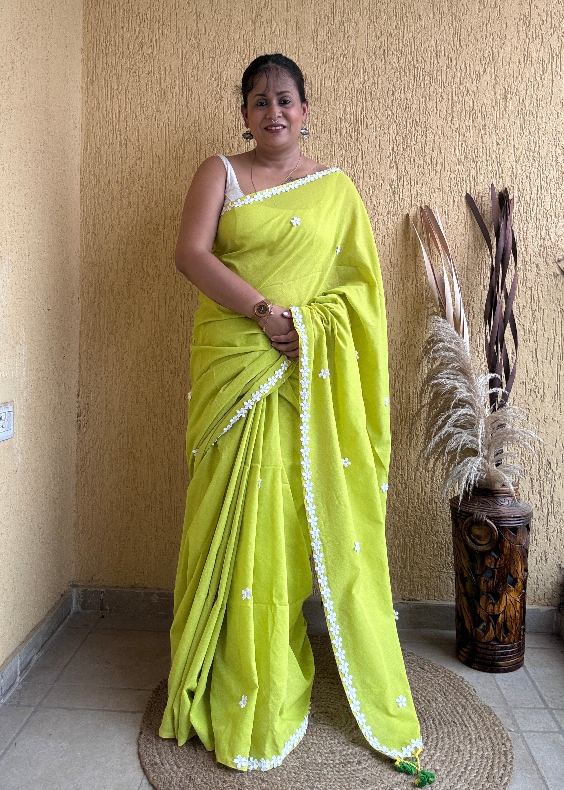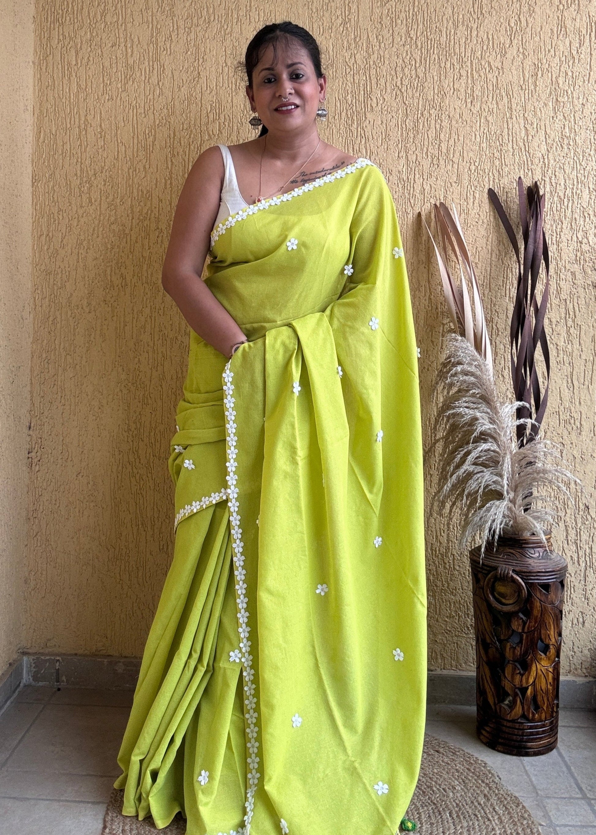 Refine your ethnic wardrobe with the stunning Nayantara Khadi Lime Green saree. This handcrafted handloom creation is adorned with delicate white flower motif lace and intricately placed lace butas throughout the fabric. Playful pompom accents lend a subtle, whimsical charm to this elegant traditional ensemble, making it an ideal choice for special occasions and curated collections.