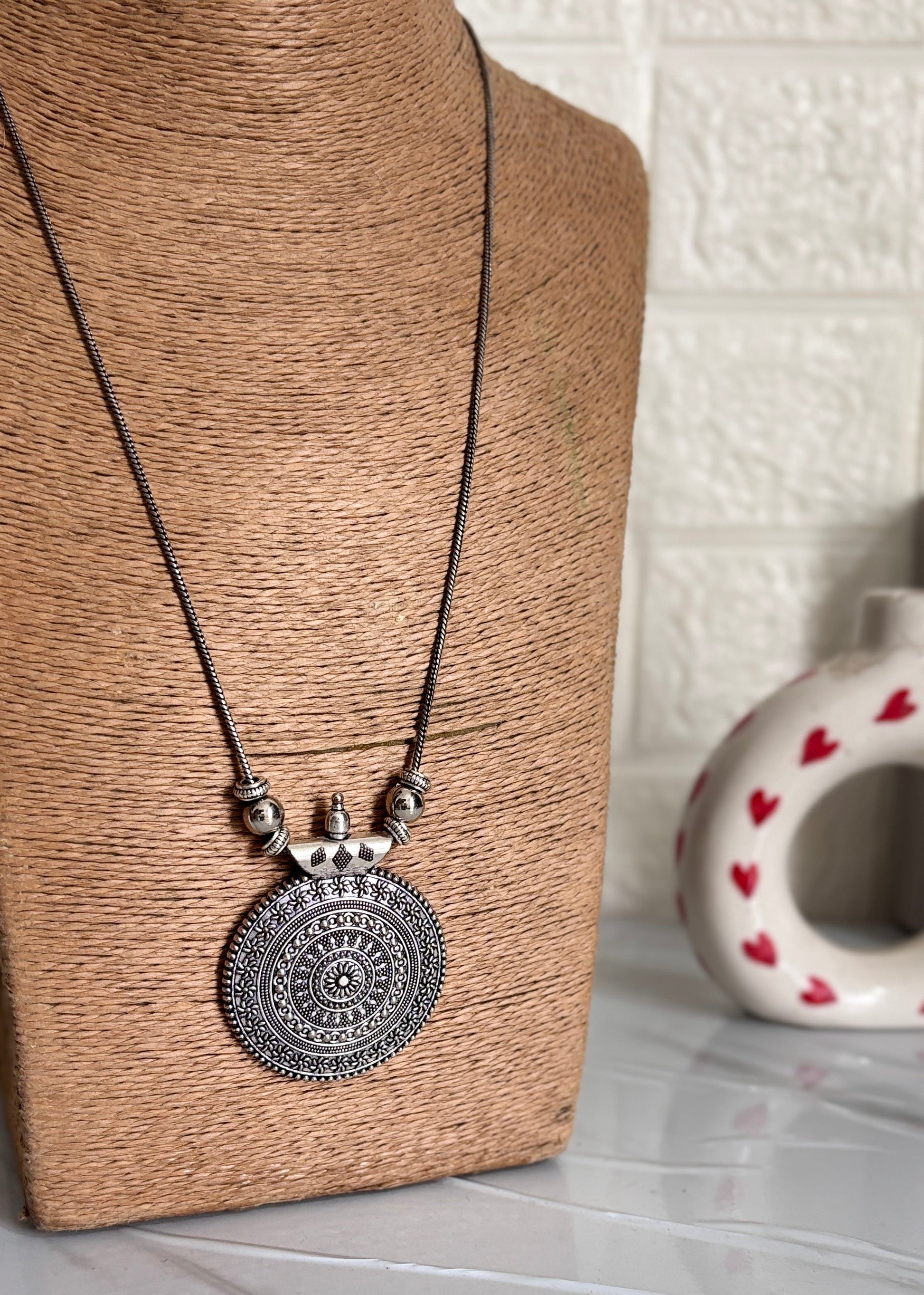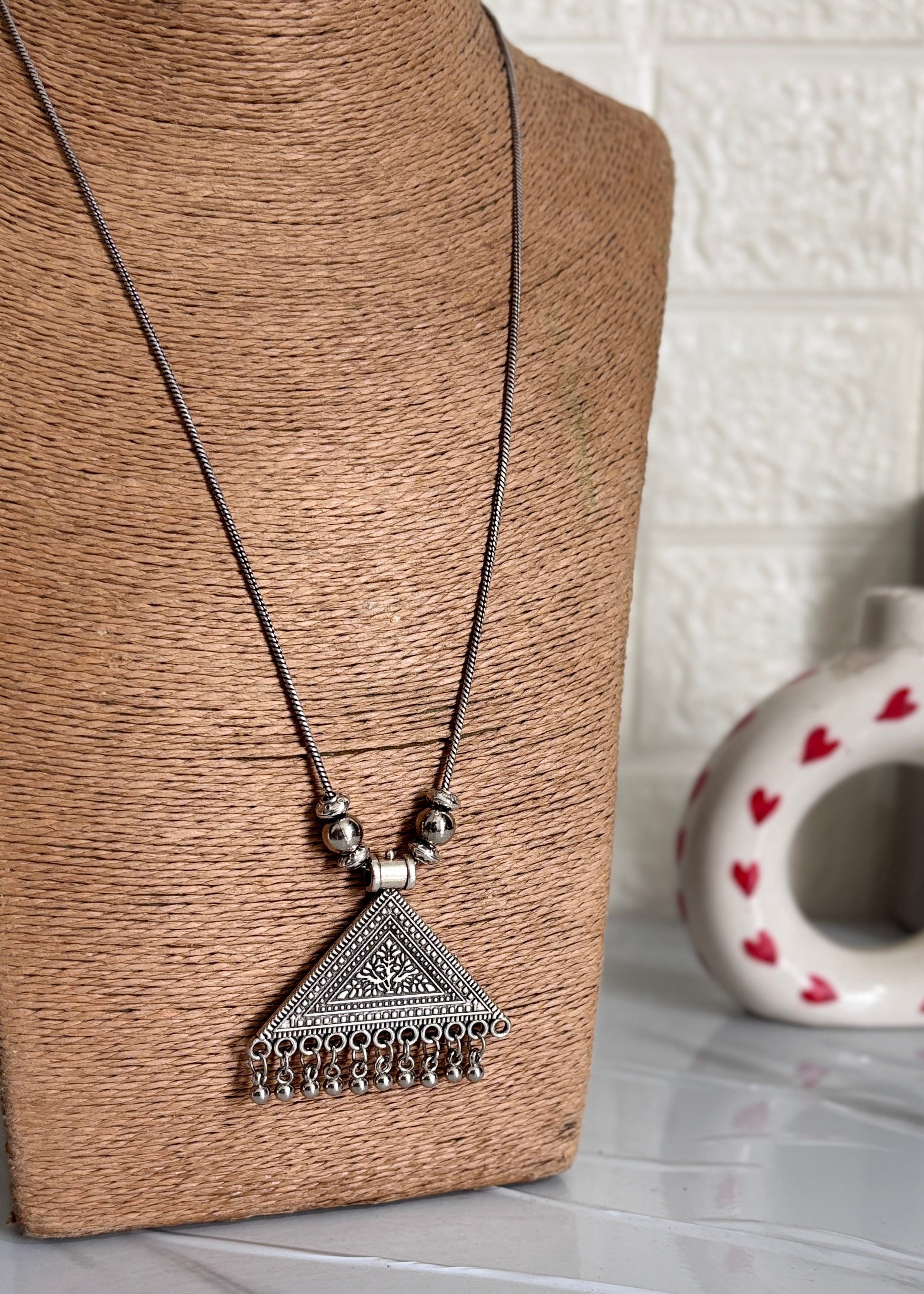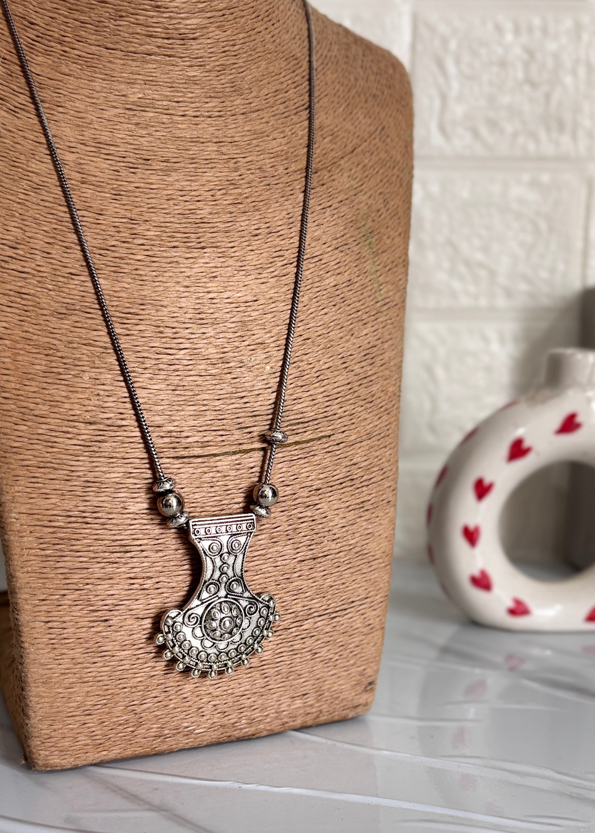 A timeless blend of tradition and everyday charm, our Nazaakat oxidized necklace features a range of intricately crafted pendants—each unique in design yet rooted in the same aesthetic elegance. Strung on a sturdy yet graceful metallic chain, every piece is adorned with antique-finish detailing and delicate silver-toned beads. Whether it's a floral motif or geometric form, each pendant tells its own subtle story.