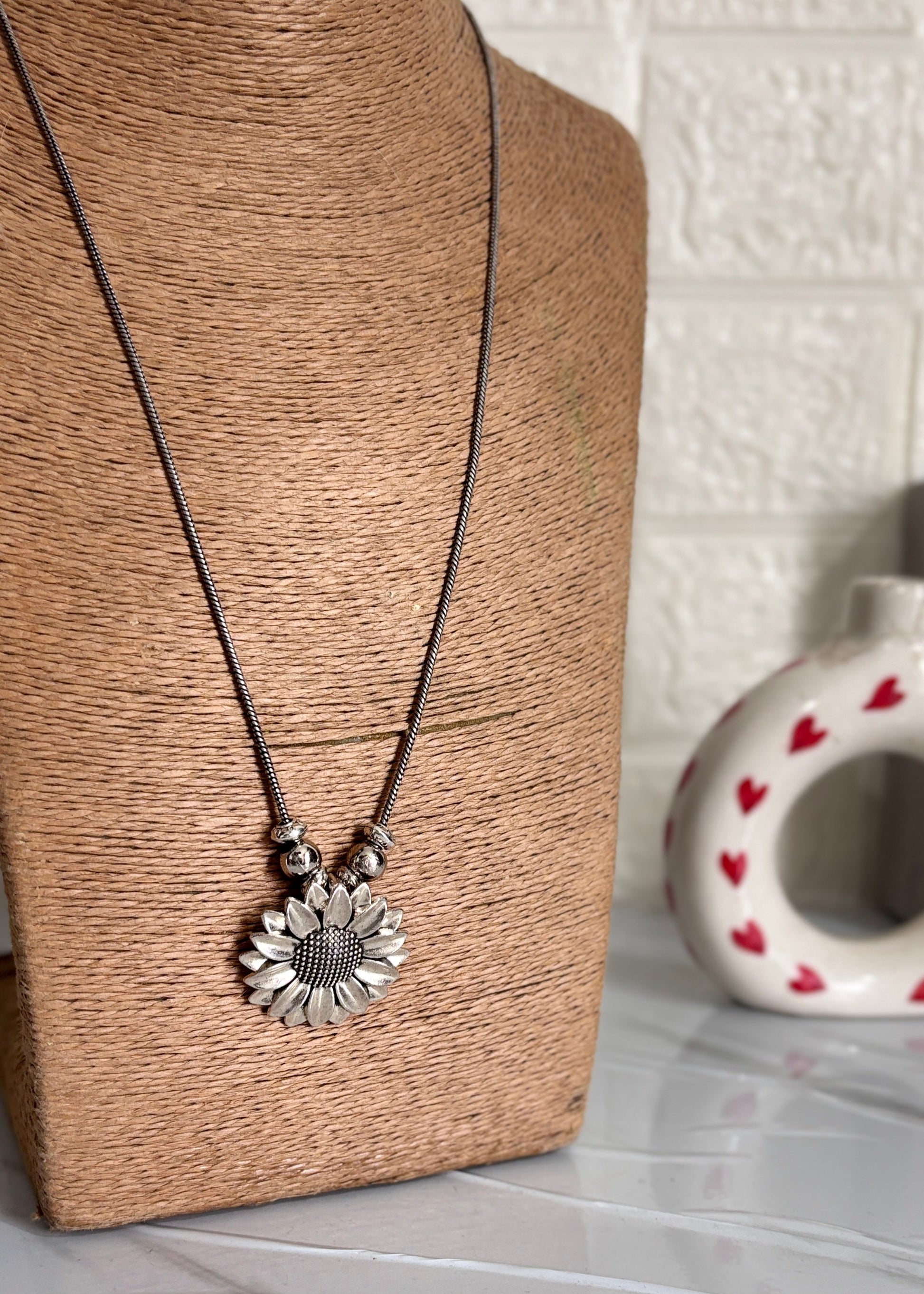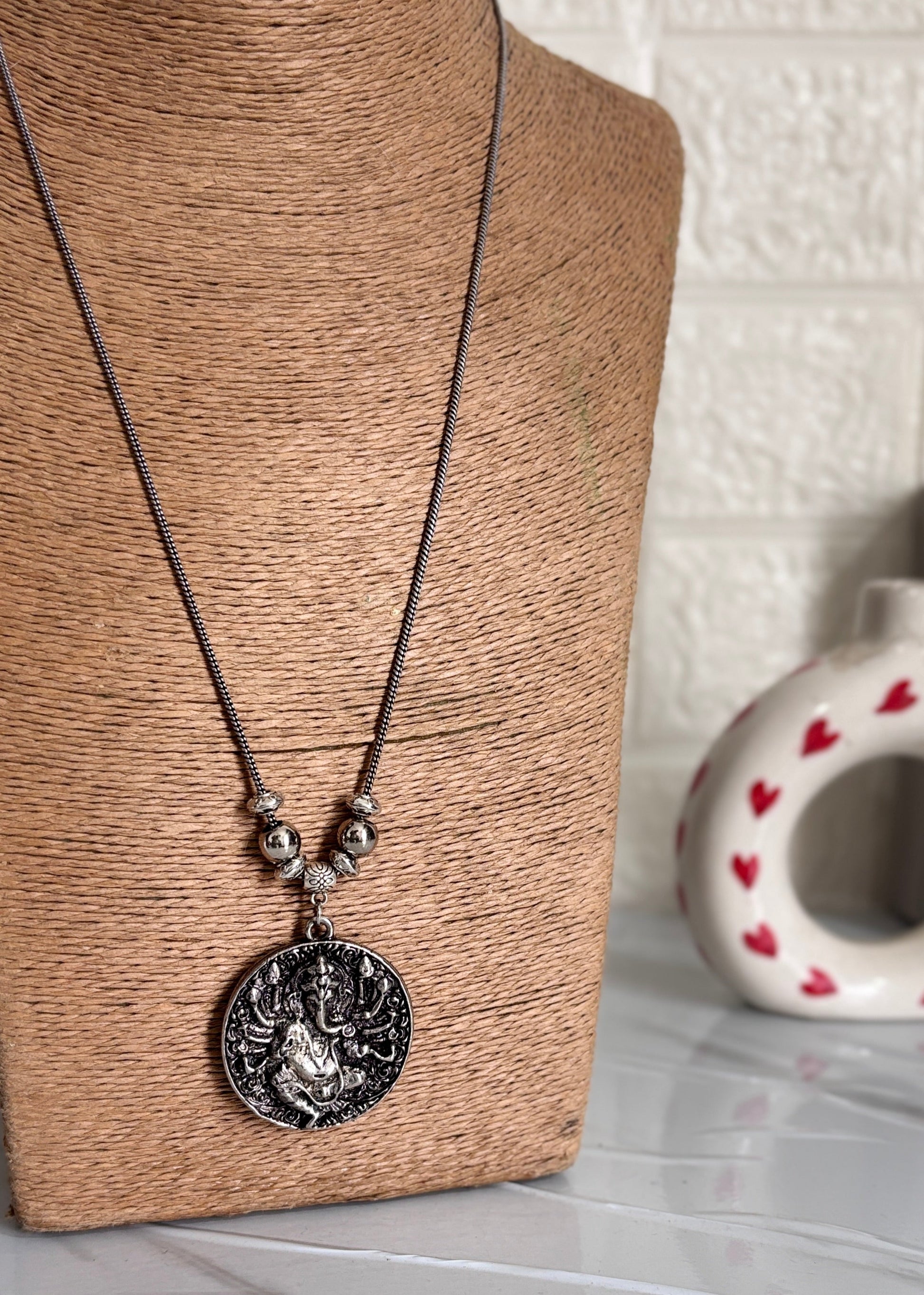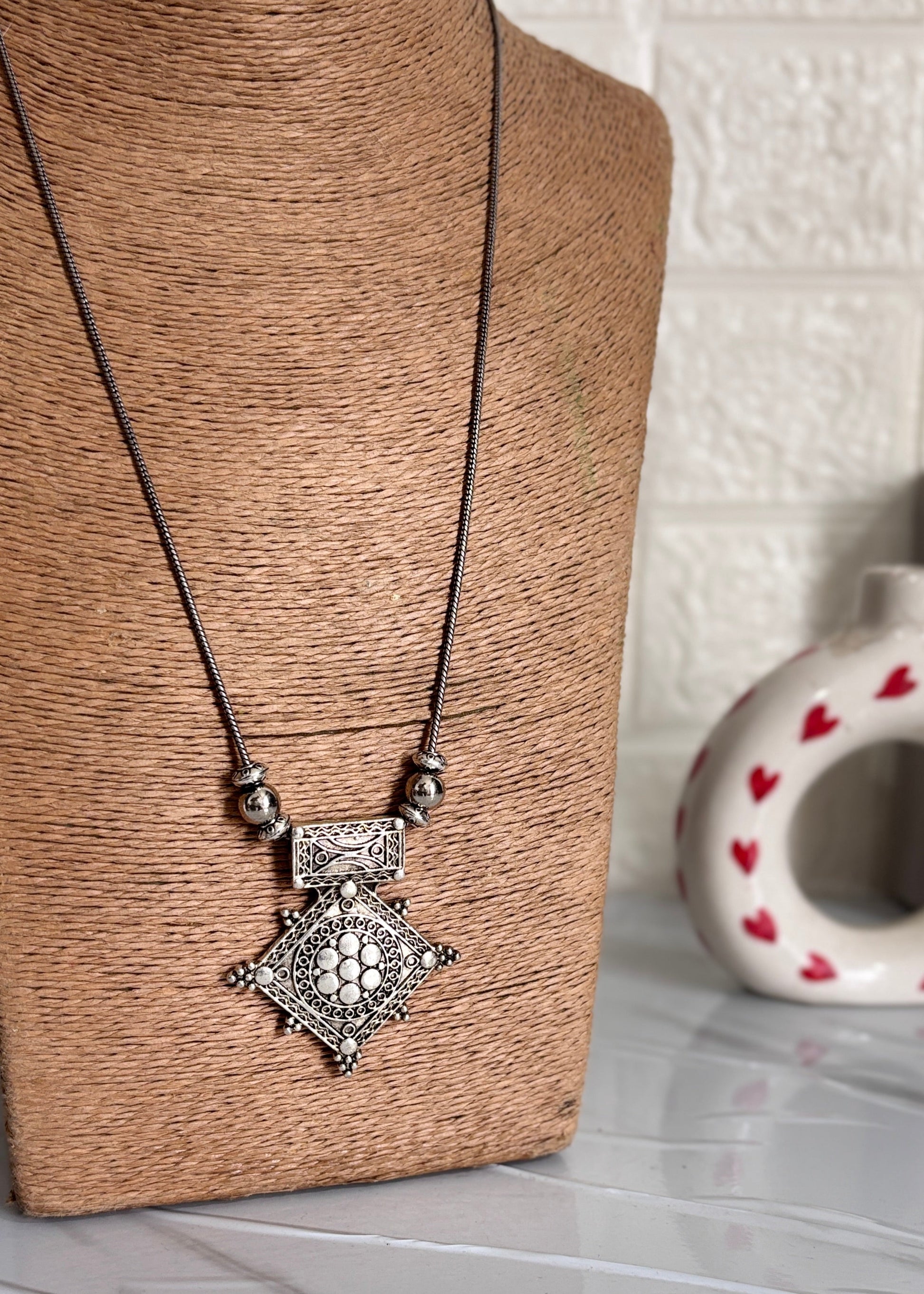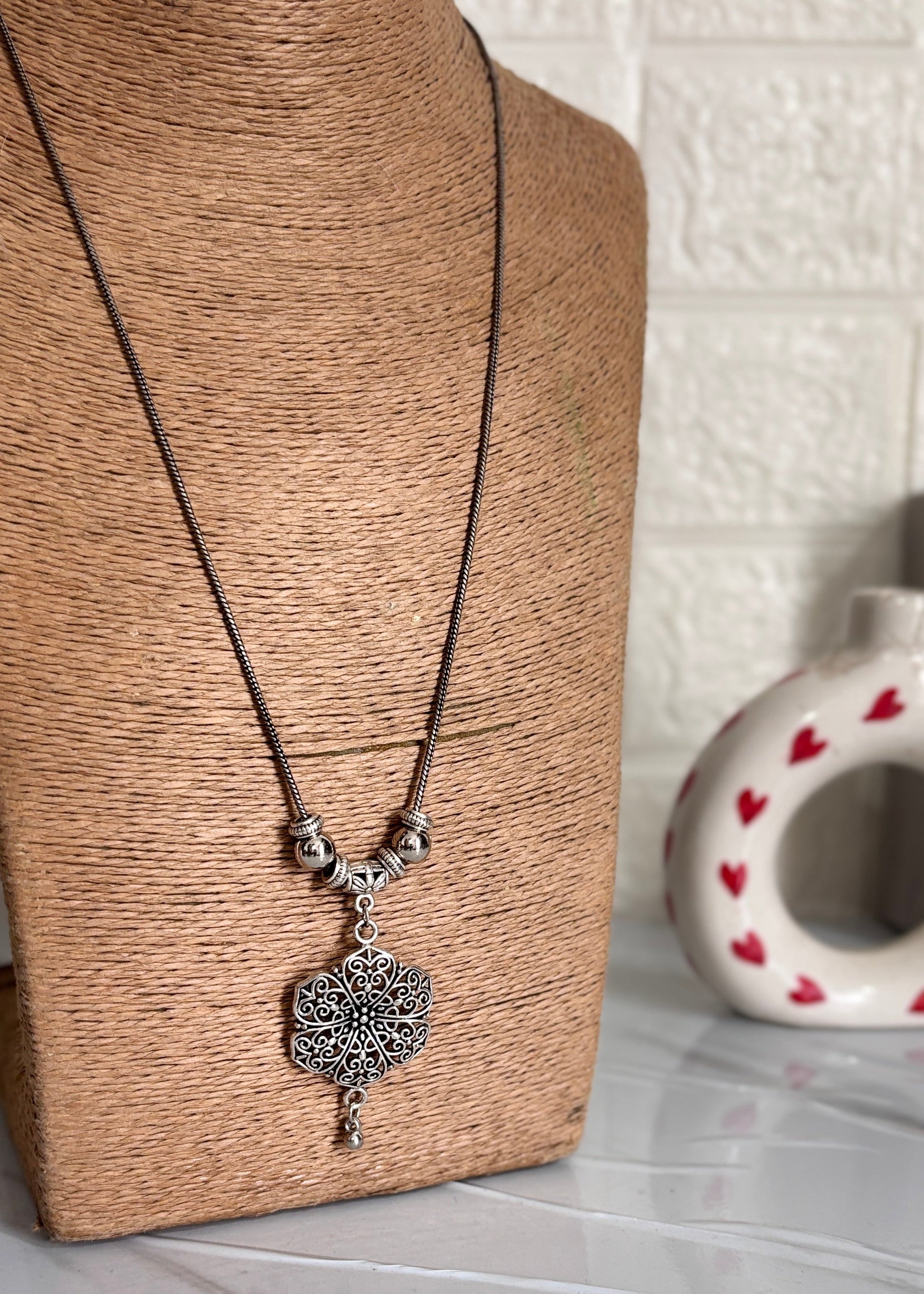 A timeless blend of tradition and everyday charm, our Nazaakat oxidized necklace features a range of intricately crafted pendants—each unique in design yet rooted in the same aesthetic elegance. Strung on a sturdy yet graceful metallic chain, every piece is adorned with antique-finish detailing and delicate silver-toned beads. Whether it's a floral motif or geometric form, each pendant tells its own subtle story.