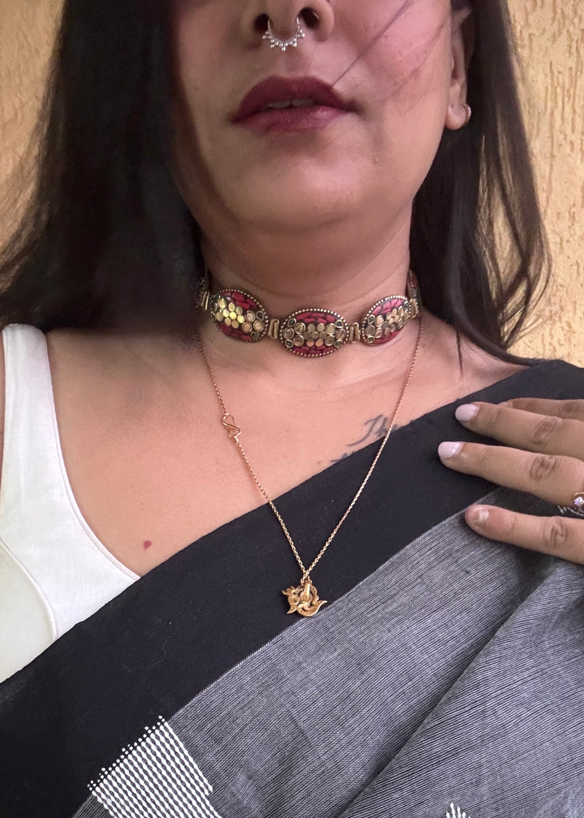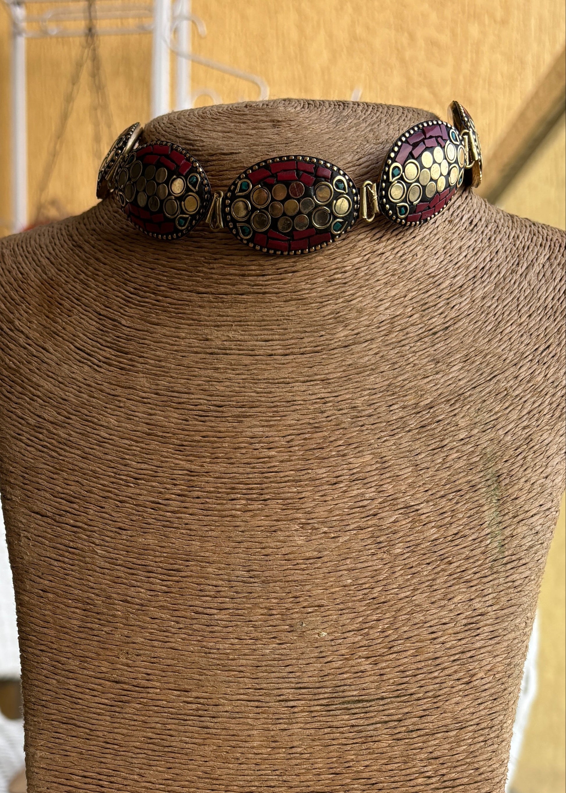 Adorn yourself with the exquisite Gulab Gold Afghani Choker, a masterpiece that combines traditional craftsmanship with contemporary elegance. This statement piece features a stunning interplay of rich red accents against lustrous gold, creating a regal aesthetic perfect for special occasions. Each intricate detail reflects authentic Afghani artistry, elevating any ensemble with its sophisticated charm.