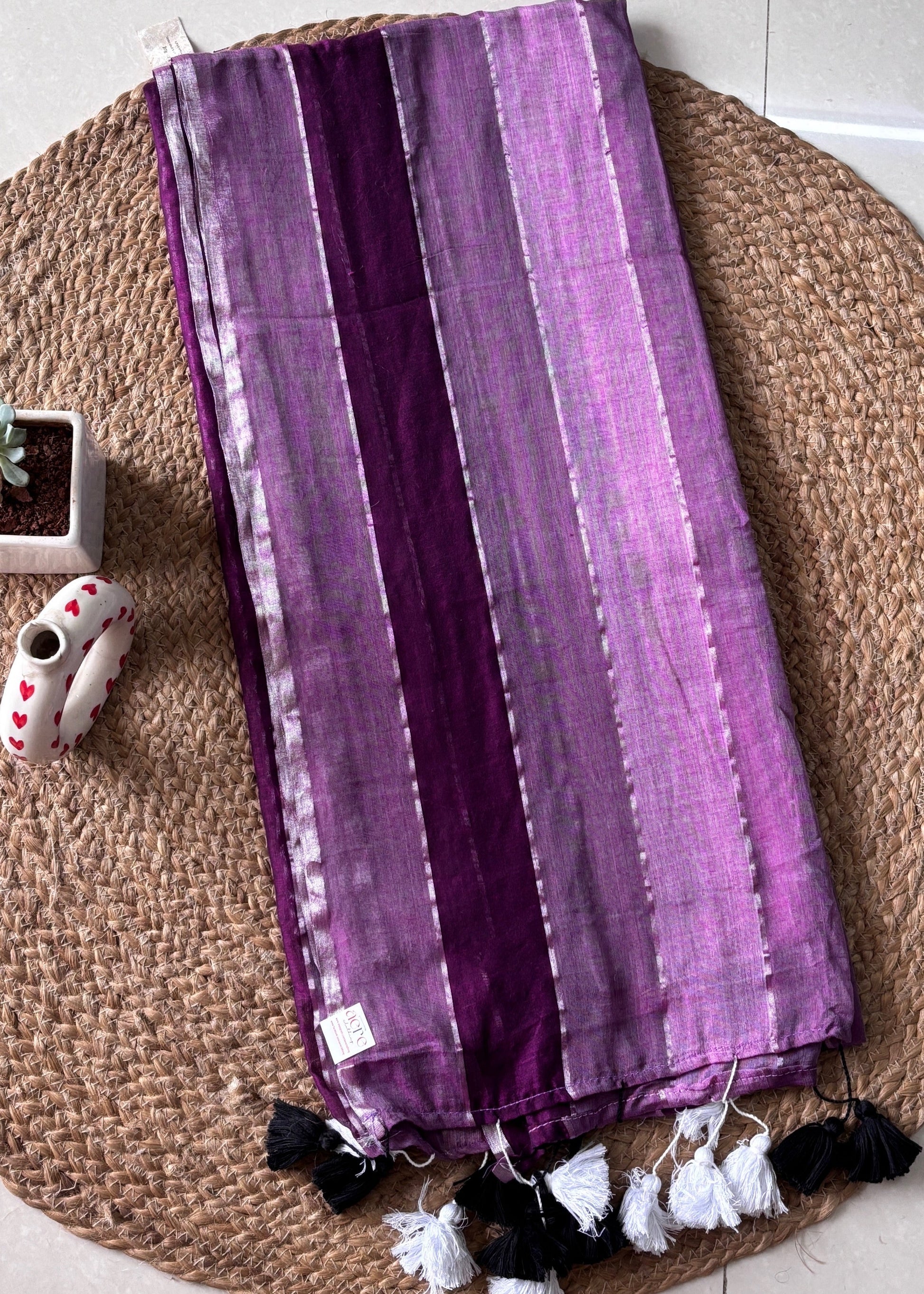 The Neelanjana Mul Cotton Saree features elegant stripes in lavender purple and light purple, separated by intricate zari detailing and accented with delicate pompoms. Crafted from breathable mul cotton, this saree offers a refined blend of comfort and sophistication, perfect for graceful occasions.