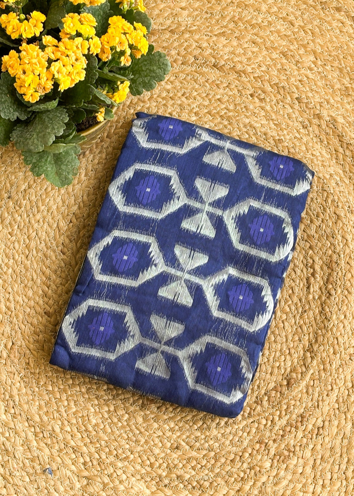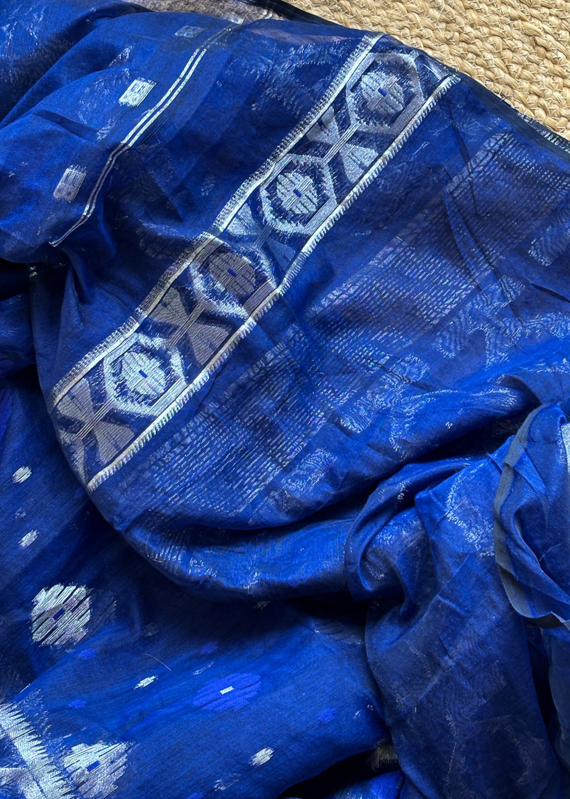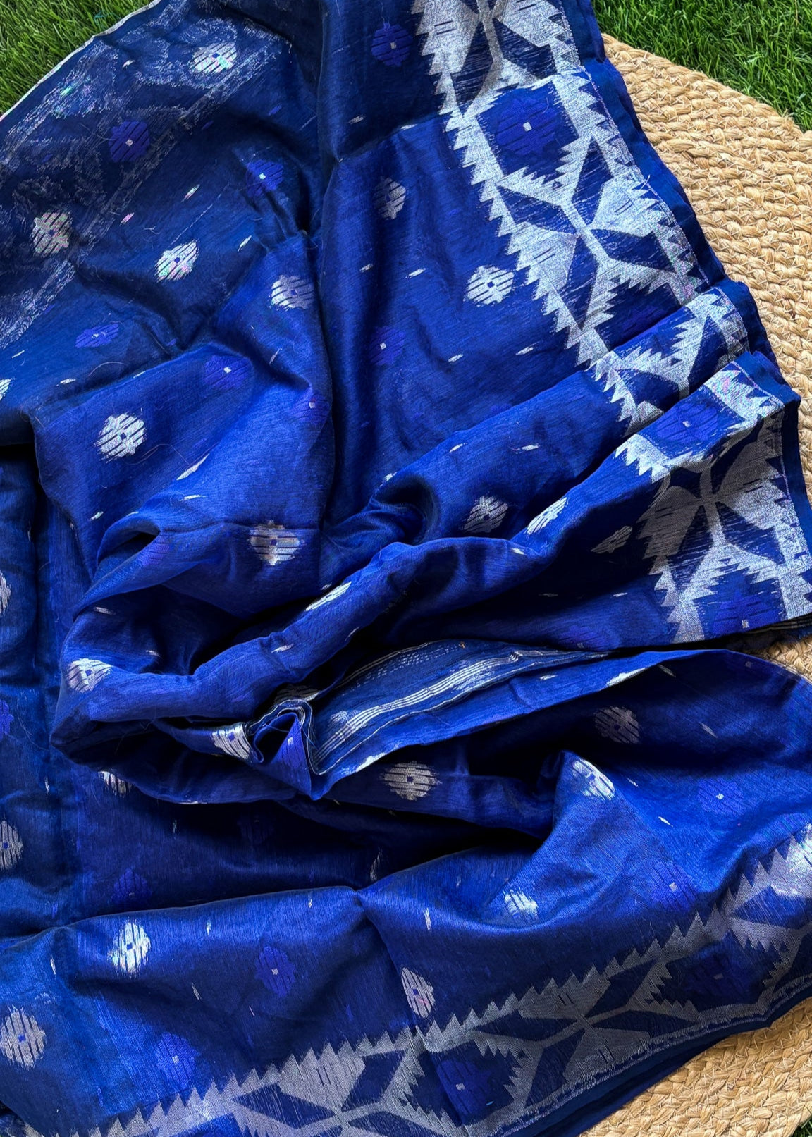 A stunning handwoven Jamdani saree in a rich royal blue base, beautifully adorned with intricate geometric and floral-inspired motifs in white and silver zari. The contrasting pallu with delicate dot patterns and a classic striped border adds a timeless elegance. Perfect for festive occasions and traditional celebrations, this saree reflects the heritage of fine craftsmanship blended with a modern aesthetic.