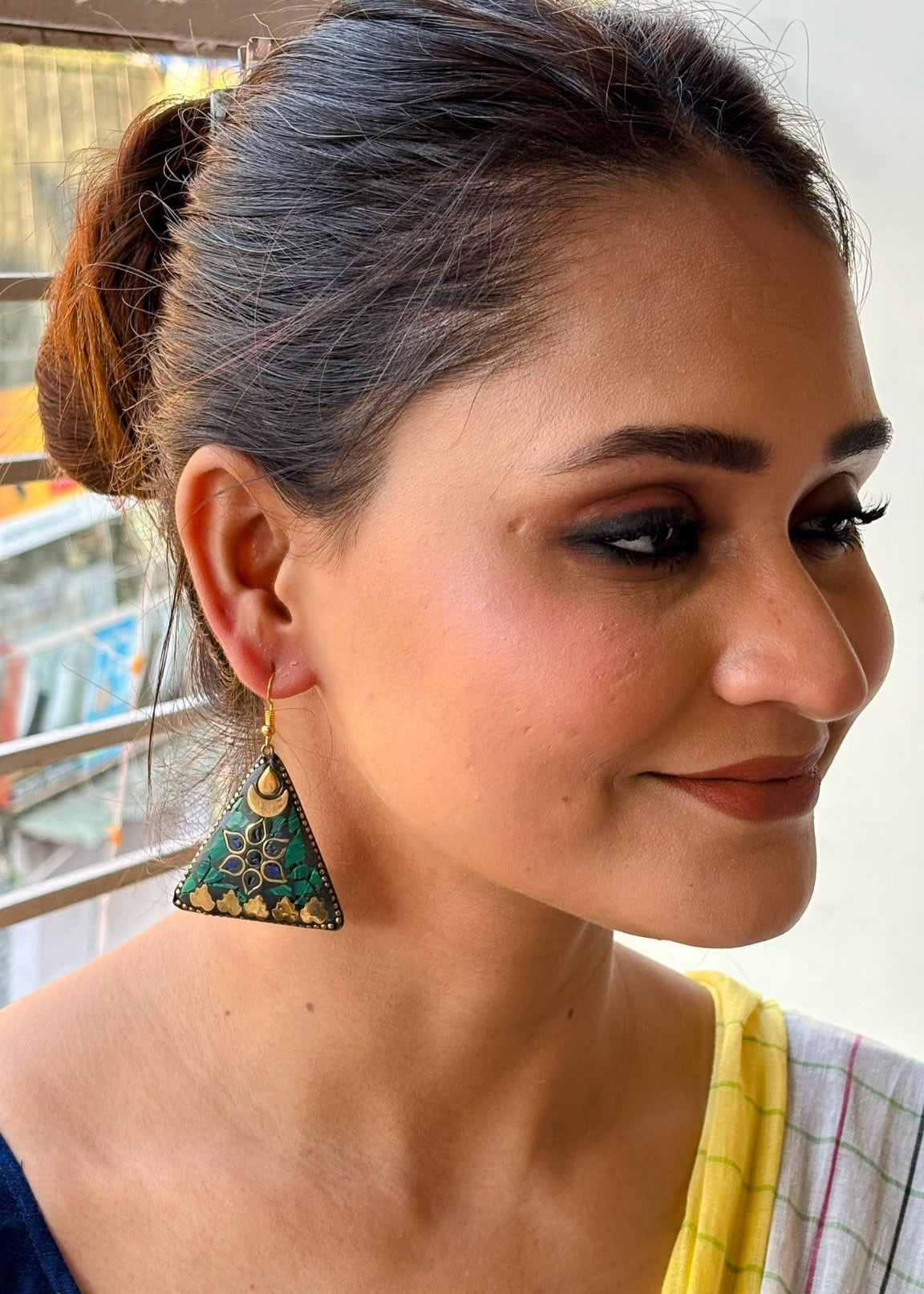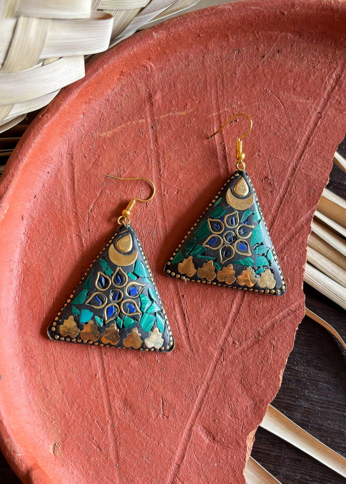 A striking pair of triangular Afghani earrings crafted with traditional charm. The bold black base is adorned with intricate golden motifs, peacock-blue teardrop inlays, and emerald-green accents, reflecting the vibrancy of Afghan artistry. The crescent moon detail at the top adds a celestial touch, while the golden floral row at the base balances elegance with heritage. Statement-making yet earthy, these earrings are perfect for adding a touch of folk tradition to your contemporary look.