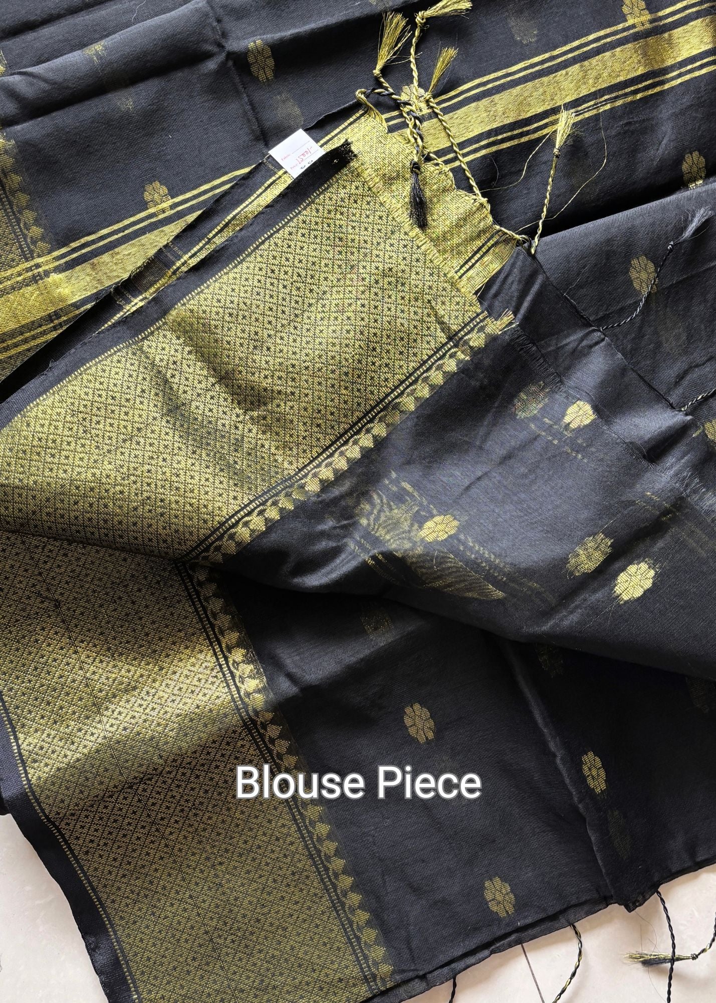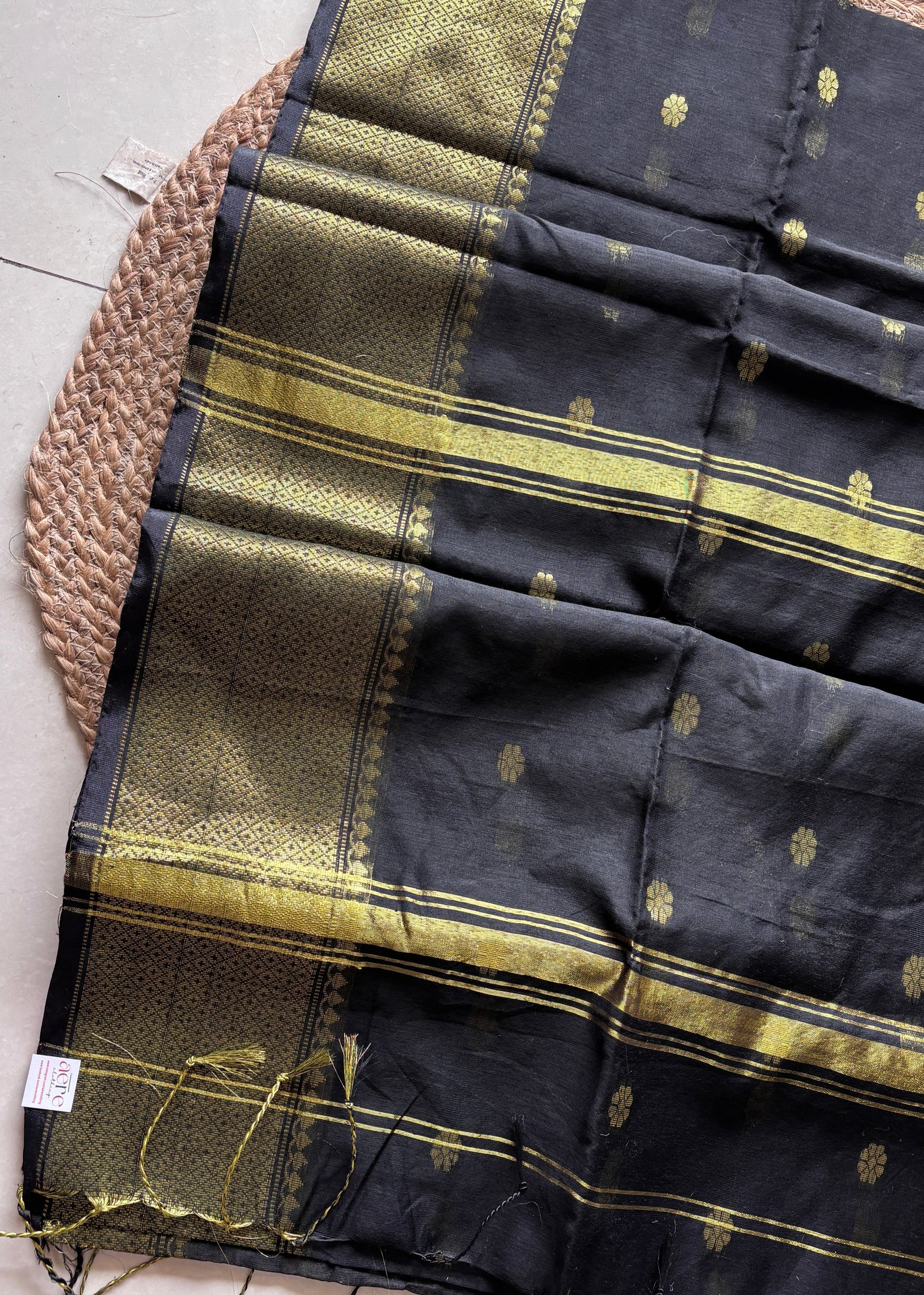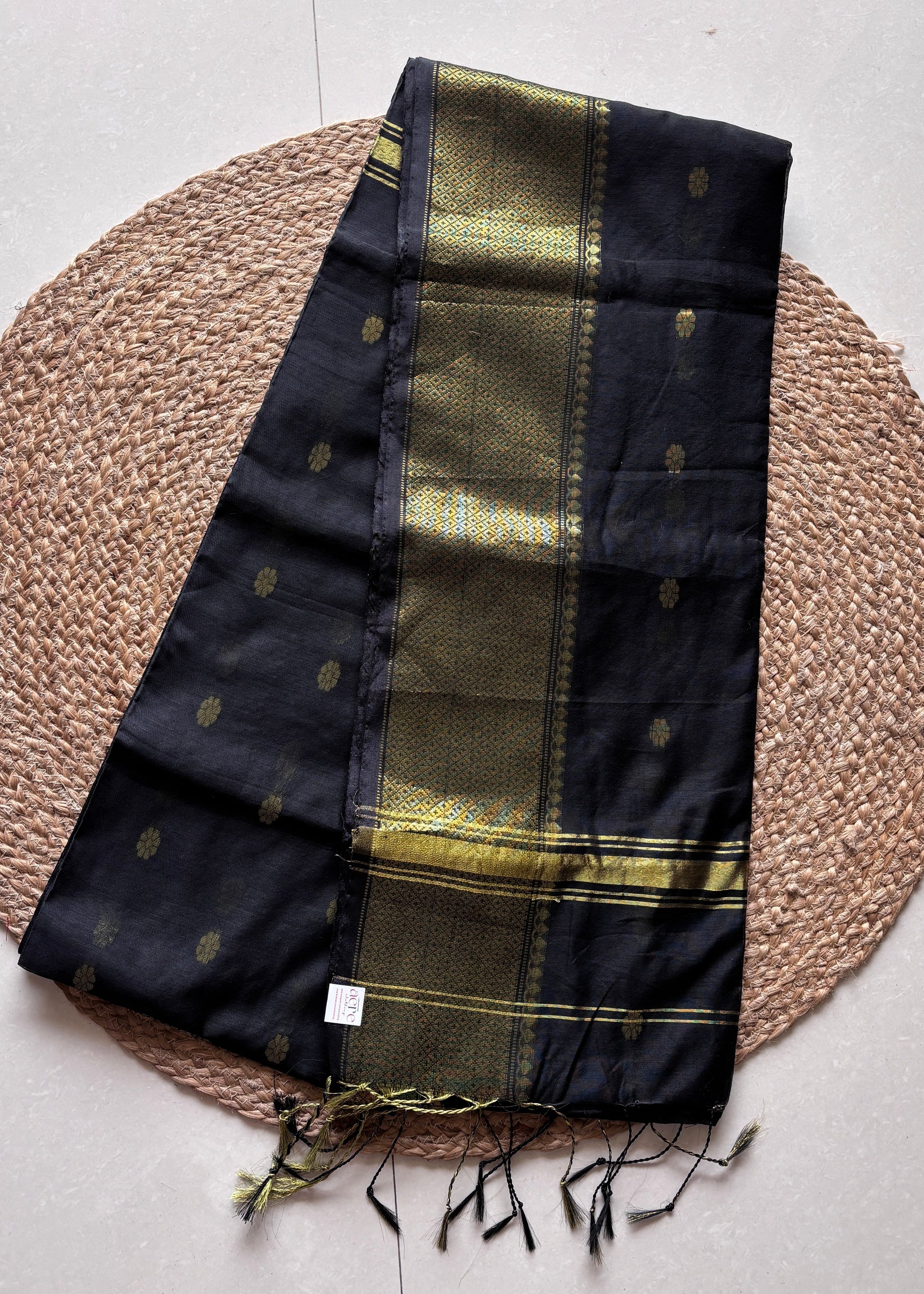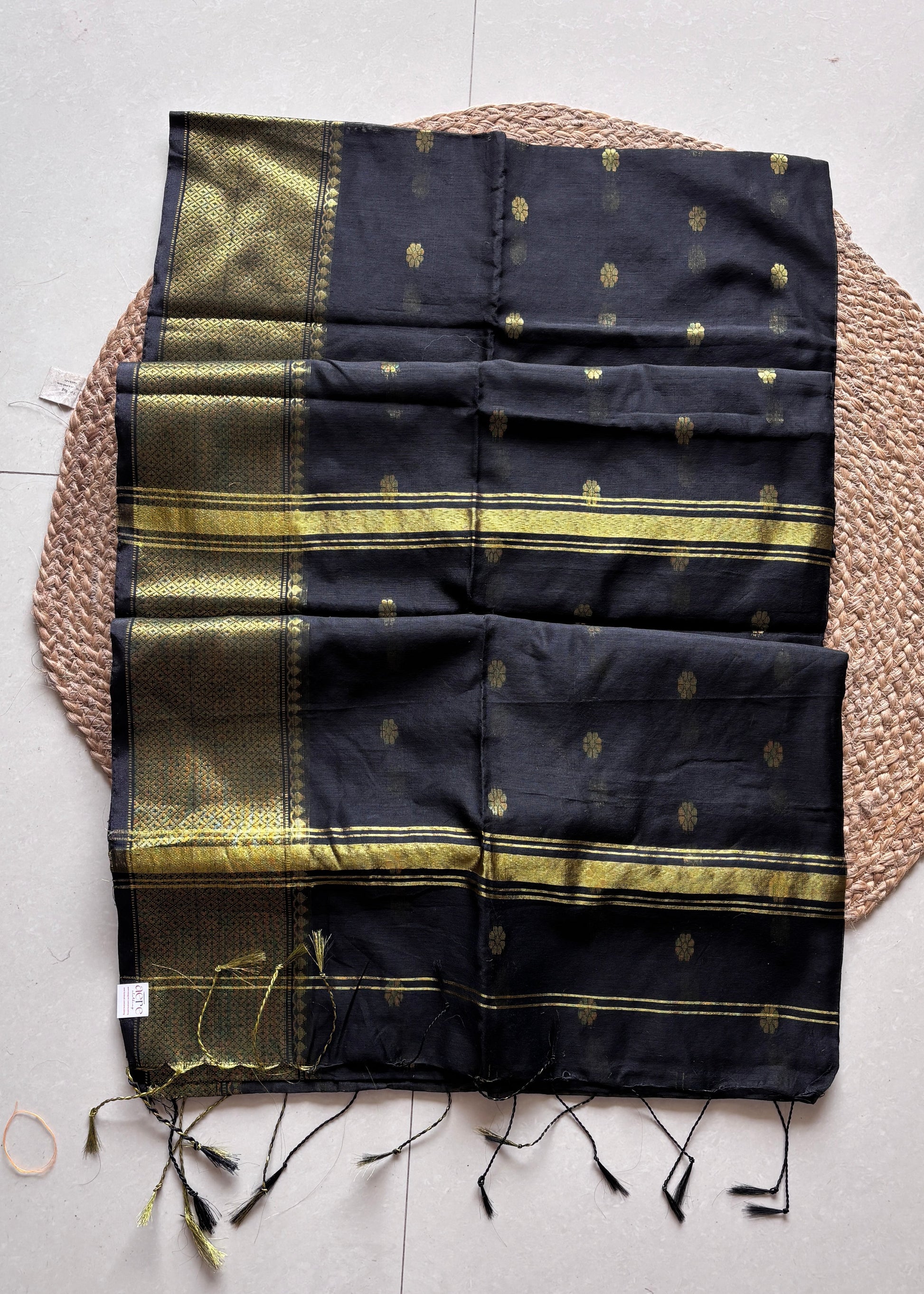 Experience timeless elegance with the Noorvastra Black saree, crafted from luxurious Maheshwari cotton silk. Its deep black fabric is beautifully adorned with delicate golden buta motifs throughout, complemented by a striking thick golden border that adds a regal touch. Perfect for special occasions, this saree combines traditional craftsmanship with sophisticated style, ensuring you stand out with grace and poise.