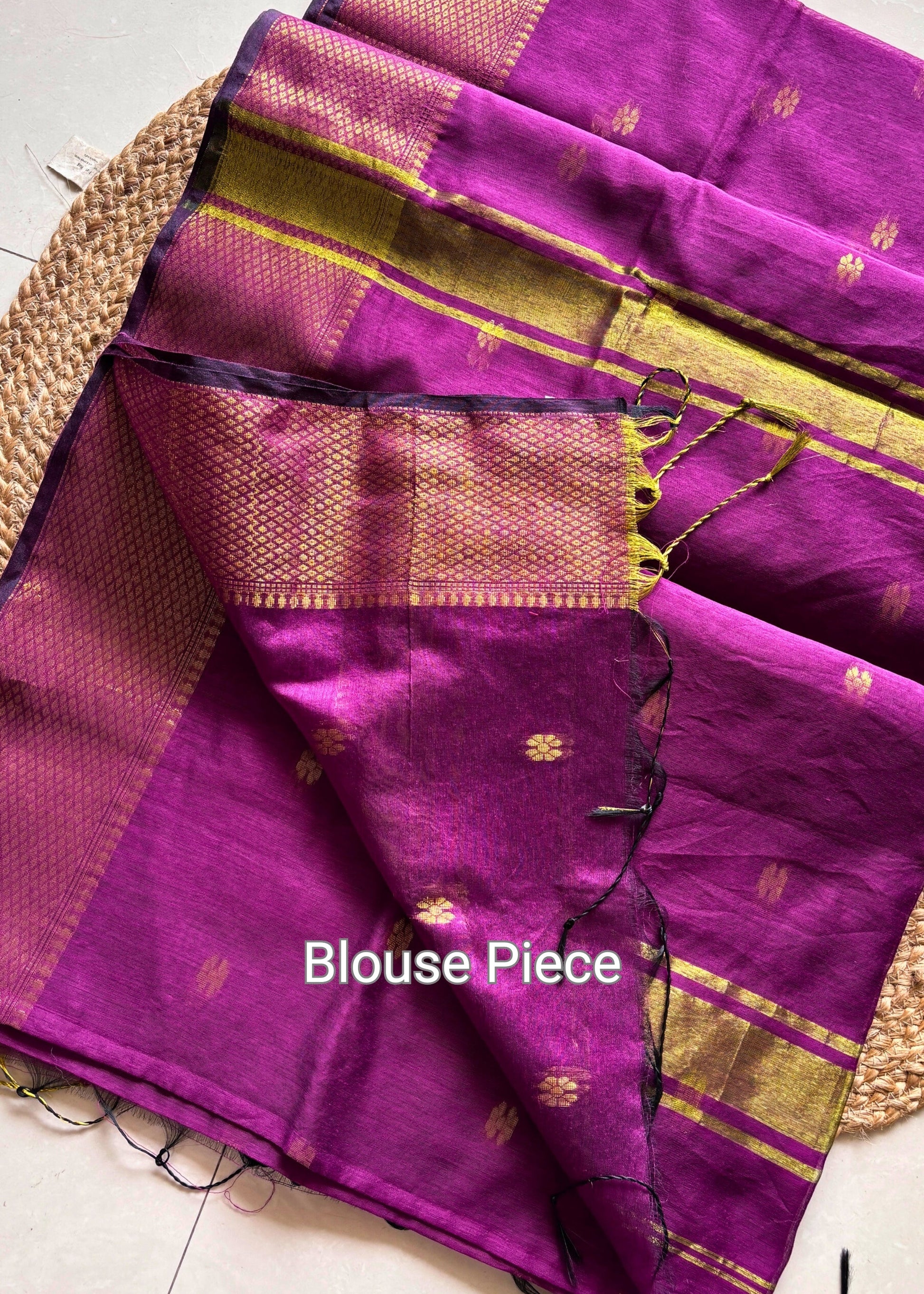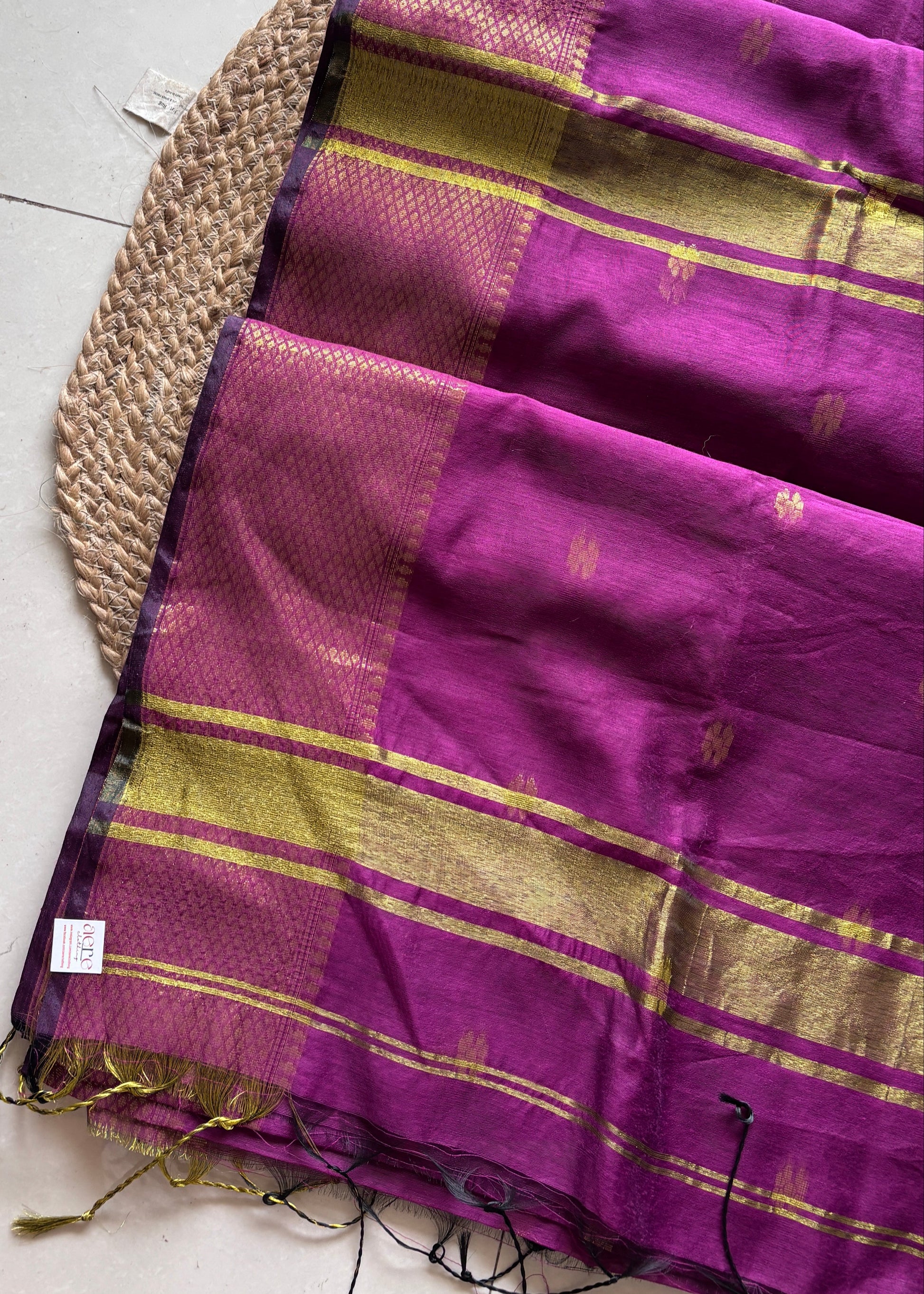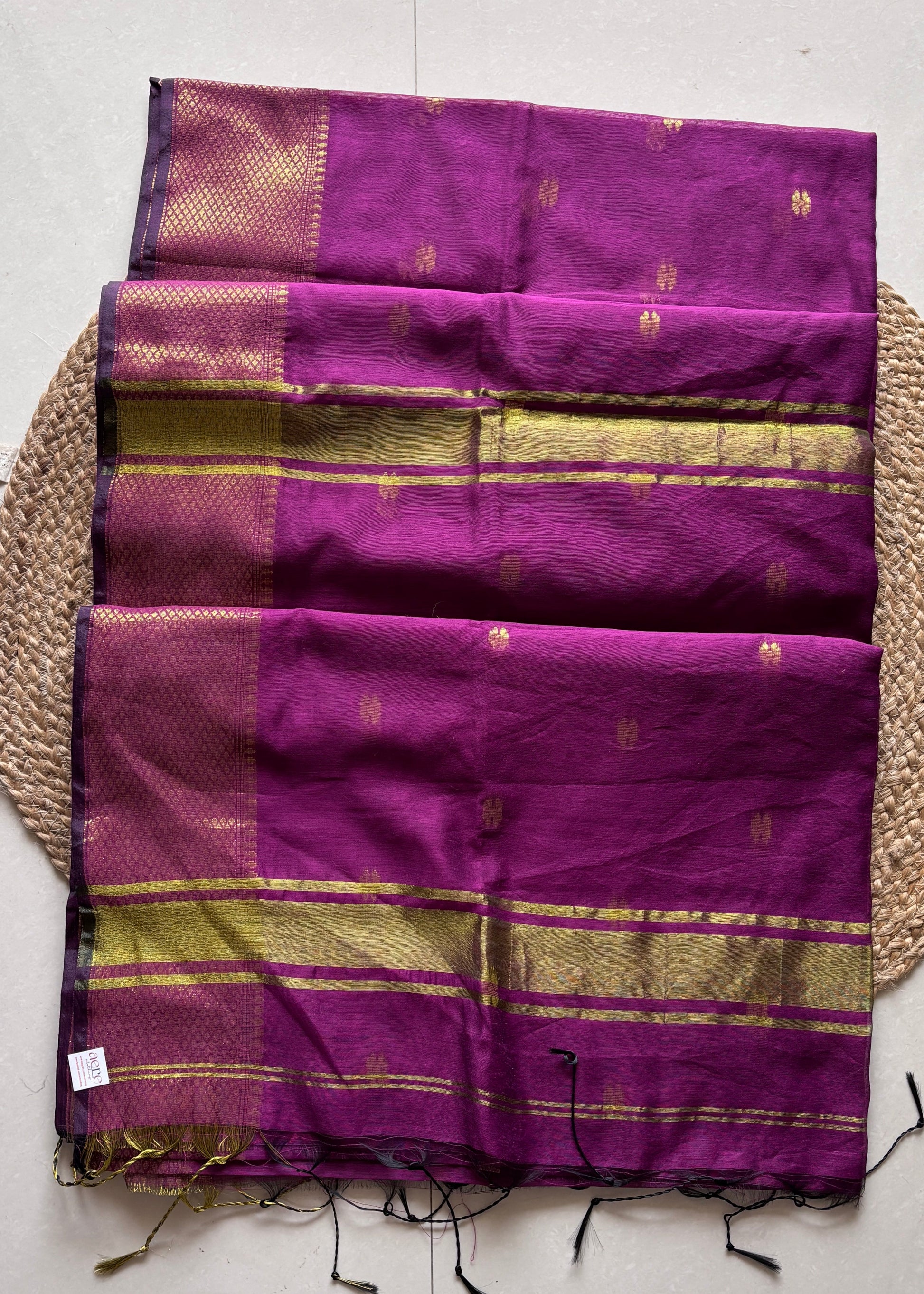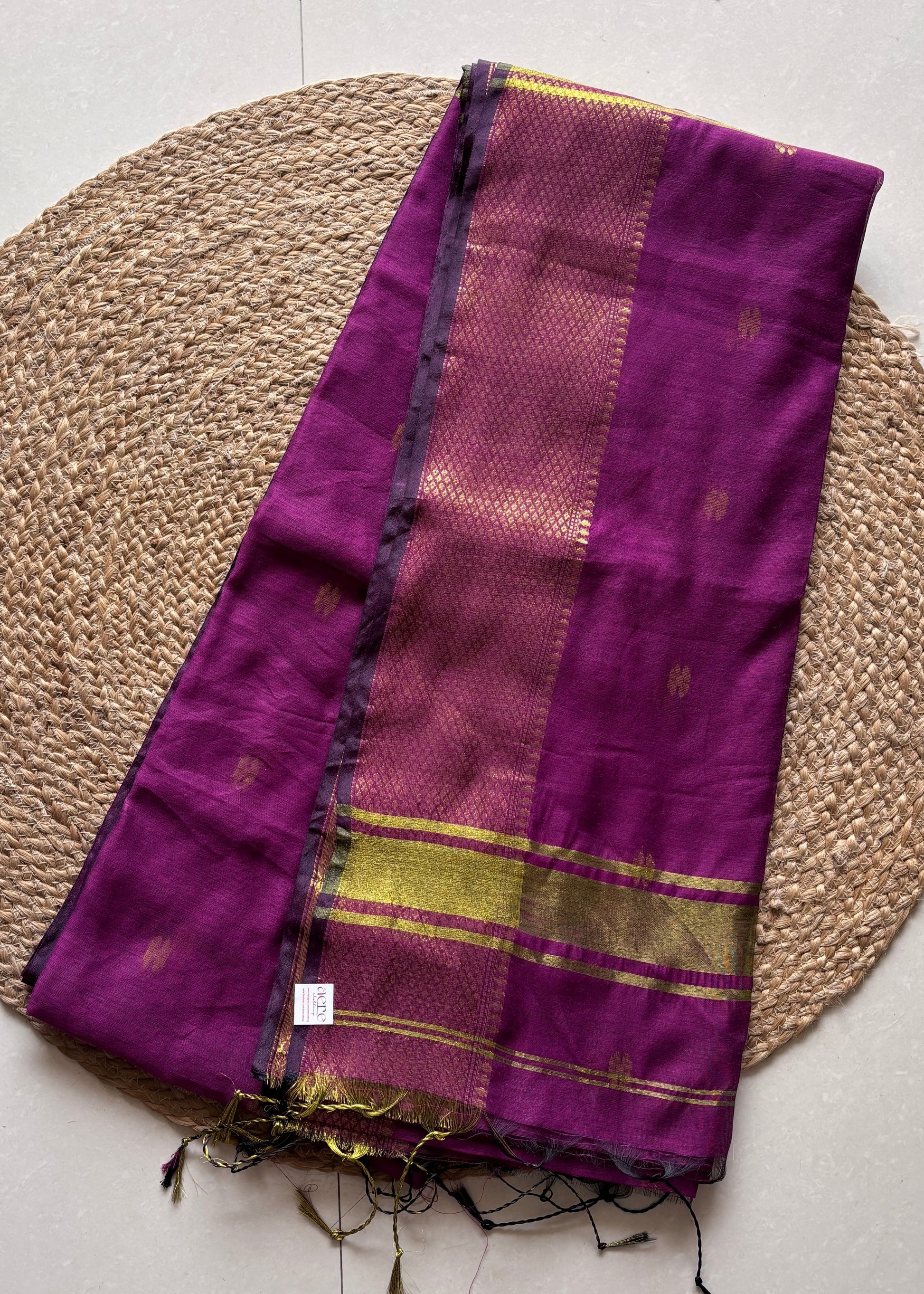 Celebrate timeless sophistication with the Noorvastra Wine saree, woven from luxurious Maheshwari cotton silk. The rich wine-colored fabric features delicate golden buta motifs throughout, complemented by a prominent thick golden border that exudes regal elegance. Ideal for special occasions, this saree blends traditional craftsmanship with refined style, ensuring you carry yourself with poise and distinction.
