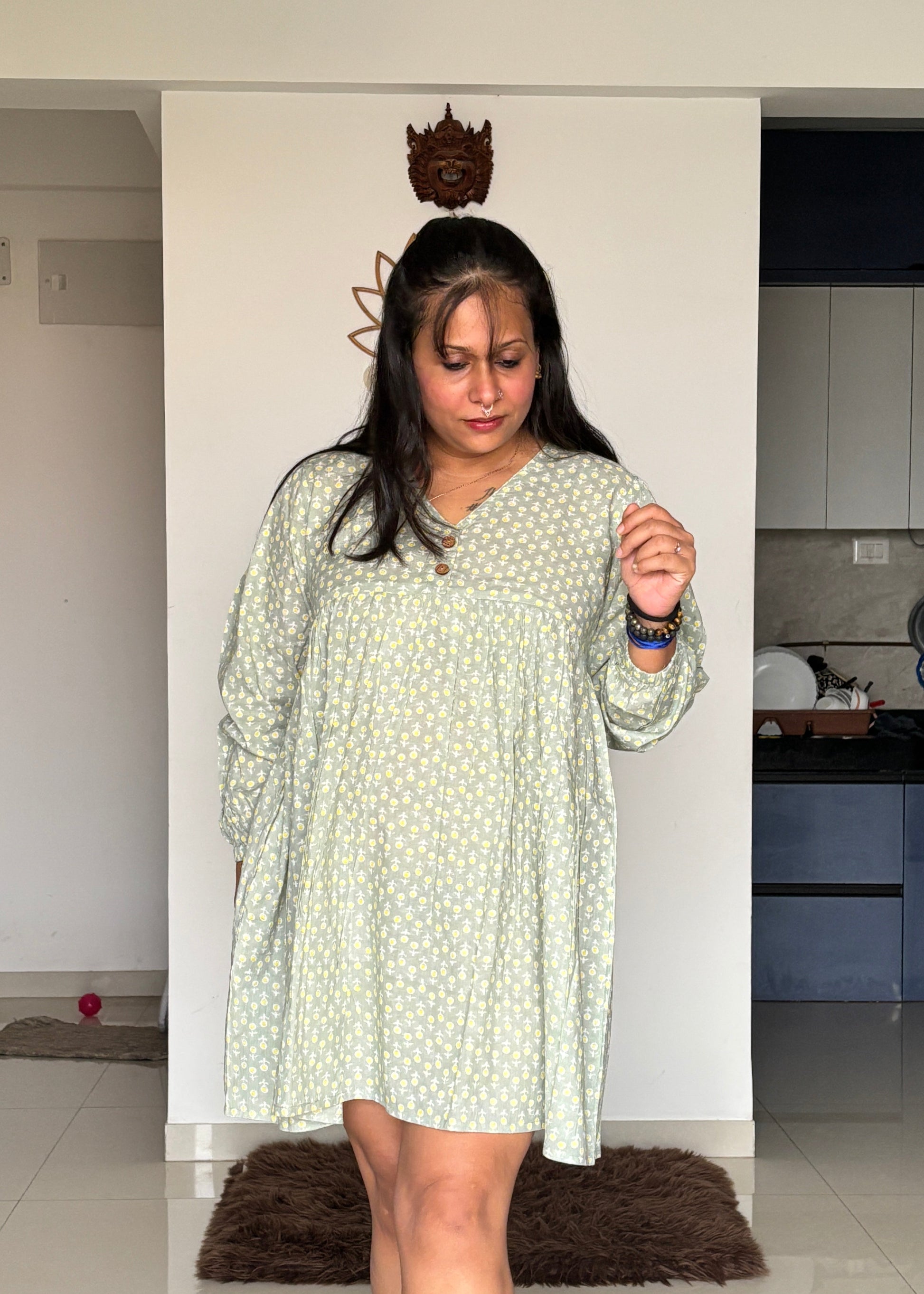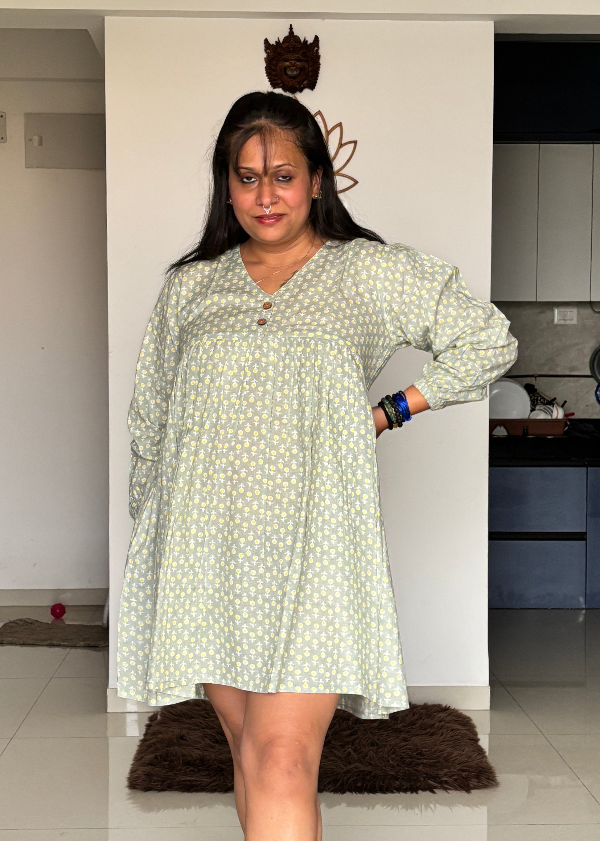 Experience effortless elegance with our Mini Blossom Balloon Dress. This sophisticated knee-length cotton garment features a flattering antifit silhouette with full sleeves and convenient pockets. Perfect for those who appreciate refined comfort with a touch of contemporary flair.