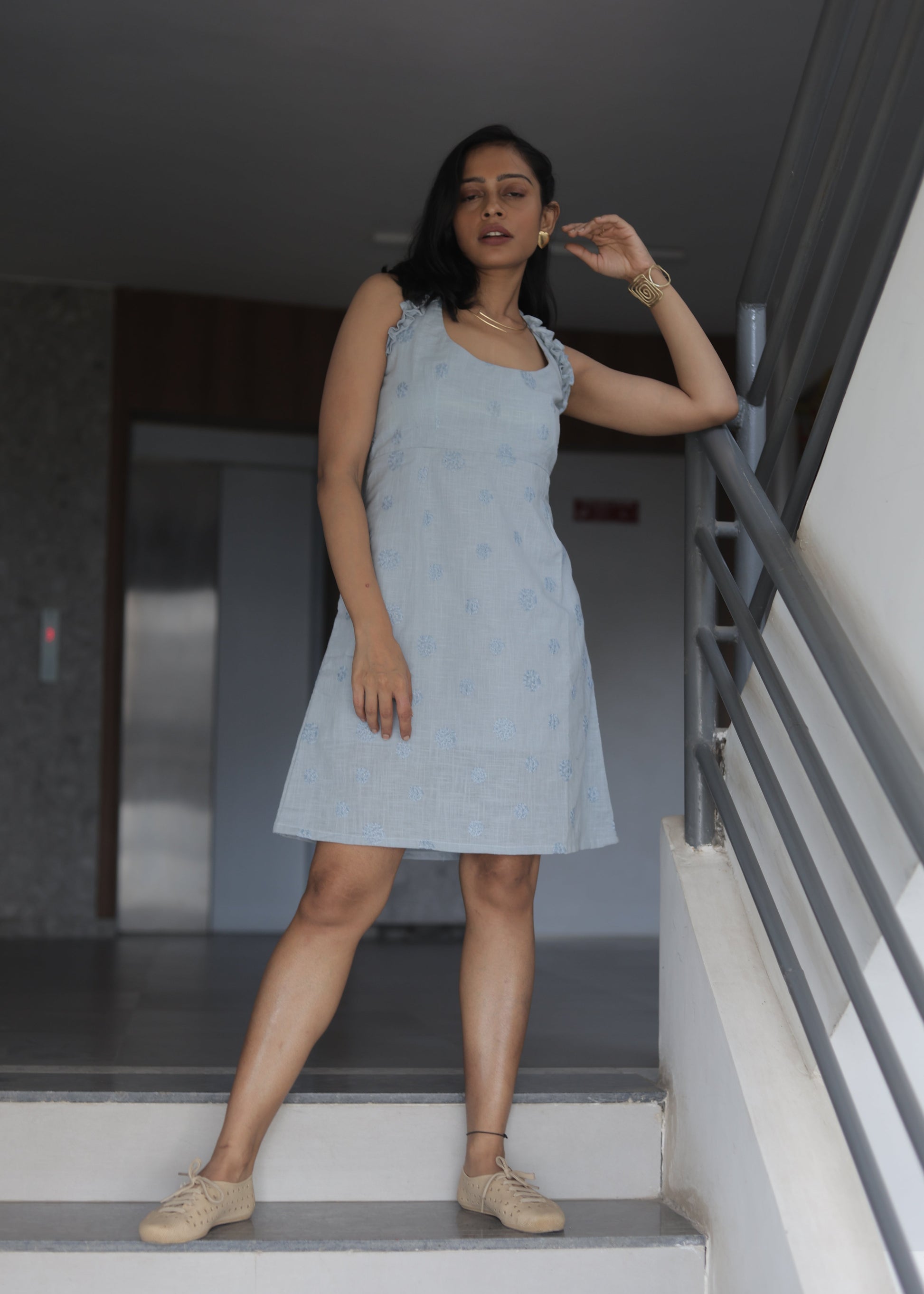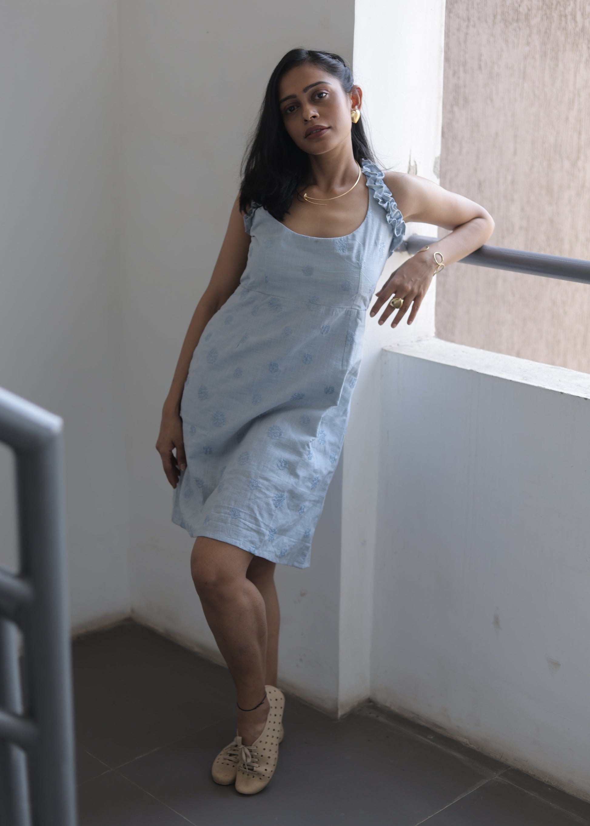 Embrace effortless elegance with our Sand Mist Women Dress in captivating rust blue. This sophisticated knee-length silhouette features delicate embroidery and beautiful frilled sleeves that create a graceful profile. Thoughtfully designed with convenient pockets, this sleeveless dress transitions seamlessly from day to evening affairs, offering both refined style and practical comfort.