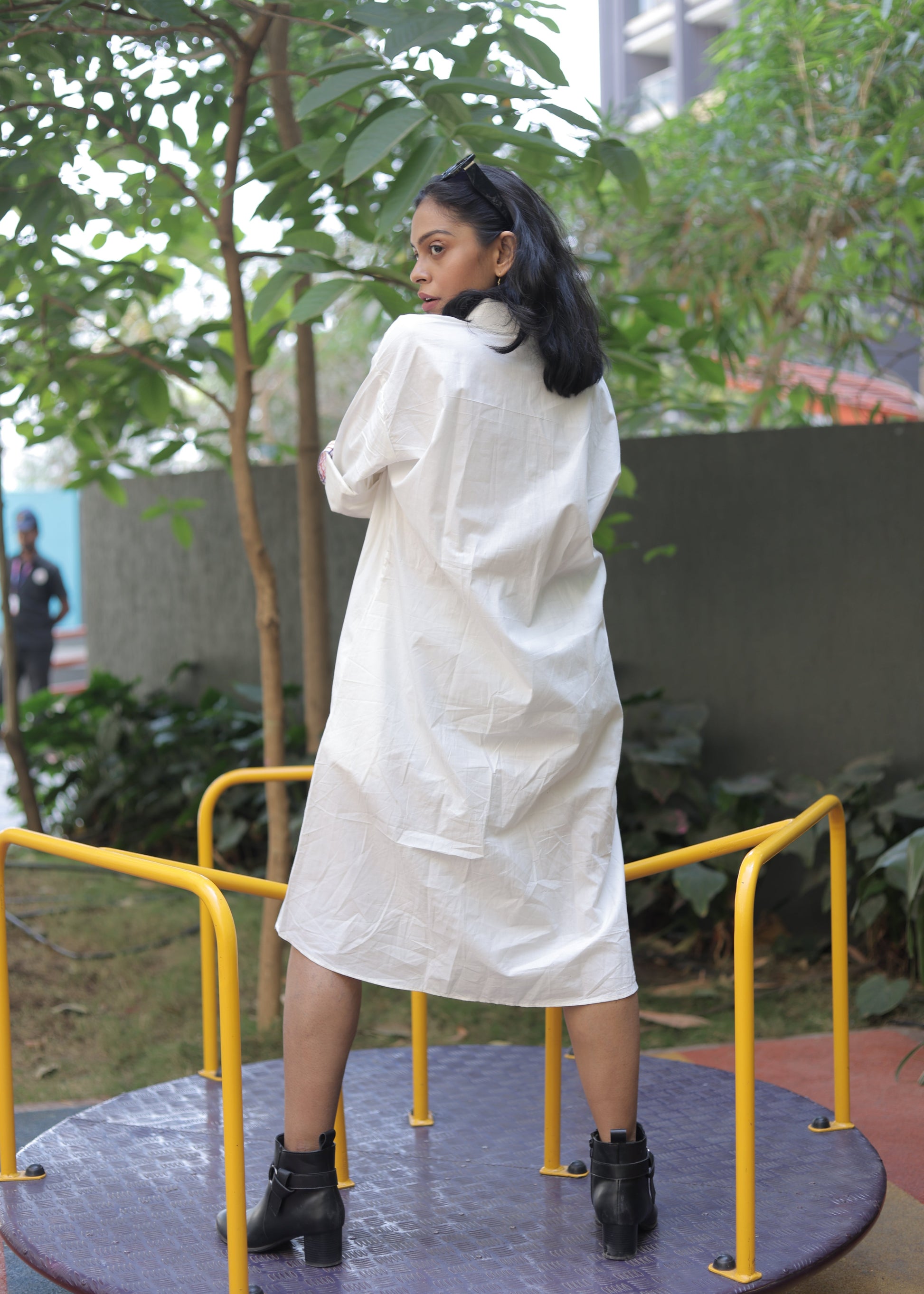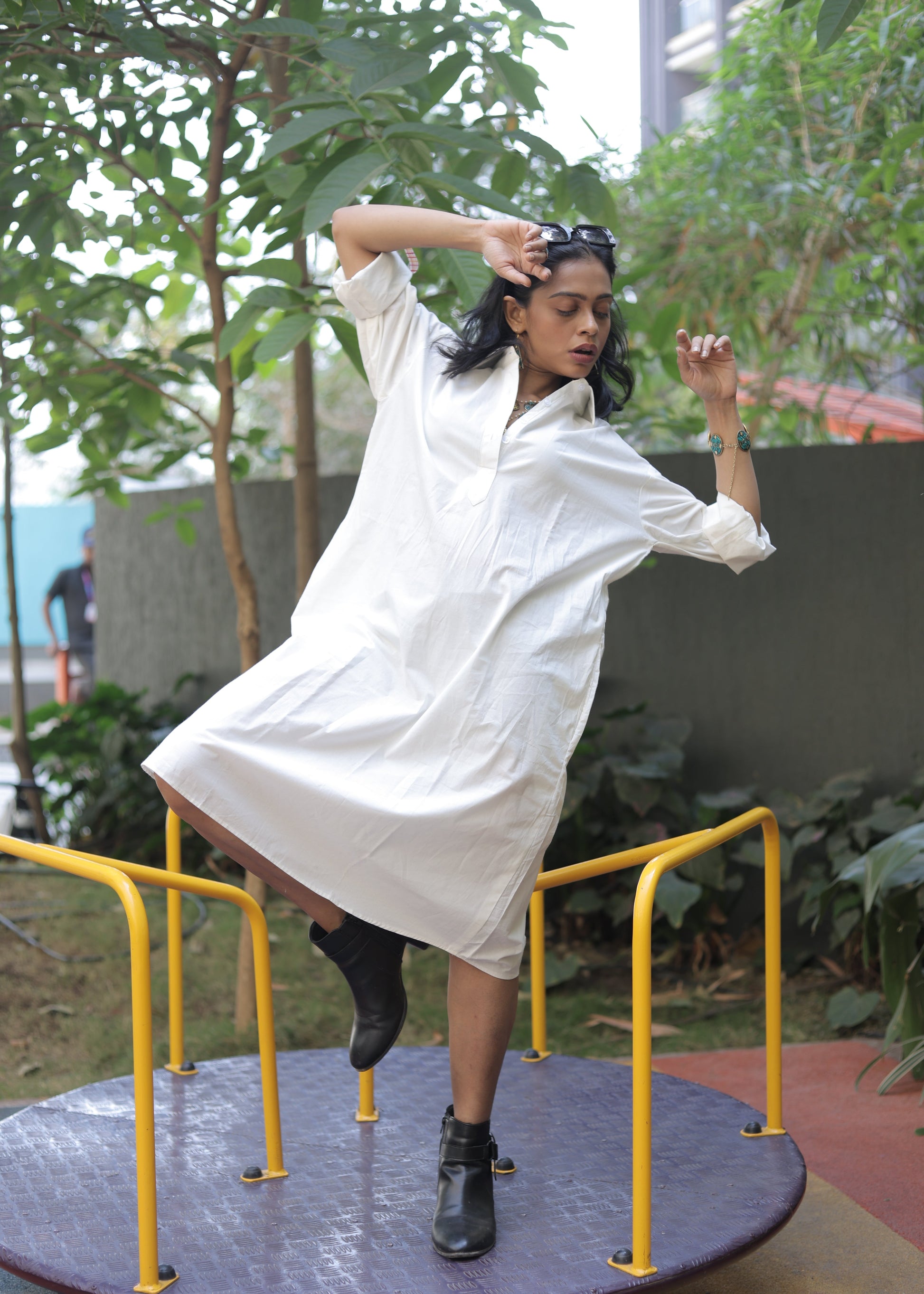 Immerse yourself in refined elegance with The White Code Shirt Dress. This knee-length white garment exemplifies sophisticated simplicity while offering a thoughtful design detail—foldable sleeves with distinctive colored locks that secure when rolled. The matching accent pocket completes this understated yet distinguished piece, perfect for the discerning individual who appreciates subtle sartorial statements.
