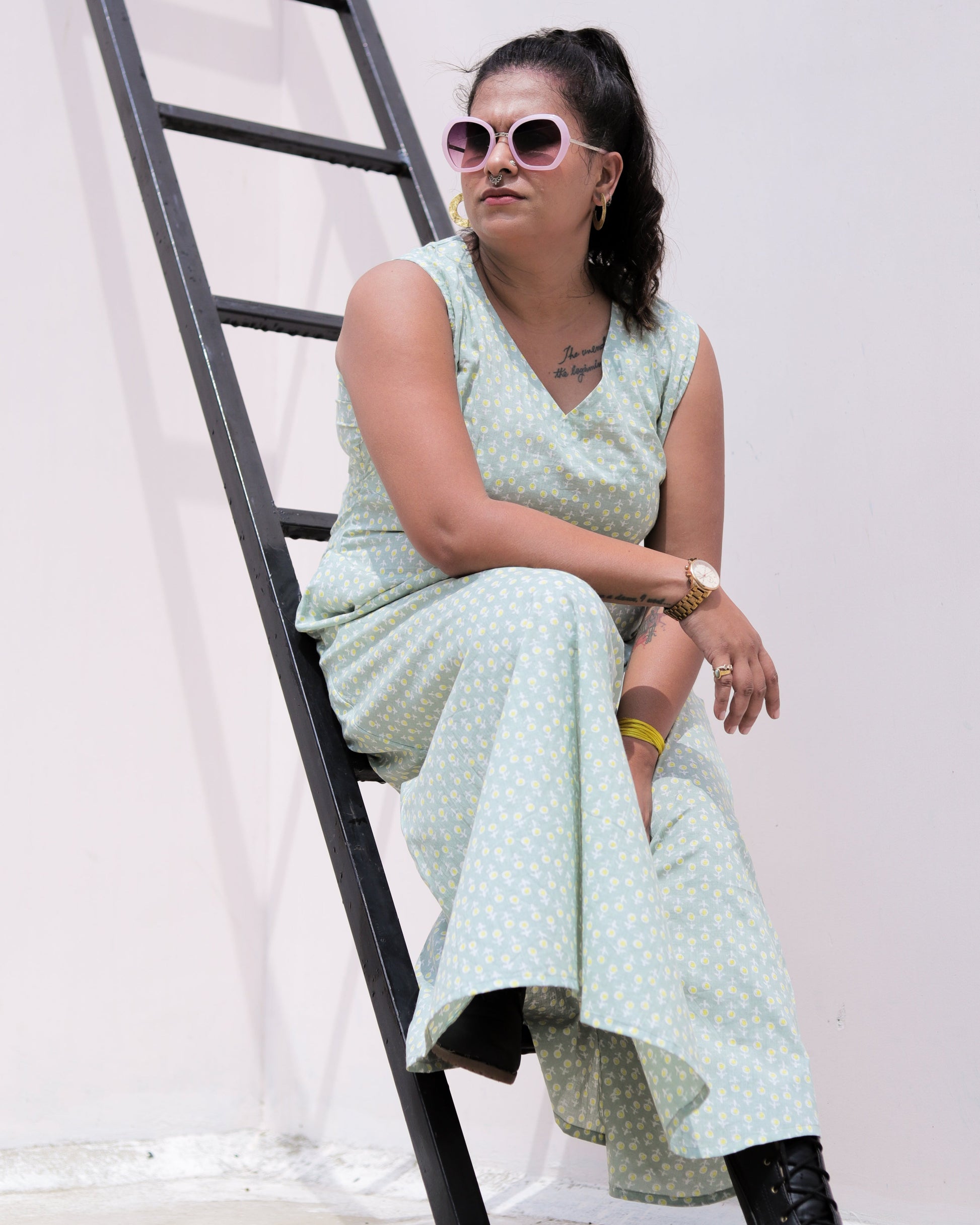 Elevate your wardrobe with our Mini Blossom Dress, a refined sleeveless design crafted from pure cotton. This sophisticated ankle-length silhouette features convenient pockets for practical elegance. The breathable cotton fabric ensures comfort throughout the day while maintaining a polished appearance for any occasion.
