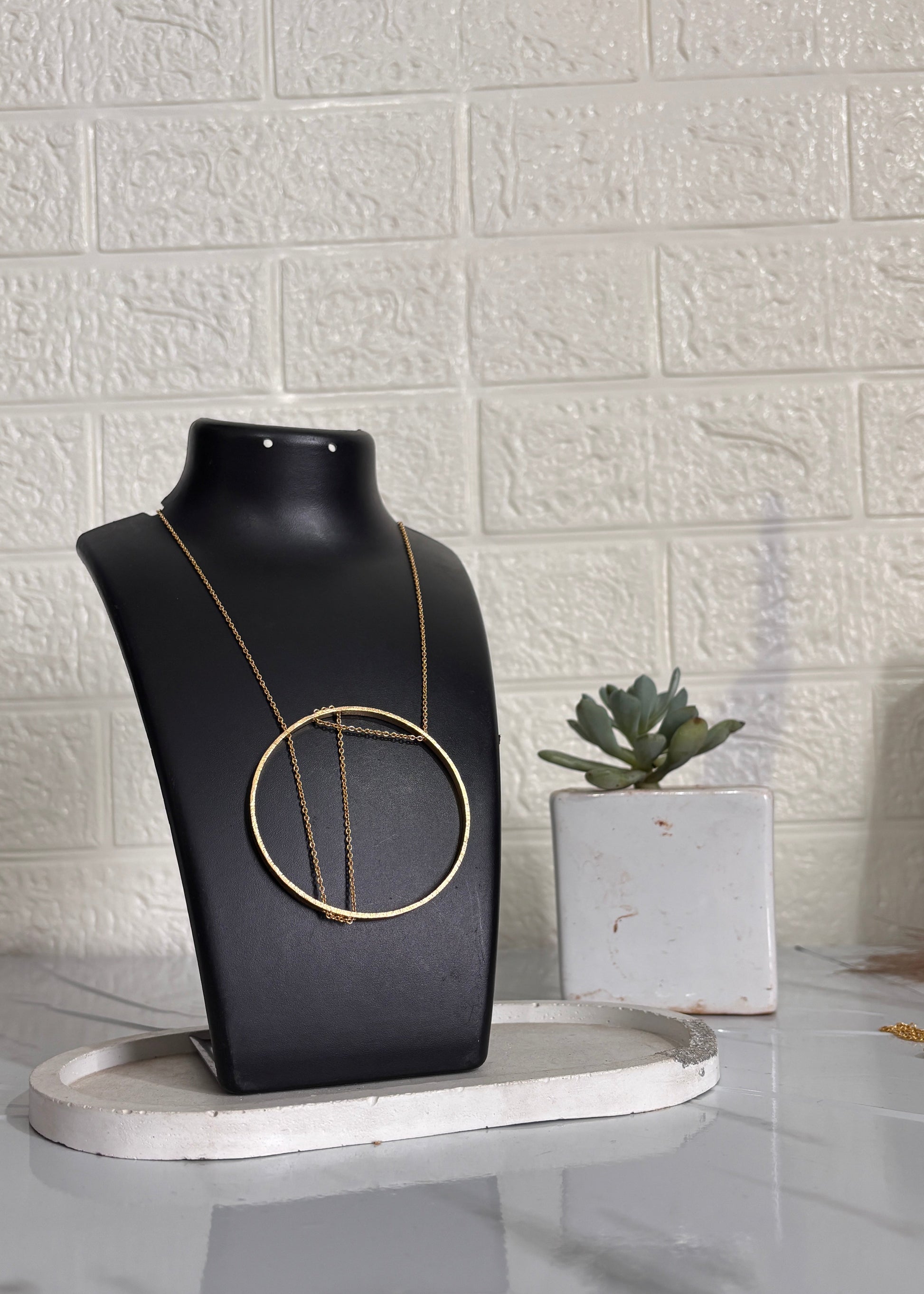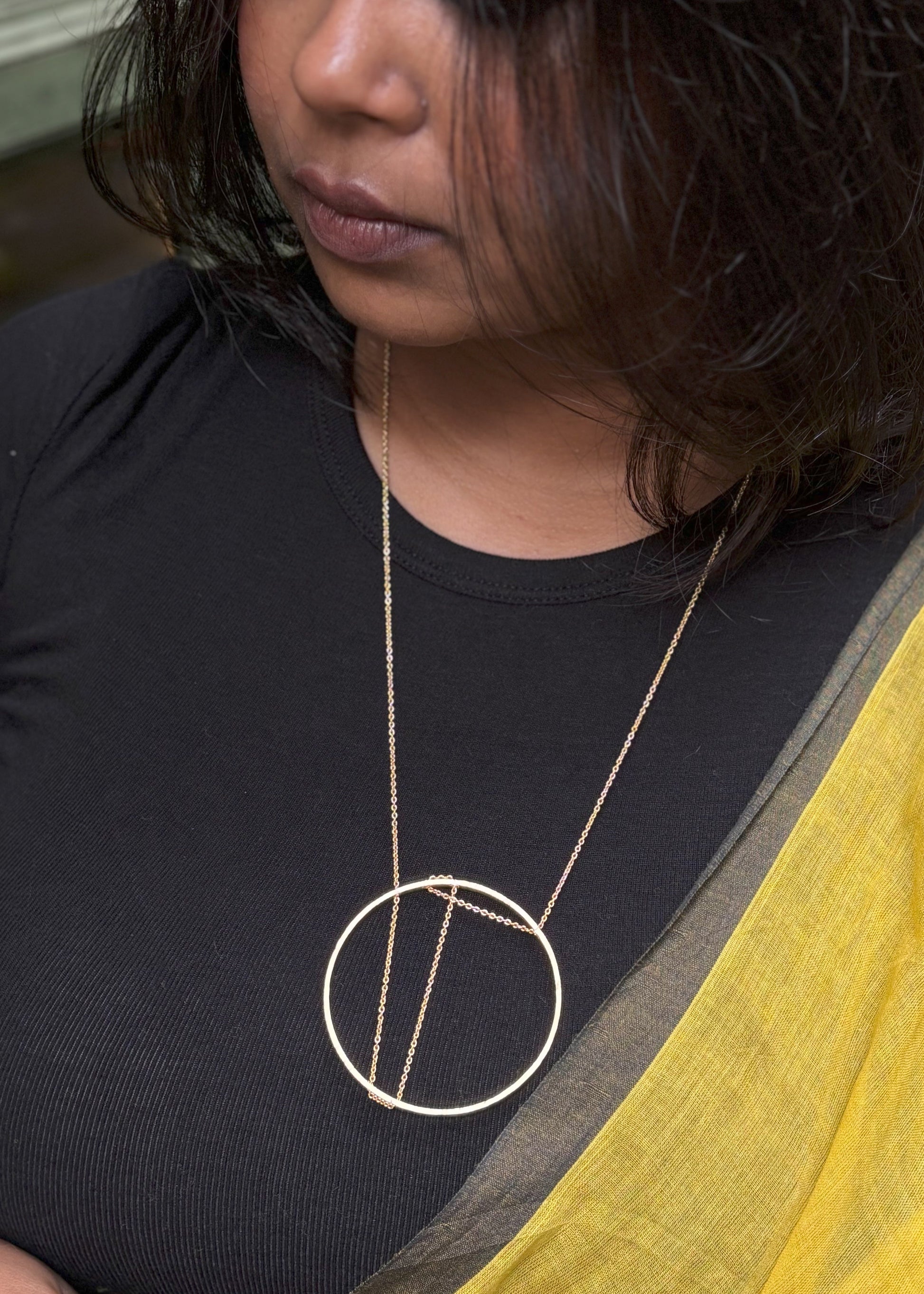 Where minimalism meets motion. Orbit is a handcrafted brass neckpiece designed around the power of curves and clean lines. The golden circle paired with delicate drapes of chain creates a soft geometric drama — versatile enough for a white shirt or a deep saree blouse. Simple, yet makes a statement every single time.
